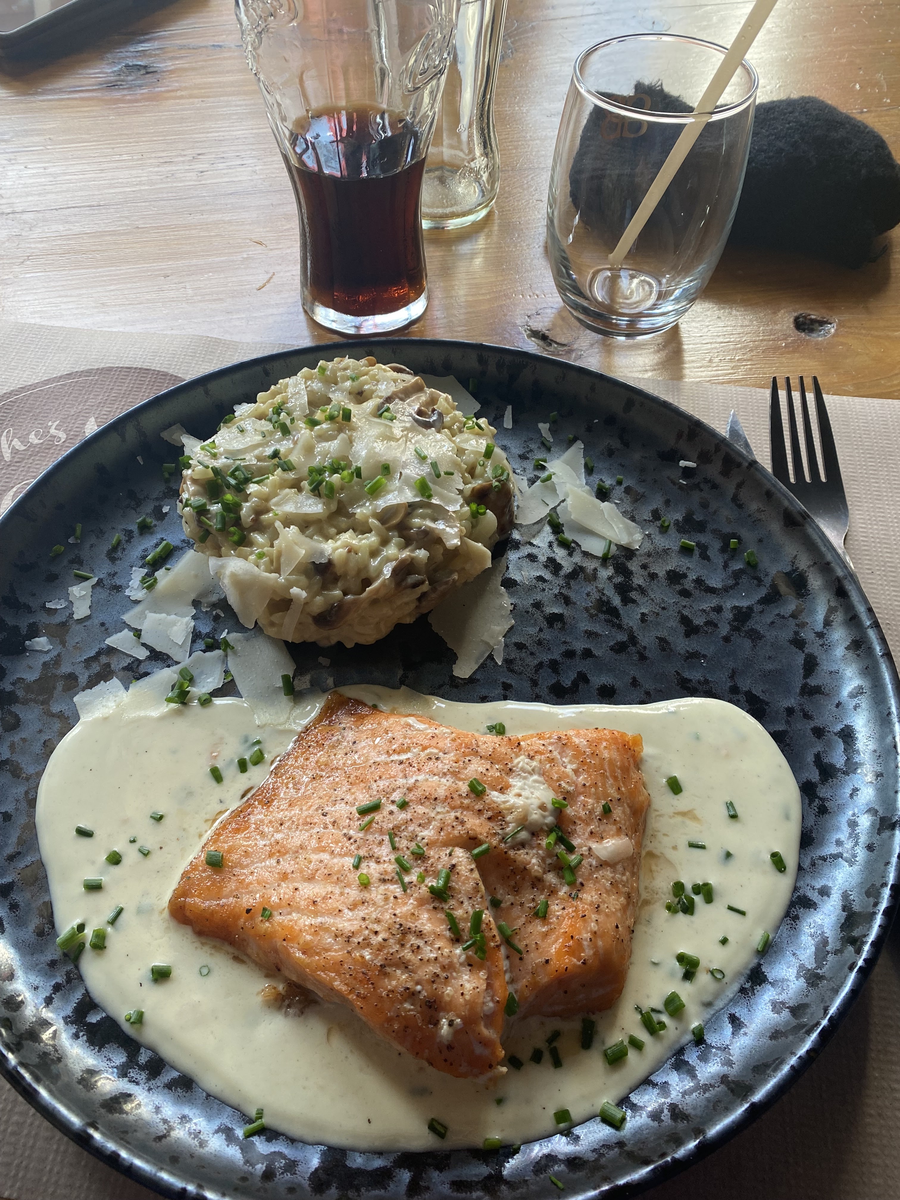 Pavé de saumon et risotto aux champignons délicieux Menu enfant excellent Ambiance impeccable service rapide efficace et souriant ! Agréablement Surprise par la cuisine je recommande à 200% Bravo continuez comme ça