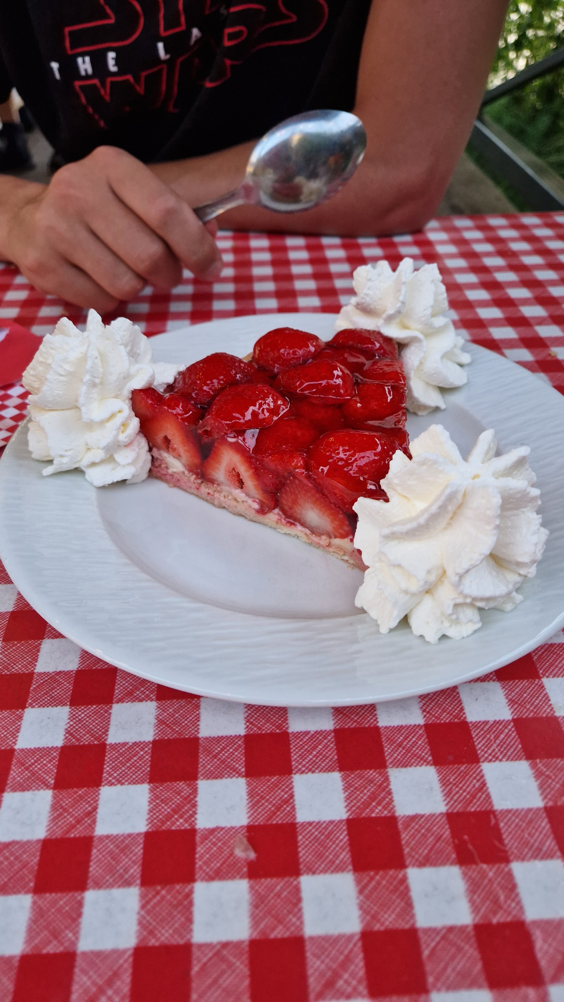 Nous sommes allé avec ma femme. Le cadre est très jolie au bord de l'eau, le personnel gentil et la carte est abordable. Ils ont toujours la fameuse tartre aux fraises réputé de gegene.