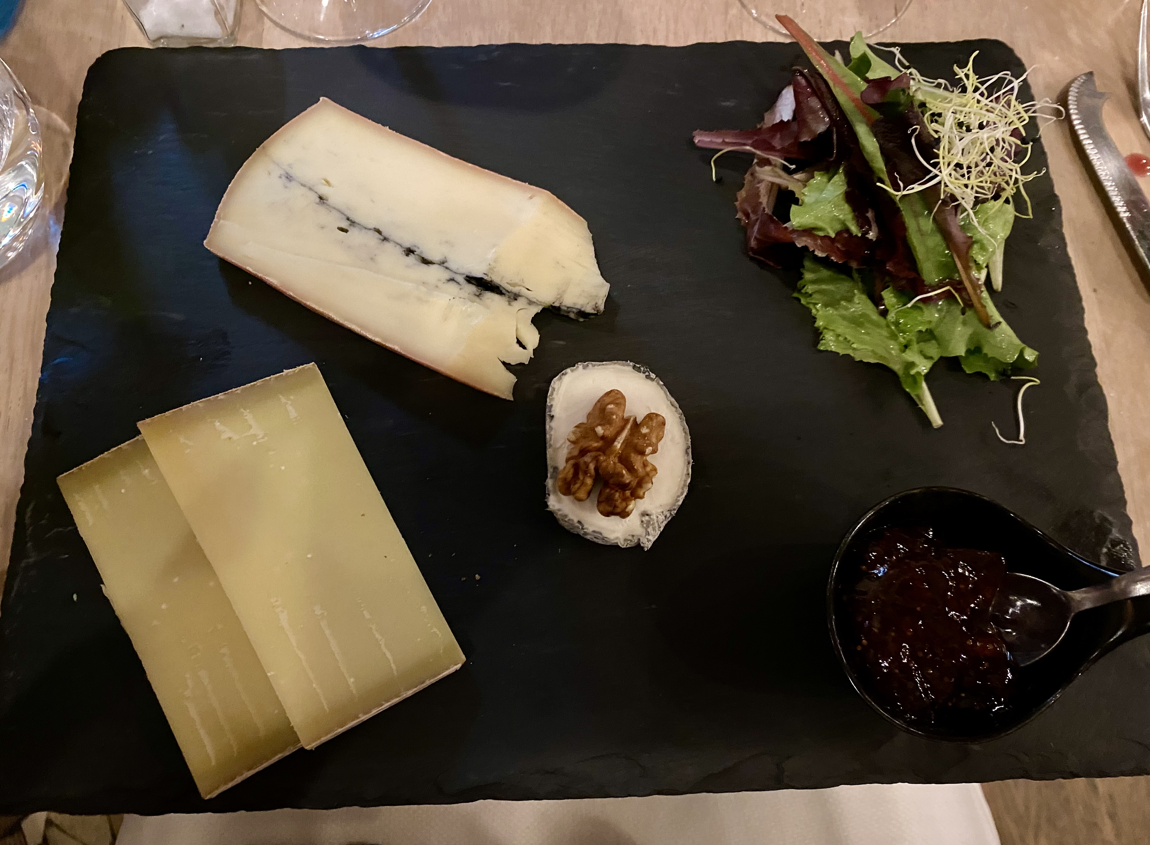Meilleur service mais la nourriture… vieux pain, trop cuit de façon négative confit et bon fromage du magasin d'à côté. Le bouillonnement était inconfortable et « douillet »… Nous nous attendions à beaucoup plus pour le prix.