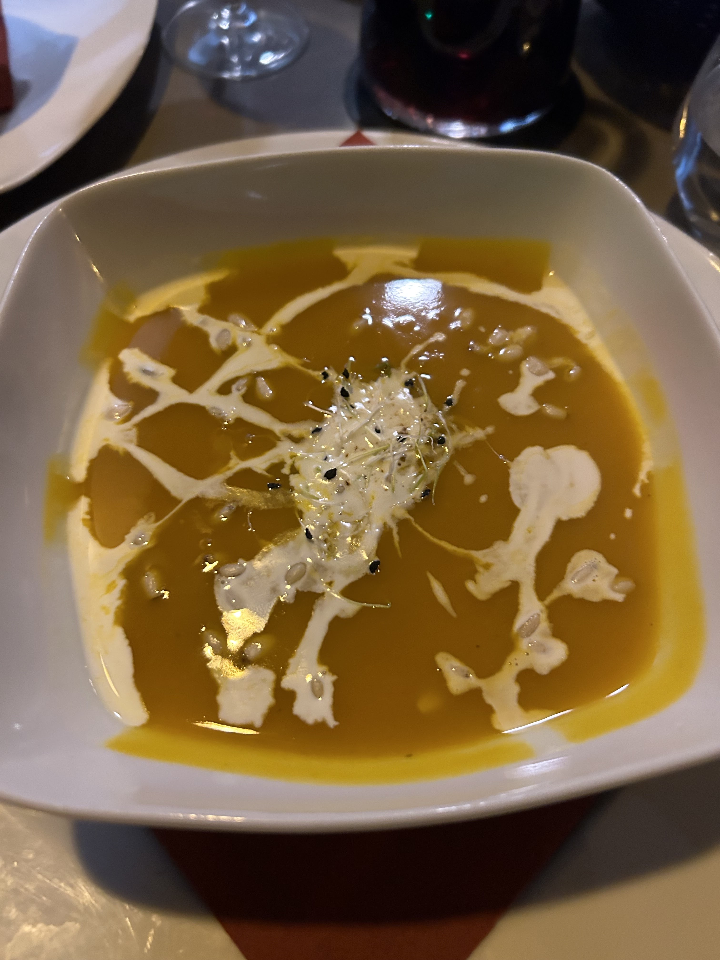Un restaurant tellement sympa et confortable! Ce n’est pas tous les jours qu’on mange aussi bien à Paris, avec un service chaleureux à l’image de Clara. Elle était extrêmement gentille et patiente même si la capacité du restaurant était limitée pour la nuit et qu'elle servait seule toutes les tables. La soupe Pumpik (entrée) était onctueuse et crémeuse comme il se doit avec des notes de poivre qui, combinées aux pignons de pin, en faisaient le début parfait d'un repas. Cela réchauffait le cœur et l’estomac. Peu de temps après, le plat principal était servi : un risotto aux calamars. Je n’ai pas de mots à part délicieux et parfait ! Le calmar était parfaitement cuit, pas épais comme on peut le trouver à certains endroits. Le risotto était fait avec de l'encre de seiche et c'était tout simplement parfait. Crémeux du début à la fin du repas, avec la bonne quantité de fromage (pas trop pour ne pas en avoir marre). Je n’ai pas eu de désert mais ils avaient tous l’air super aussi. Très bien réalisé, Chez Germaine. Je reviendrai, c'est sûr, lors de ma prochaine visite à Paris.