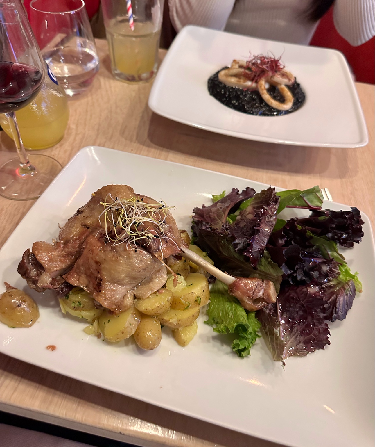 Nous étions ici le 24/08/22. Service très sympathique, le personnel nous a gentiment accueillis malgré le fait que nous n'avions pas de réservation. (celui que nous voulions essayer était encore en vacances) Le Coca froid et le vin nous ont vraiment rafraîchis pendant cette journée chaude et humide ! Les plats de risottos à l'encre noire et d'escargots étaient très savoureux. Beaux arts du placage. 😊 La nourriture était fraîche, cependant, plus salée et grasse. La cuisse de canard confite était sèche. Peut-être que nos papilles gustatives n’y étaient pas habituées. Ou peut-être avions-nous des attentes plus élevées avec la fourchette de prix en paires et les bonnes recommandations des youtubeurs. Merci pour l'excellente expérience de service client. 😇