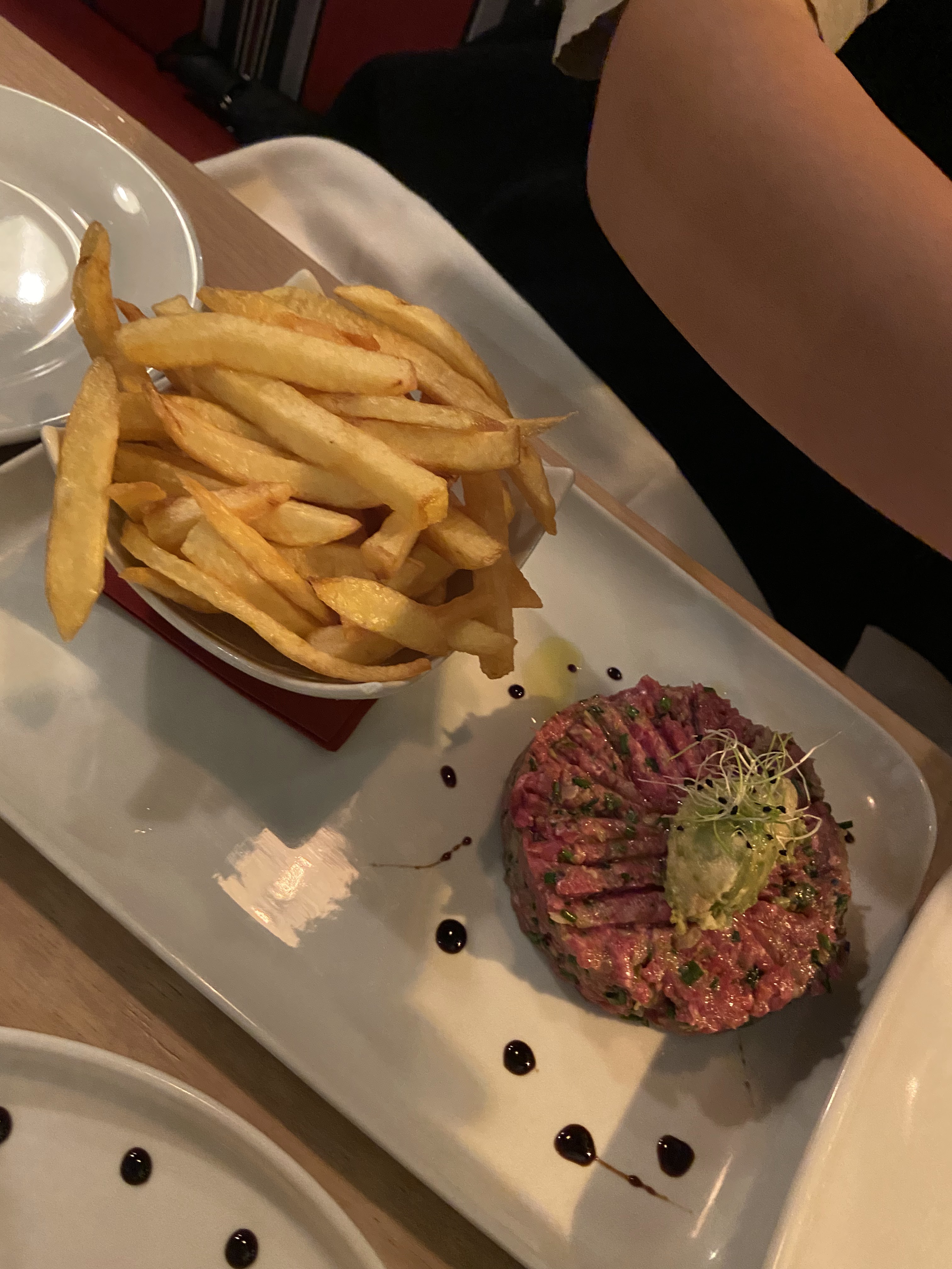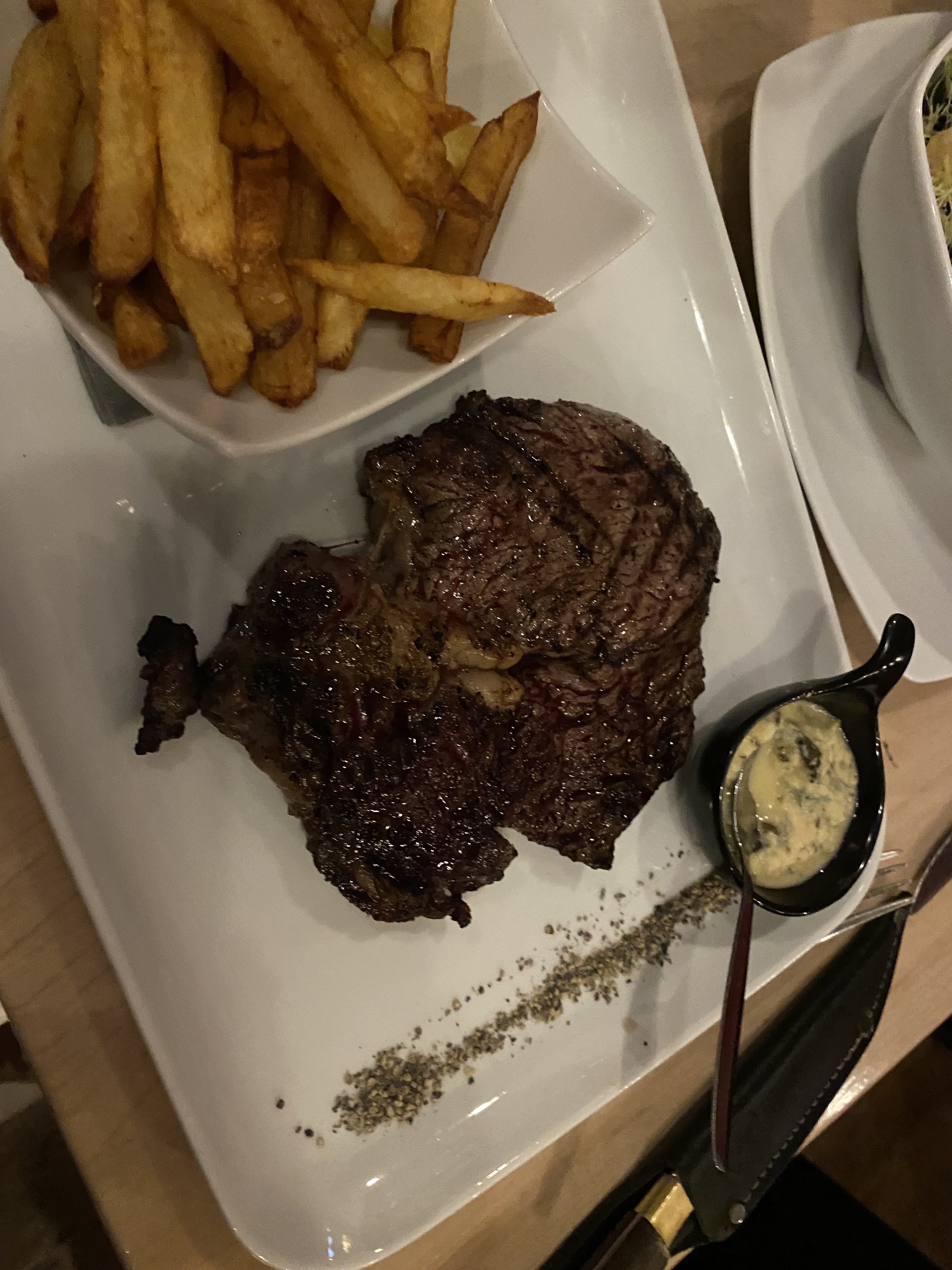 Nourriture médiocre pour Paris malheureusement, steak moyen cuit saignant et noir brûlé à l'extérieur, coupe bon marché, pas de sauce, frites grasses et détrempées. Pain froid et moelleux. Vous êtes mieux ailleurs.
