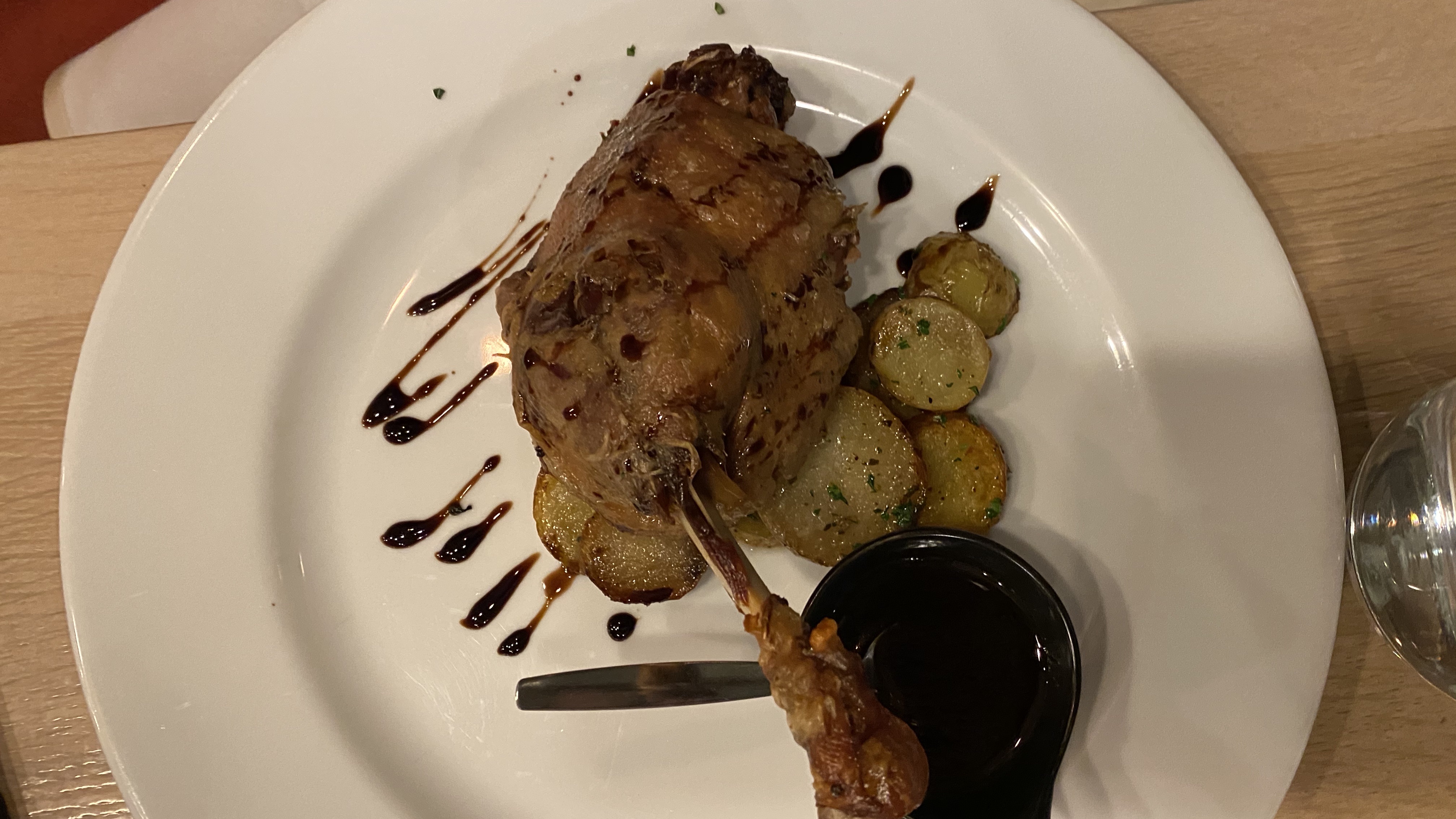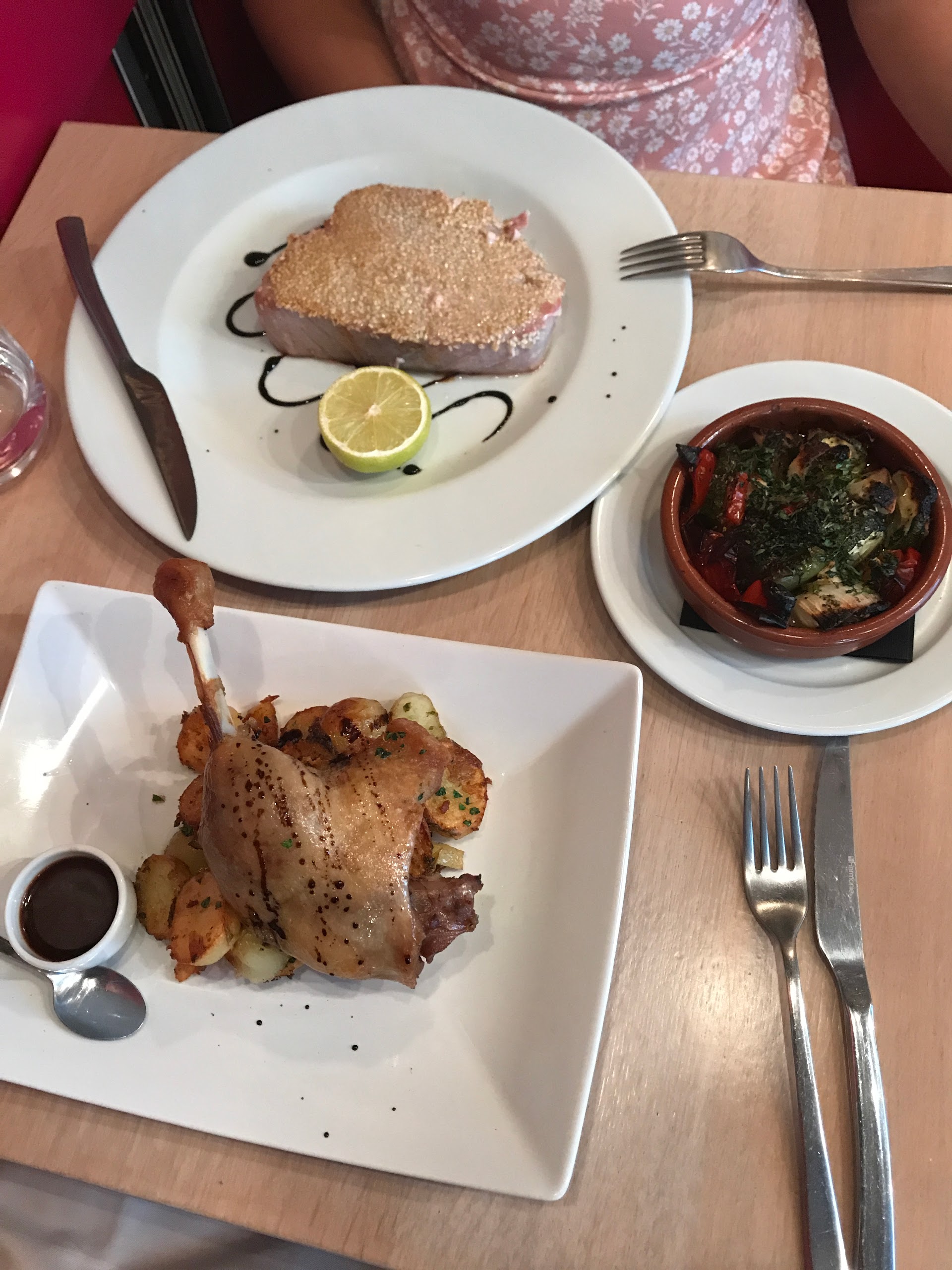 La nourriture était bonne, confite très petite cependant et peau pas croustillante. Cependant, les portions étaient très petites et la nourriture était tiède car sur des assiettes froides. Le service est très bon. Le potentiel d'être bien meilleur qu'il ne l'est, mais dans l'état actuel des choses, il ne peut pas être recommandé pour le prix.