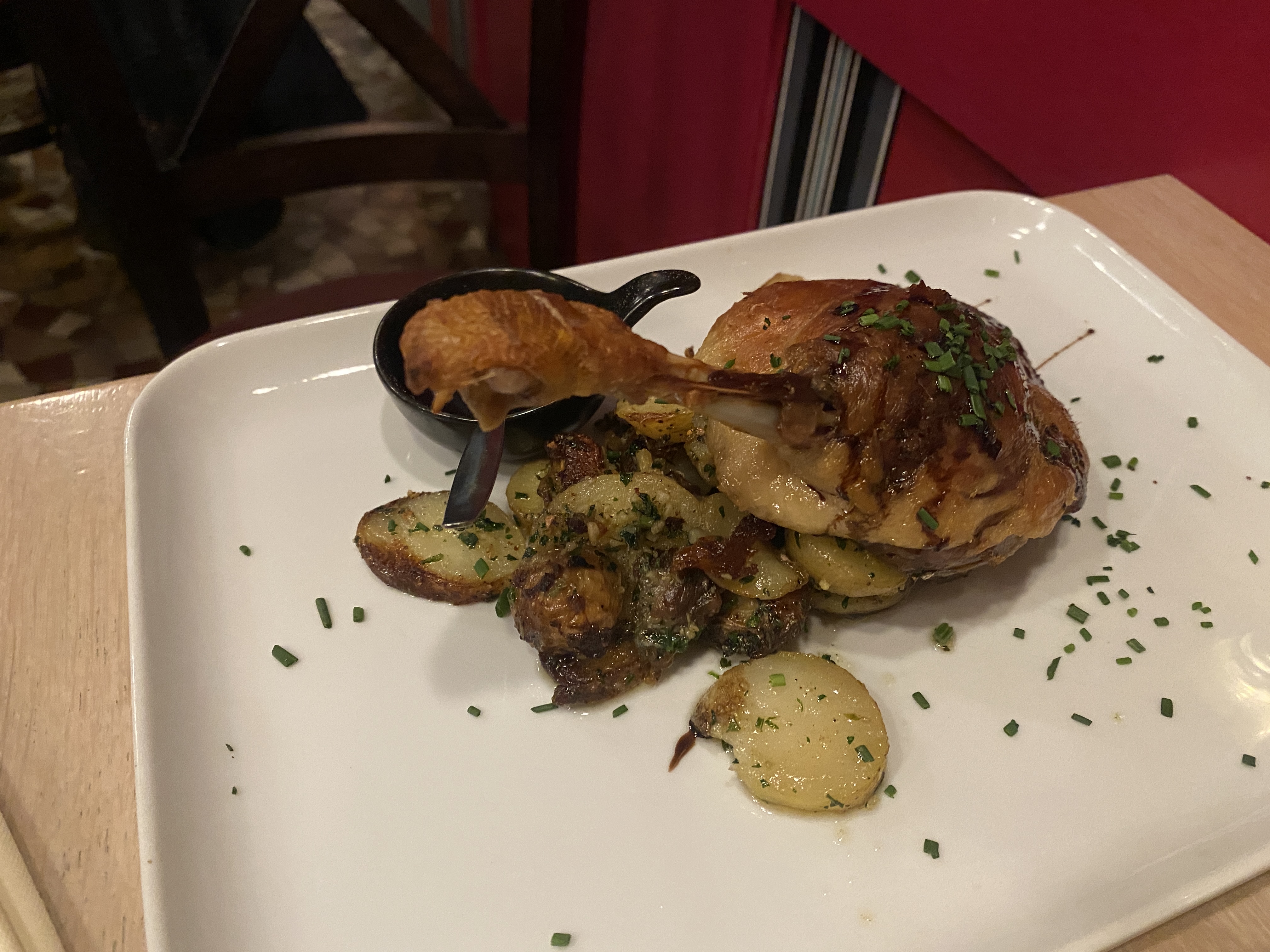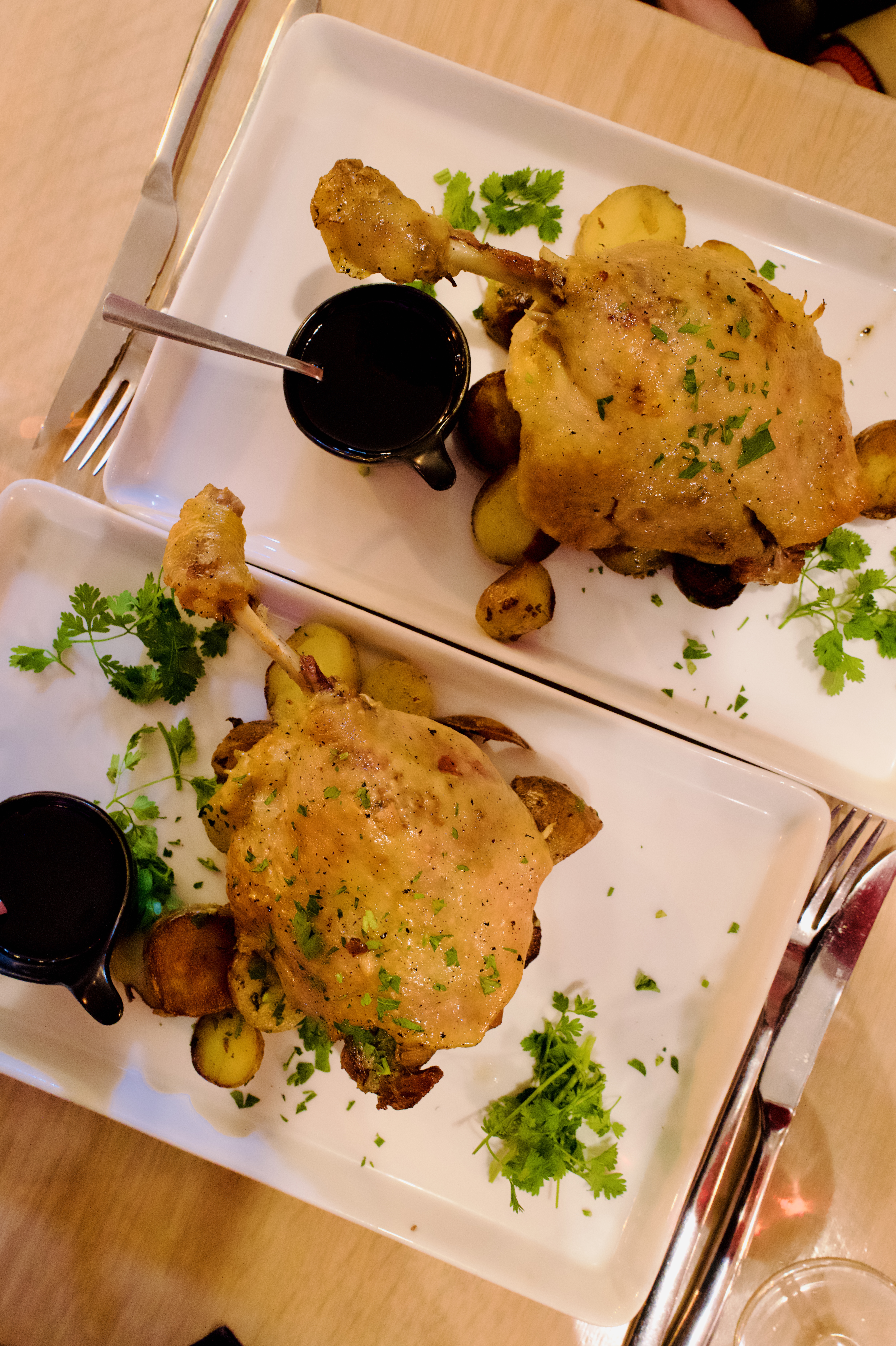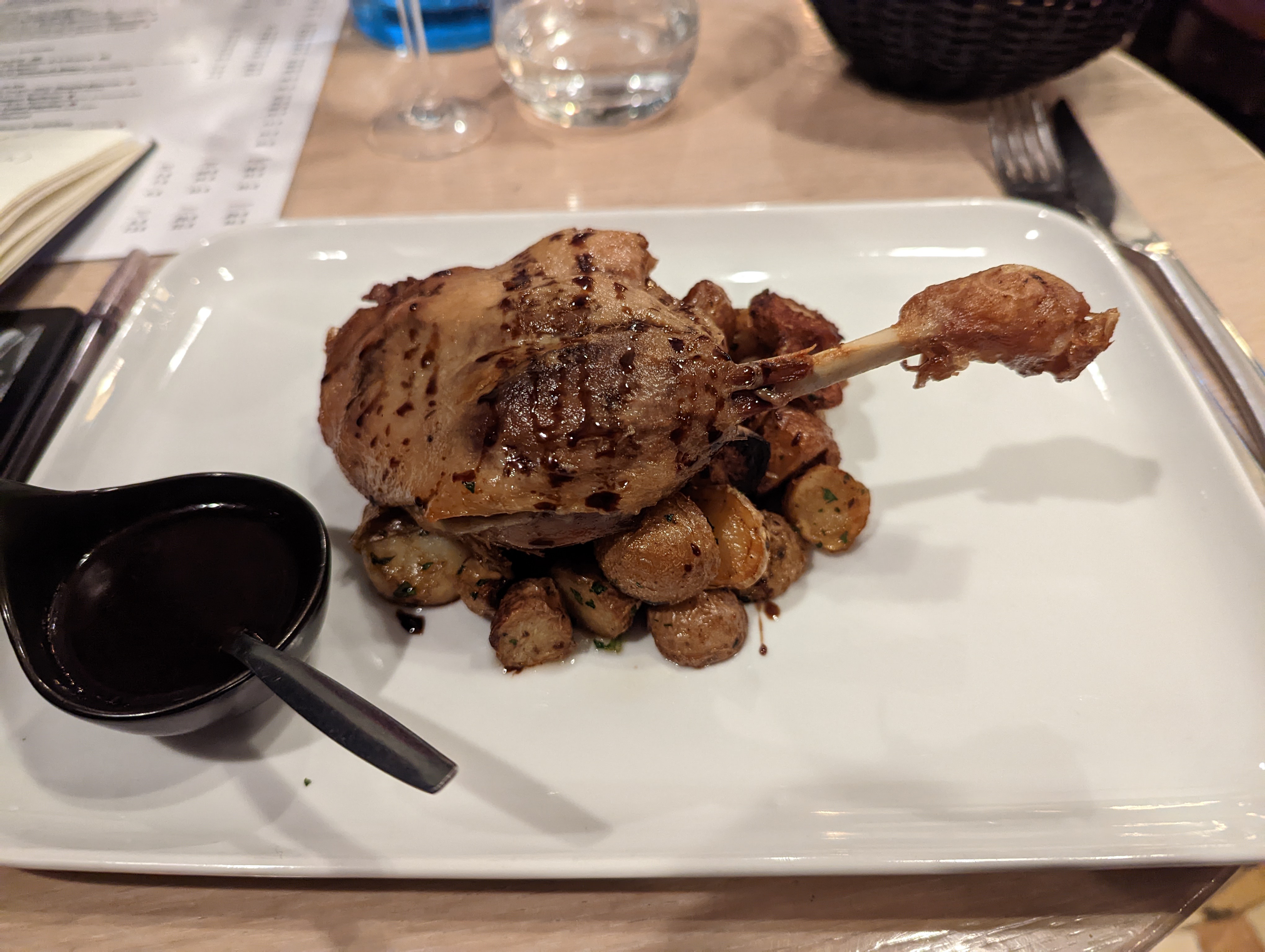 Essayez de faire une réservation si vous le pouvez, c'est un restaurant très petit et intime. Tout était excellent. Nous avons tous les deux pris le Canard Confit. Le canard était délicieux mais le véritable atout était les pommes de terre ! Je ne sais pas exactement ce qu'ils leur ont mis, mais ils étaient exceptionnels.