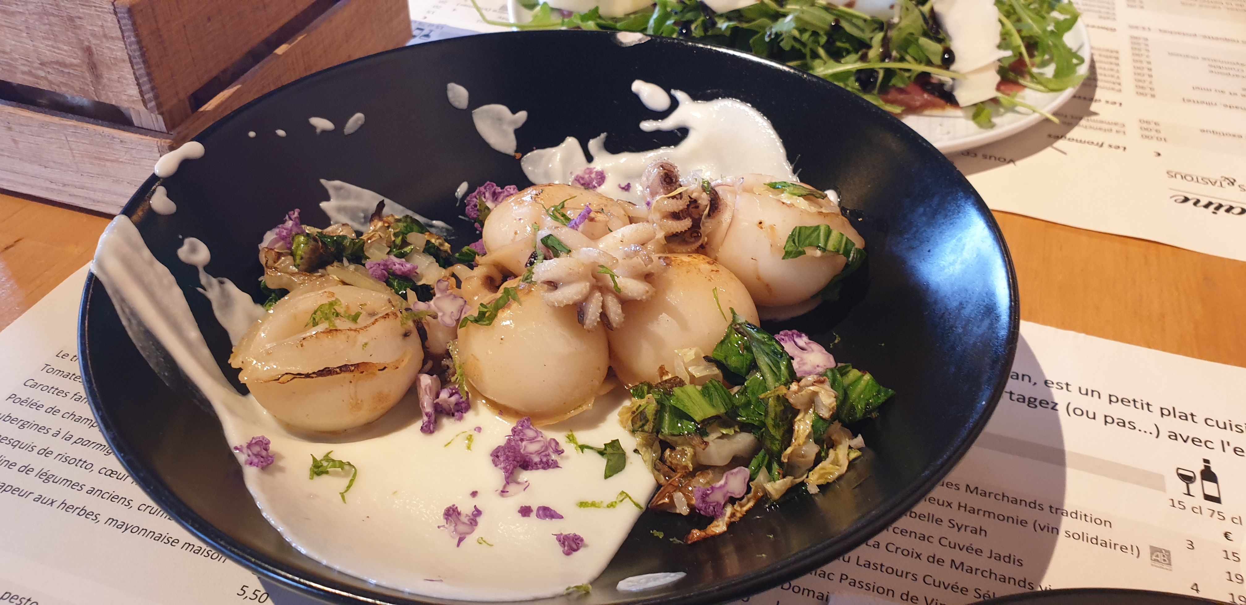 Venues entre collègues, nous nous sommes régalées. Tout était excellent : la poêlée de légumes, les cœurs de canard, les grenailles, les petites seiches.... Et j'oubliais la tarte myrtilles mont blanc miam ! Bref, nous recommandons !