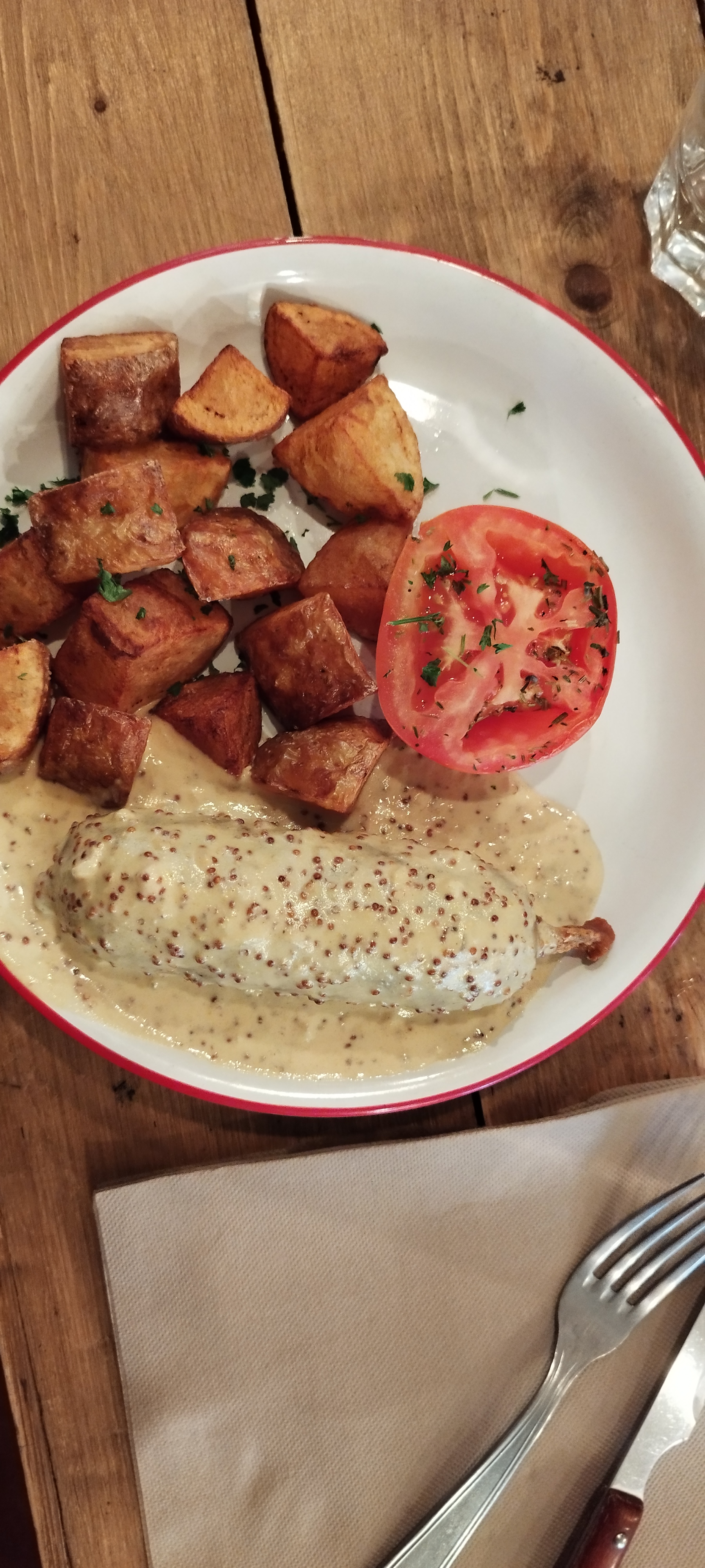 Lieu sympathique dans sa décoration ! Les plats :andouillette excellente !! Poulet à la crème.. servi froid … les tripes :manque de saveur,la tomate emporte le goût.. la pomme de terre 🥔 fade .. bref ce plat a besoin d’être revu côté gustatif.. la tarte praline rien d’extraordinaire en tout cas ce n’est pas celle de chez Grand mère !! Le baba .. rien de sensationnel.. bref .. déception.. en prime attente interminable entre les plats .. même oubli du 3eme plat en salle.. quand même !!! Grand Père doit prendre des cours Chez Mère !!!