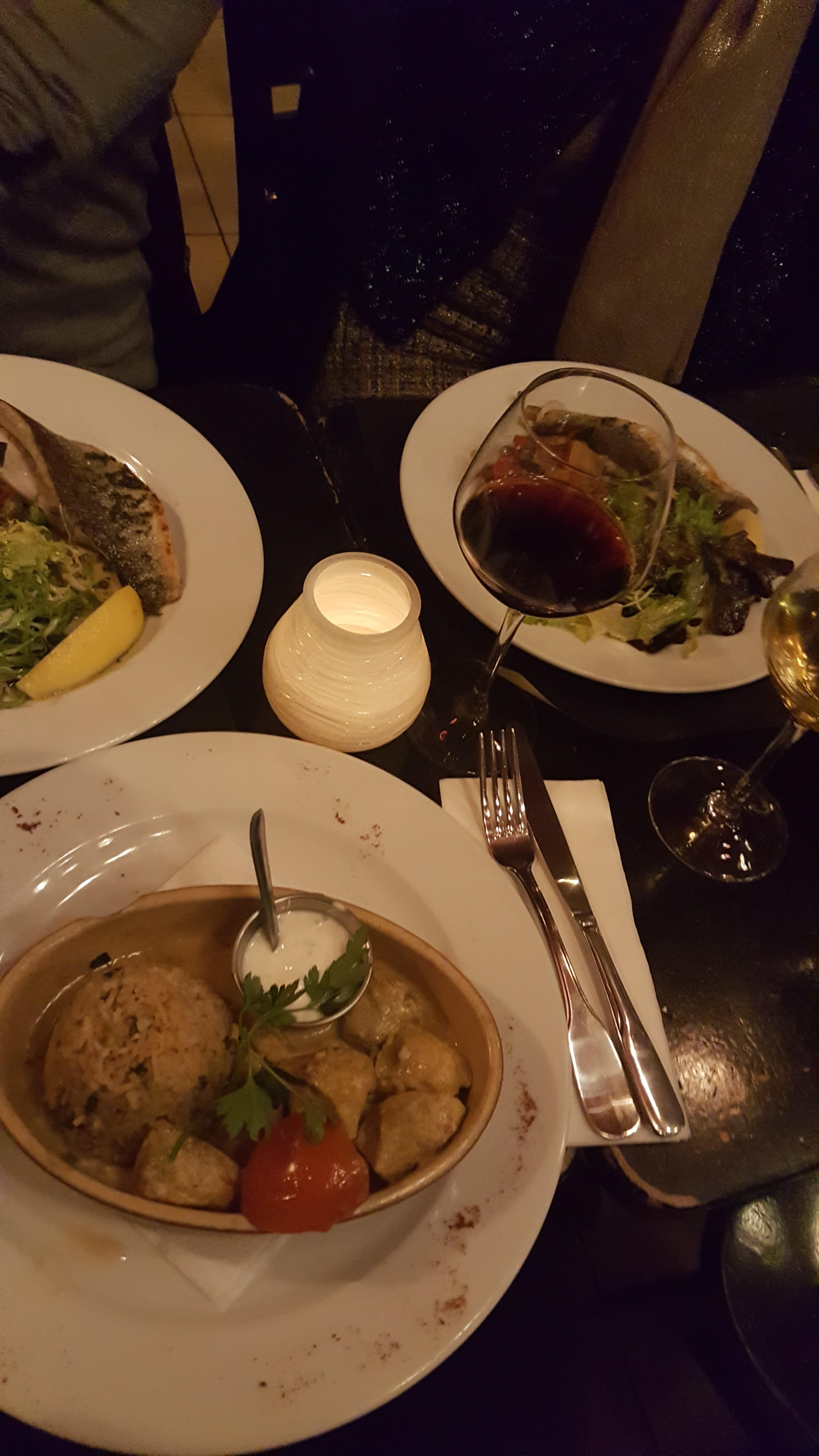 Repas dans l’ensemble bon, mais grosse surprise pour le dessert, deux de nos mi-cuits au chocolat ont été servis avec de la sauce salade au lieu de crème anglaise.. (no joke)