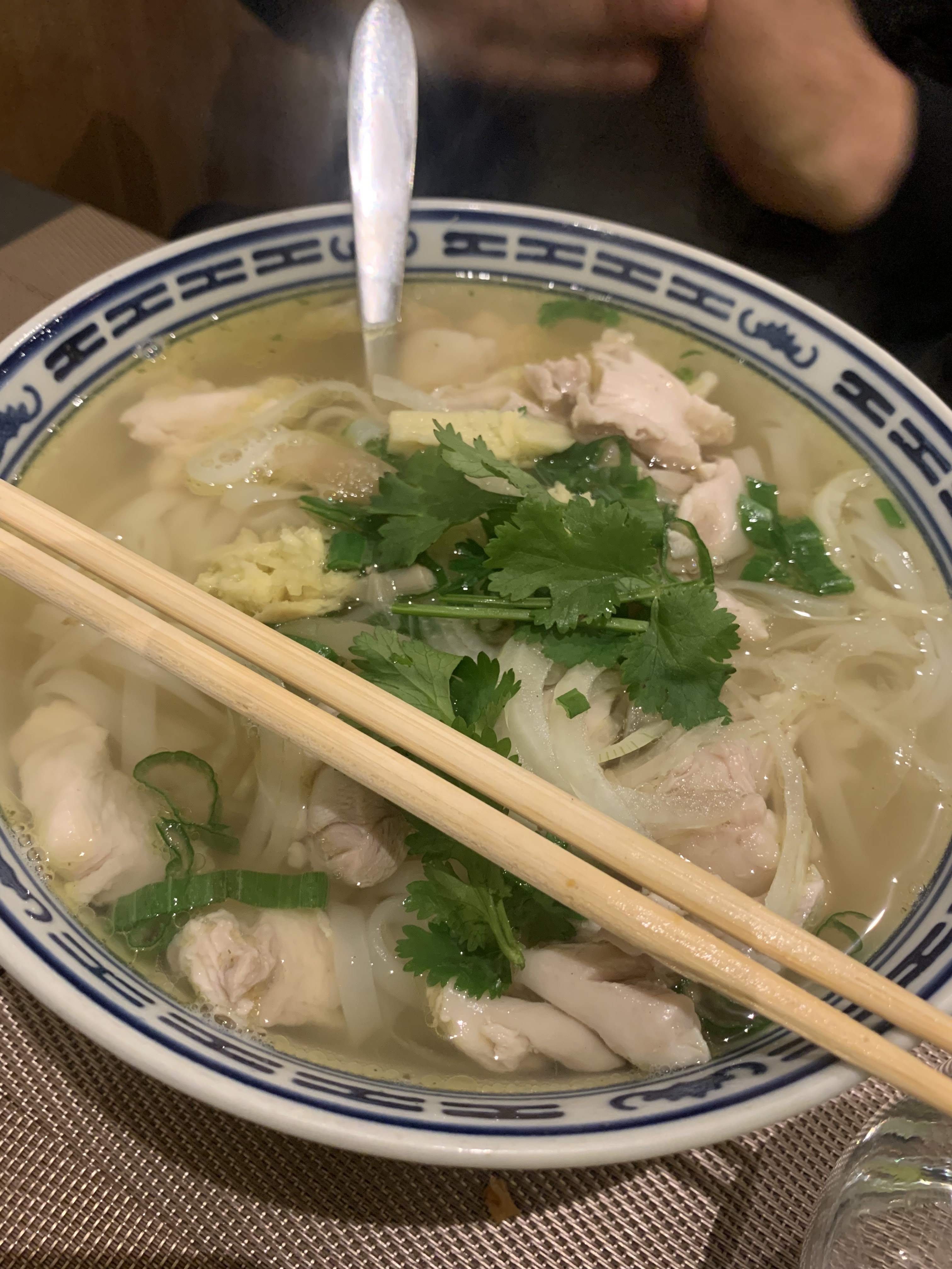 Soupe pho très bonne, traditionnelle mais un peu cher je trouve... Pas de place pour se garer