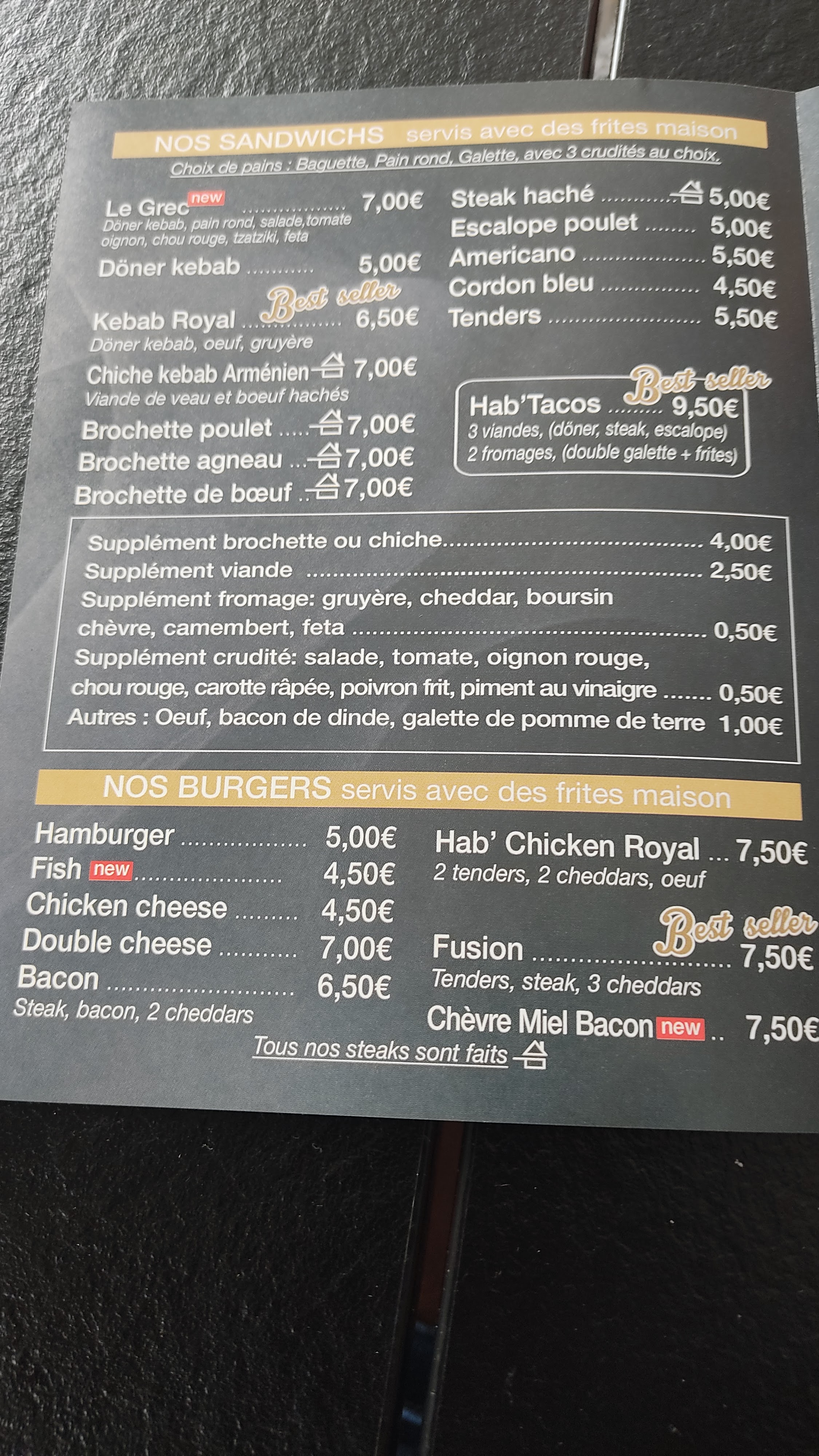 Mise à jour de mon avis précédent d’il y a un peu plus d’an . Que se passe t’il chez Habet depuis quelques mois ? Est-ce un soucis d’économie? Un changement en cuisine ou un changement de direction ? En attendant la nourriture est devenue franchement mauvaise! Les frites qui étaient bonnes avec des épices sont super bof quant au sandwich grec il est carrément infâme !!! Où sont passés le choux rouge, le tzatziki maison etc … à la place on se retrouve avec un mauvais kebab viande médiocre arrosée de sauce algérienne. 1 fois on s’est dit que c’était une erreur passagère, 2 fois on a commencé à douter mais à la 3 e fois au cours des 2 derniers mois on peut le dire : on ne reviendra pas et c’est dommage !