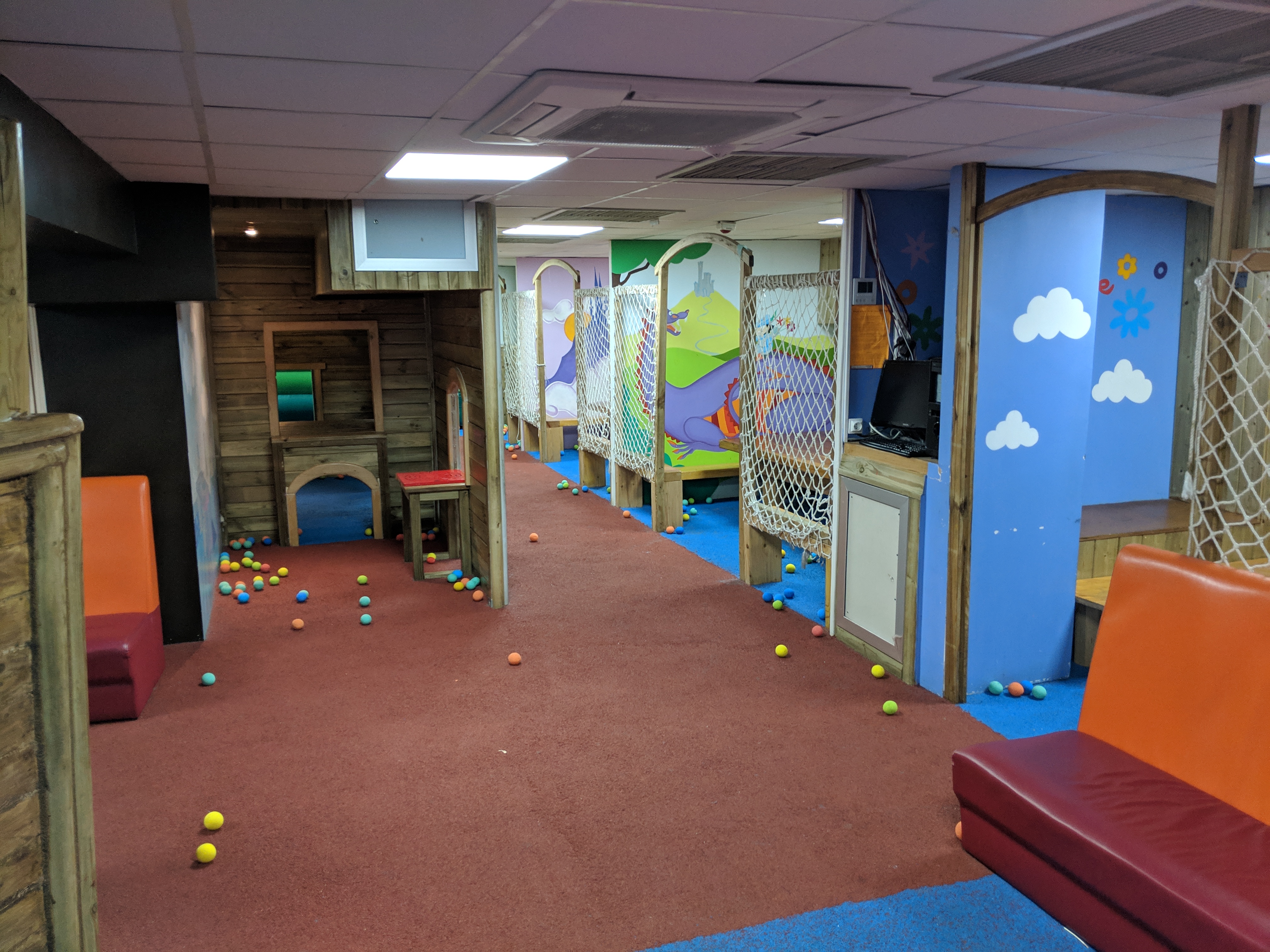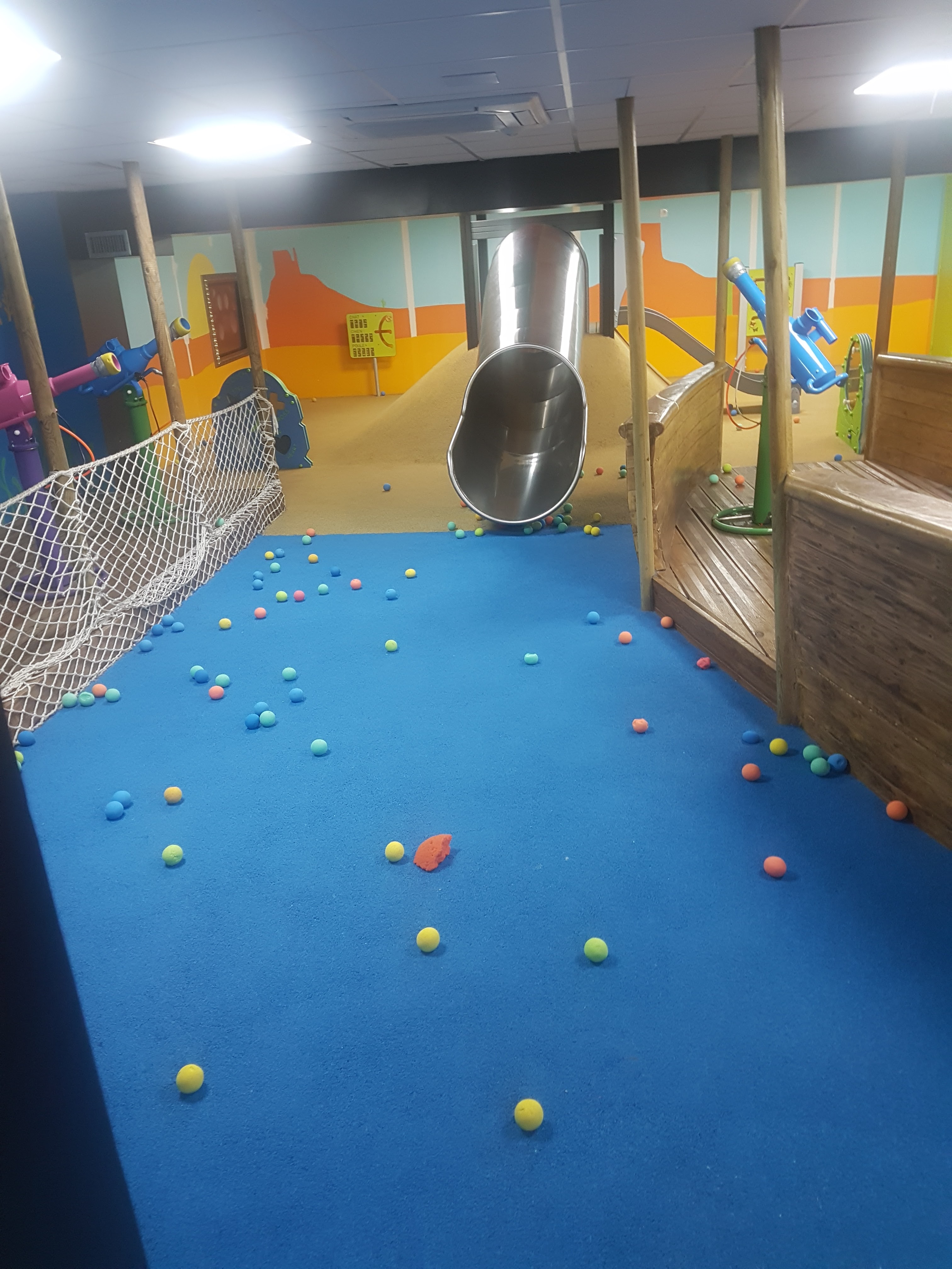 Concept très sympa, les parents peuvent manger tranquillement à l'étage tout en sachant leur enfant en sécurité grâce aux écrans que disposent la salle de repas et qui permettent de surveiller les enfants qui s'amusent dans les salles de jeux variées Un plaisir pour les parents et enfants avec un personnel sympathique