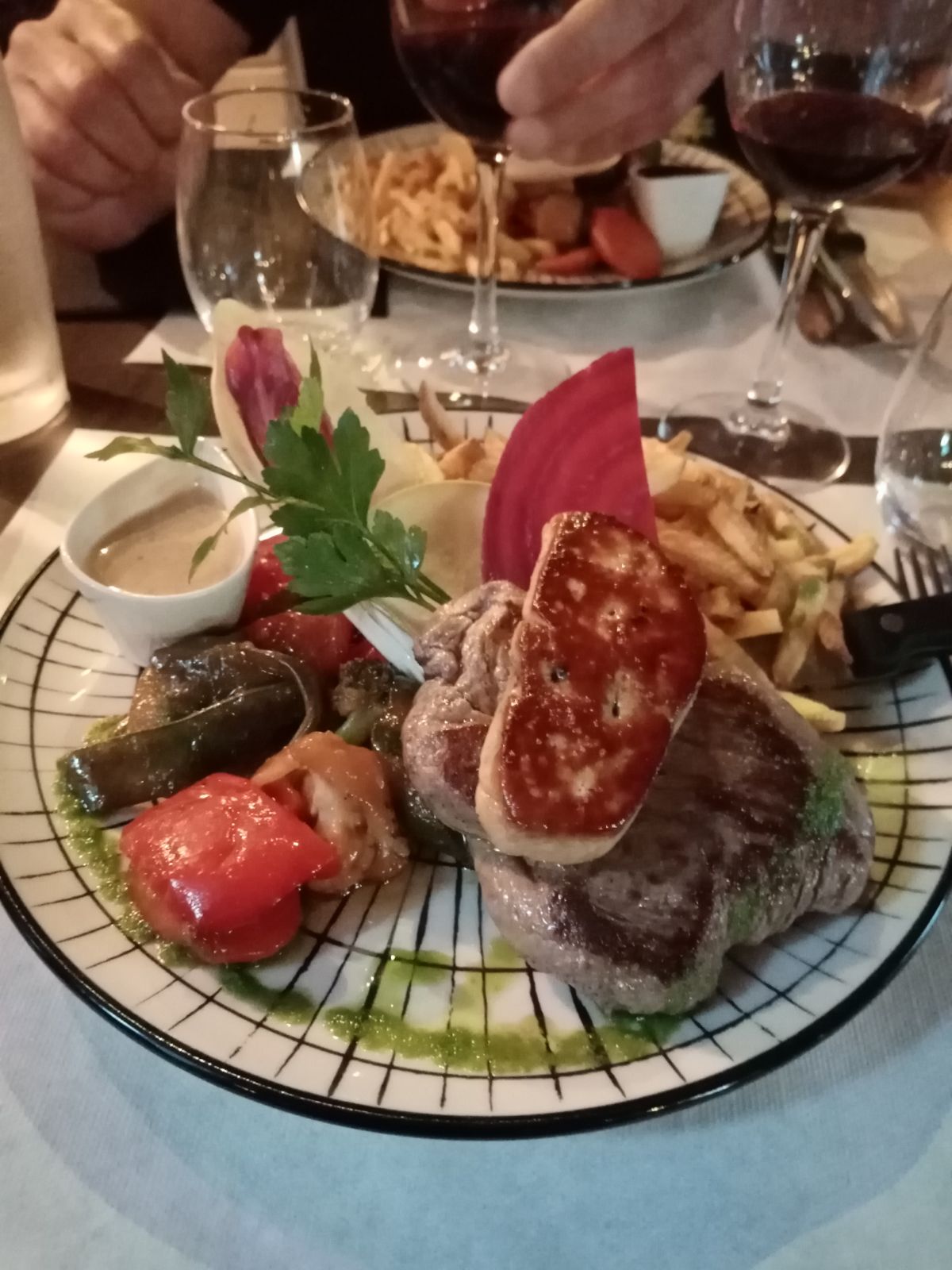 Bonnes viandes. Beau cadre. Portions apero et foie gras insuffisantes. Frites froides. Desserts industriels. Service à ameliorer.