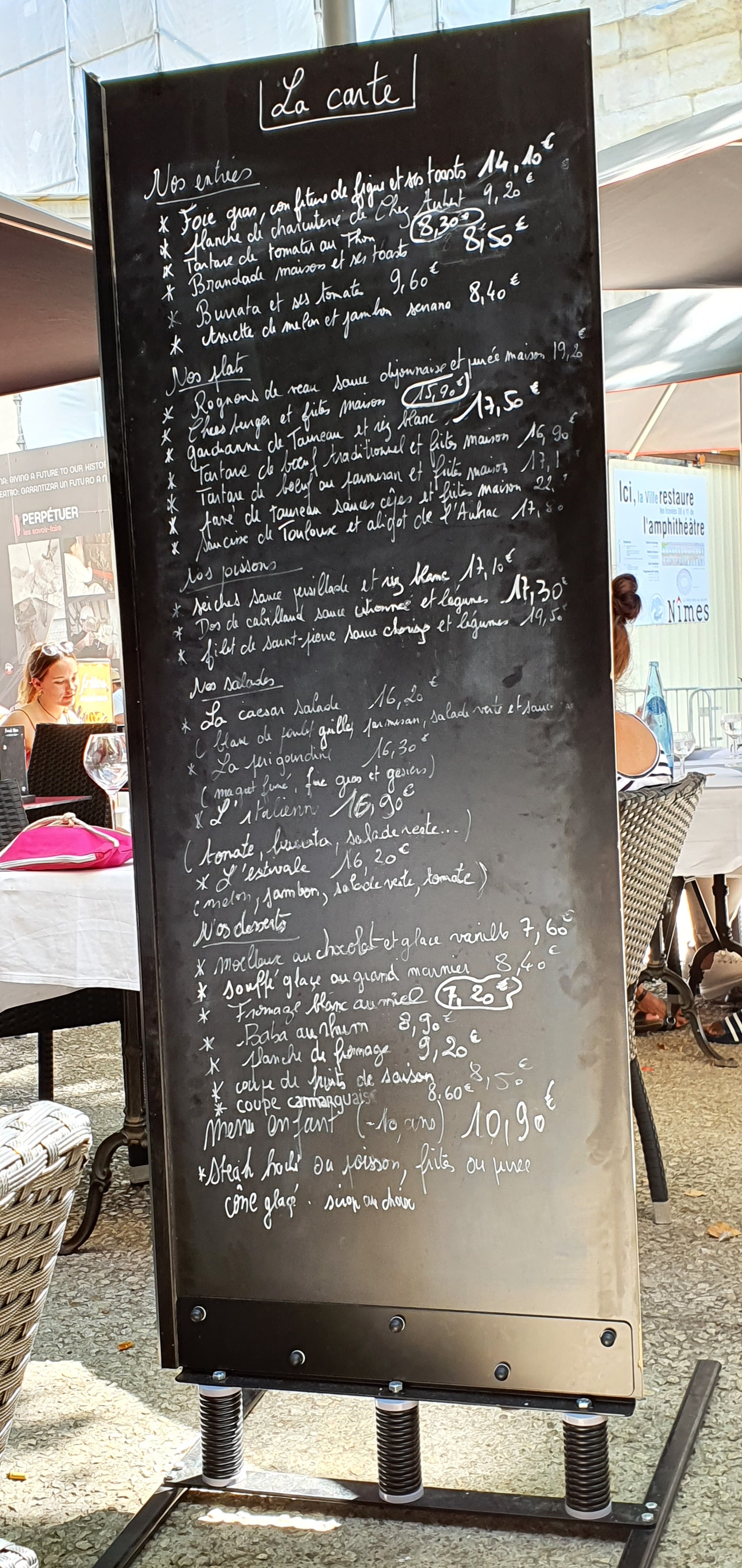 Une formule à 13 ,90 € avec une entrecôte sauce échalote très correcte,un café gourmand avec des desserts maison et un service attentionné et de qualité ! Et la vue sur les Arènes ! Je recommande !