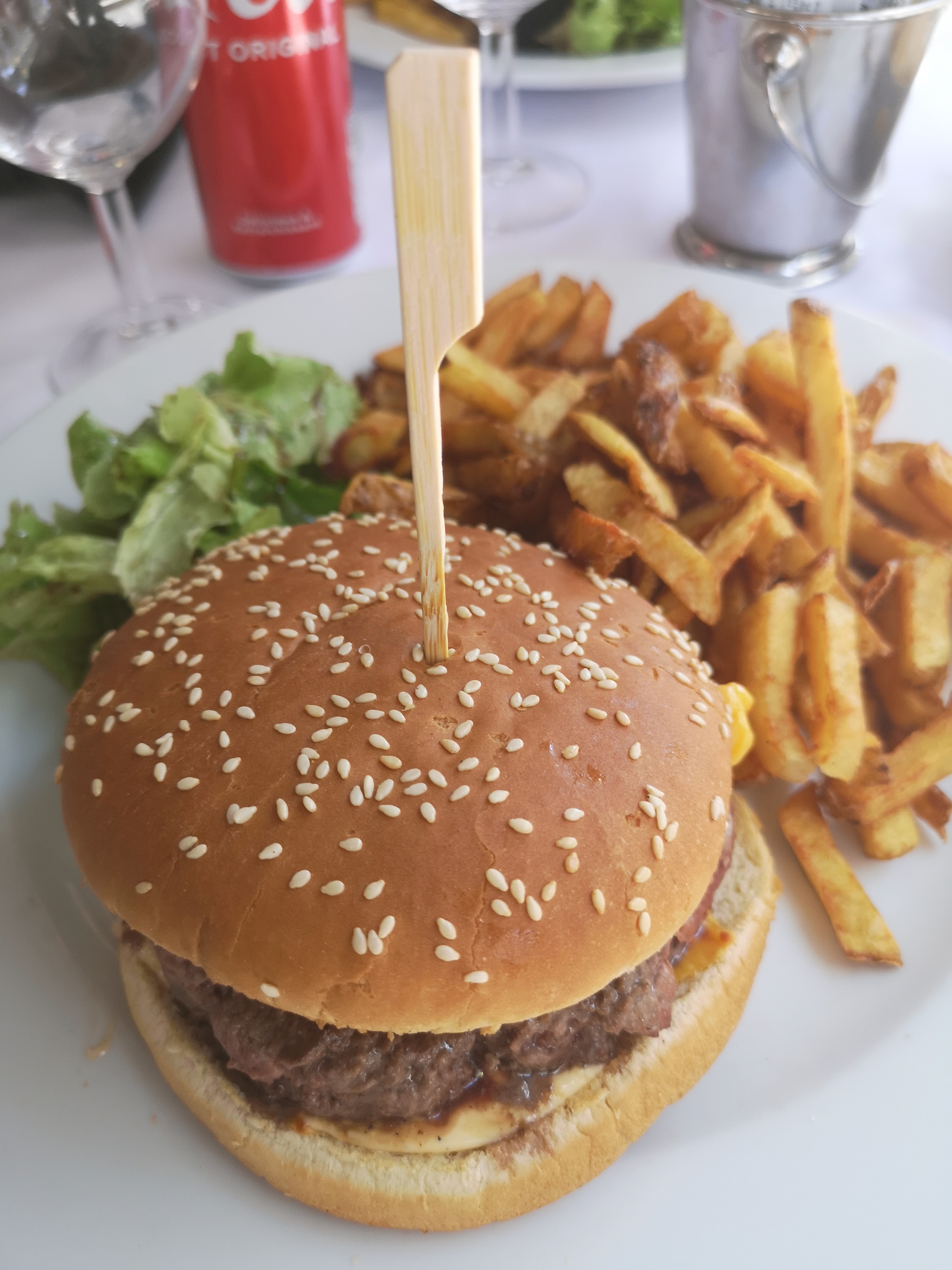 Prix très intéressants mais hamburgers dont le pain est relativement sec et la viande bien trop cuite pour une demande saignante. Vin au verre sans plus et coca sans bulle fait à la machine et non en canette. On ne s'est pas osé sur le dessert vu la qualité du plat. Déçu dans l ensemble.