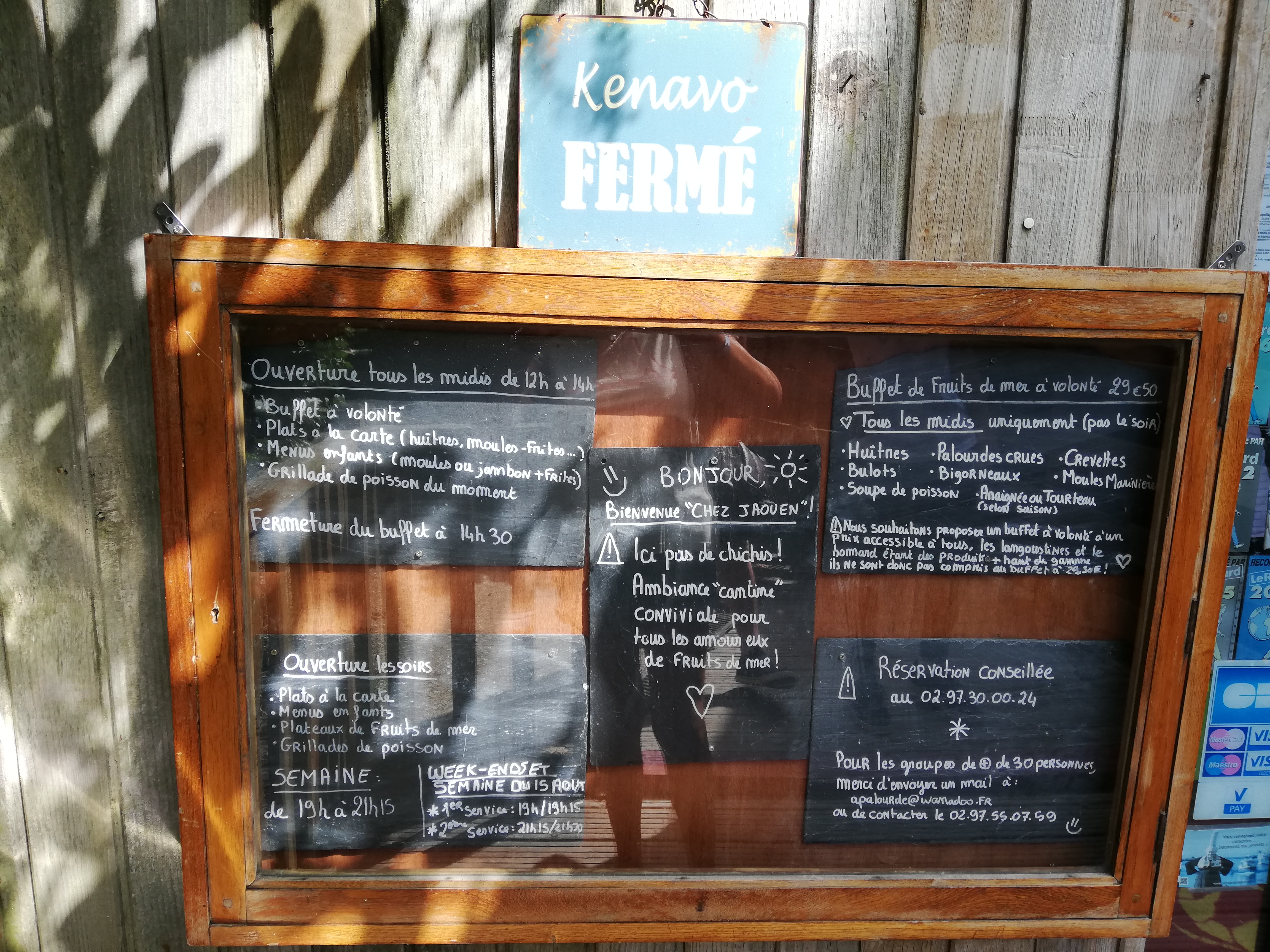 À deux pas du pont qui mène à la trinité sur mer , l’ostréiculteur chez JAOUEN fait aussi une restauration de qualité et de fraîcheur ici point de viandes que des huîtres des crustacés homards ou poissons. Moi, j’ai une nette préférence pour le buffet à volonté praires,huîtres,bulots,crabes et crevettes à volonté. Naturellement des moules vous attendent ; en supplément ajoutez des frites maison ;ajoutez un cidre fermier et le décor fera le reste pour qu’un déjeuner hors pair se déroule.