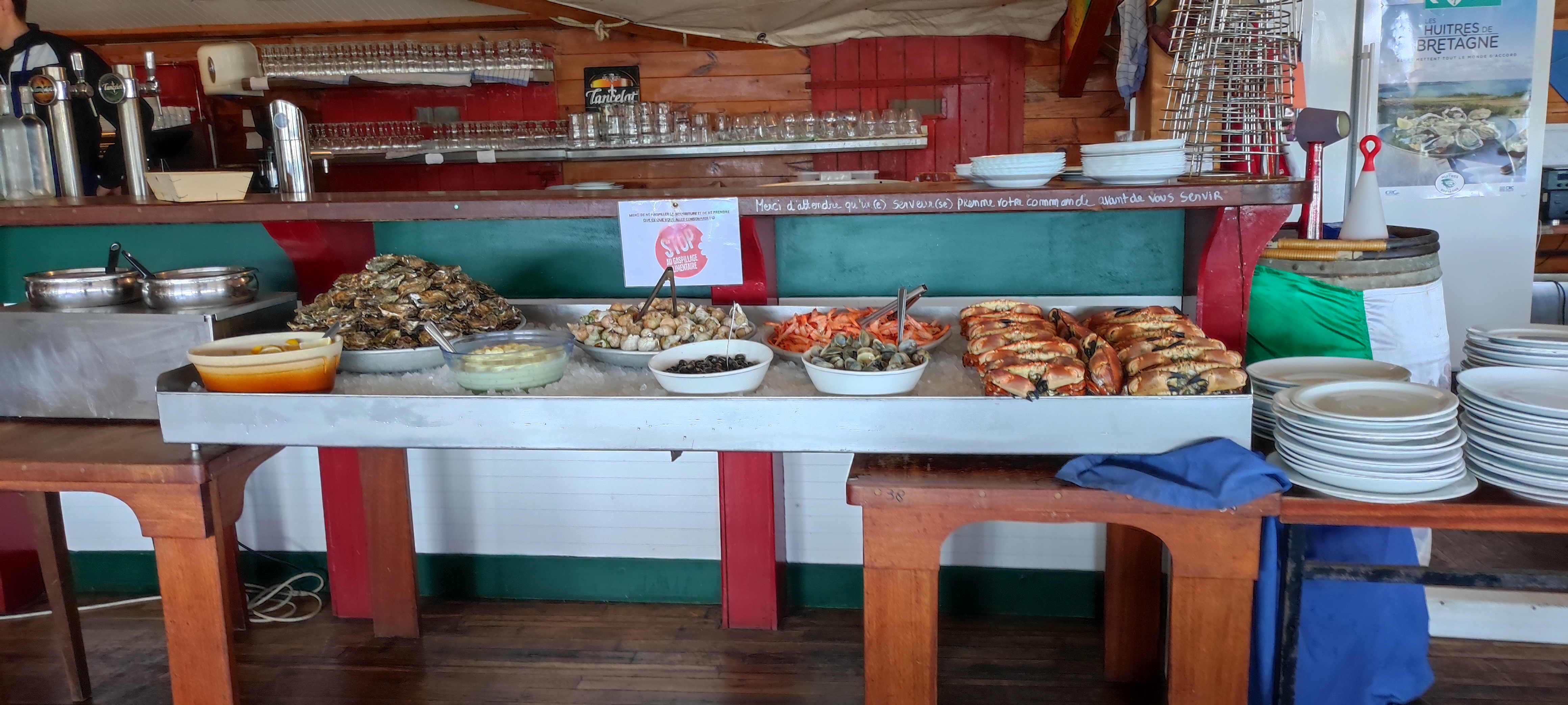 Bretons, Habitués depuis qqles années, sommes très déçus de la baisse de qualité . Reassortiment au compte gouttes, araignées vides et flotteuses, bigorneaux mal cuits..pain rationné, pas de tourteaux ( pendant la saison) et moules , toujours très bonnes, mais casseroles souvent vides. A part la jeune fille blonde a lunettes et le jeune au tee short rayé jaune et noir..pas vraiment de vivacité chez les autres ( a part pour l'e caissement )