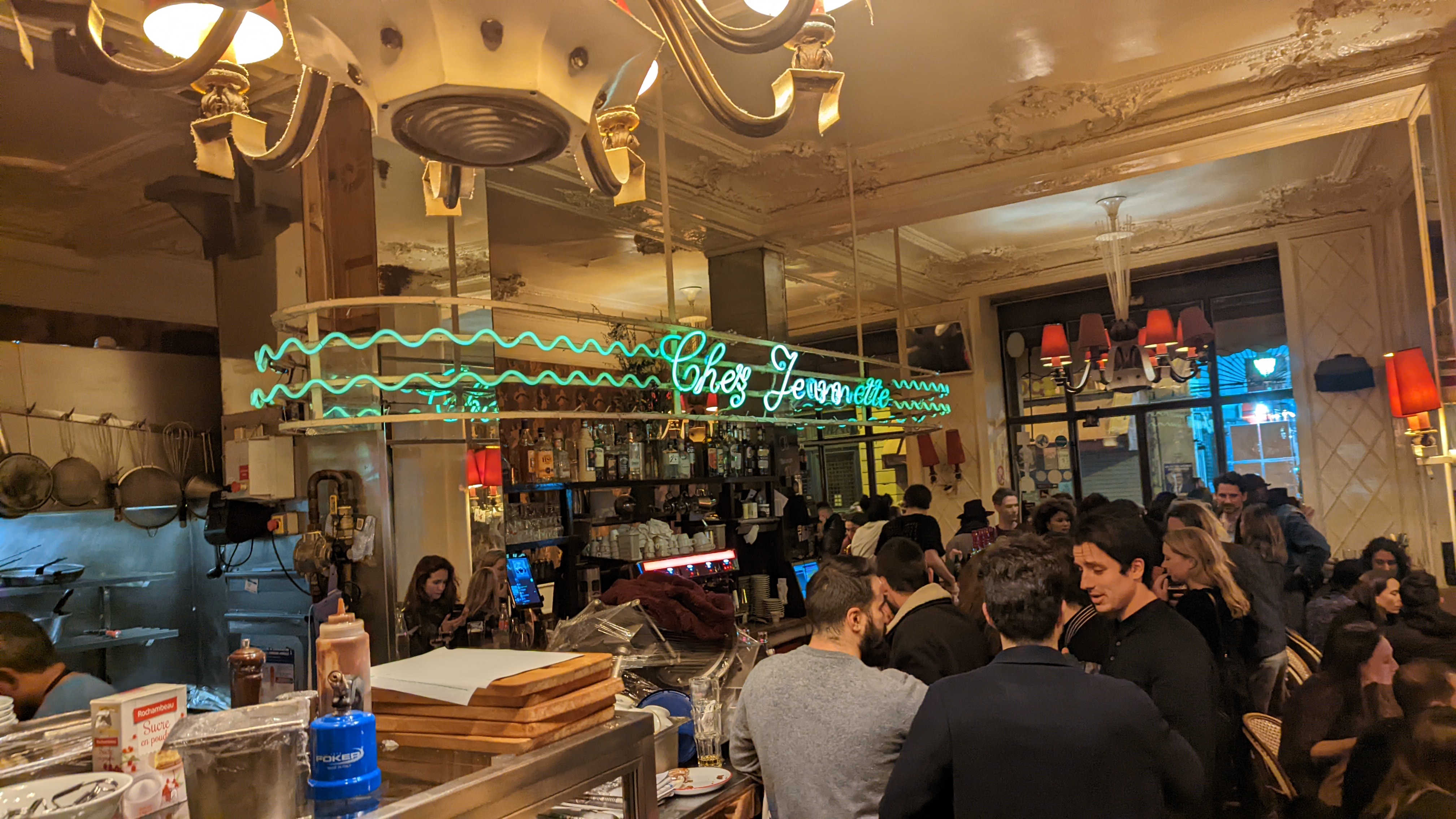 Bar en zinc shabby-chic (c'est vraiment les deux), acheté à l'éponyme Jeannette par une jeune cabale branchée, ce lieu éclairé au néon sert le jour une cuisine française décontractée, inscrite au tableau - assiette de charcuterie, bavette poelée - et passe en mode fête la nuit et le week-end. L'âge moyen de la clientèle a chuté depuis le rachat branché, mais rien d'autre n'a changé, du papier peint jauni à l'enseigne Chez Jeannette au-dessus du bar. Venez prendre une assiette de fromages et un pichet de blanc vers 18 ou 19 heures, pendant que c'est encore décontracté et que vous pouvez vous faufiler dans une banquette au fond ; revenez plus tard pour le voir démarrer, socialement parlant.