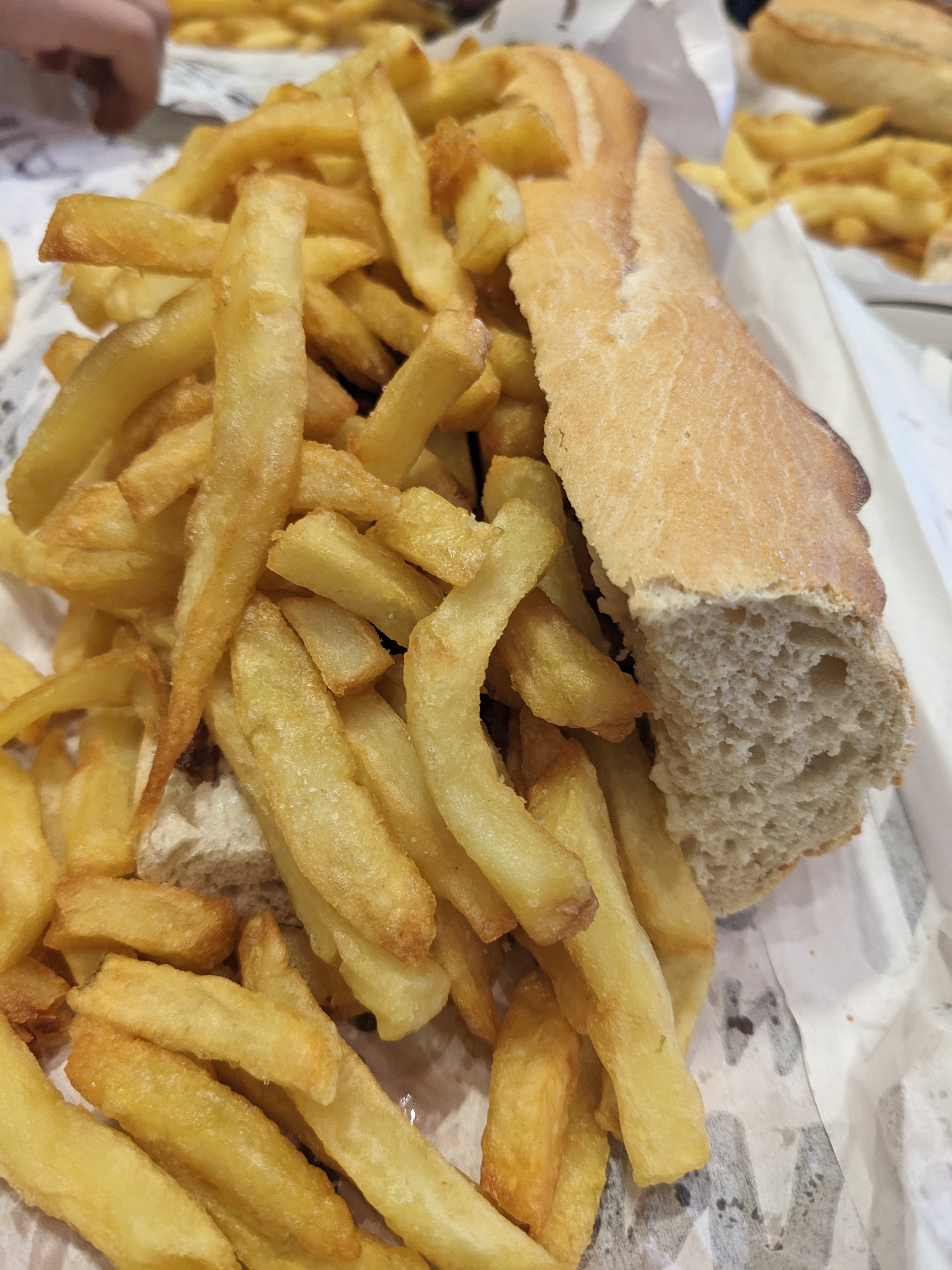 Je ne comprends pas les gens qui mettent 2 étoiles alors qu’ils disent avoir apprécié la nourriture. N’est-ce pas le principal qu’on demande à un restau ? Donc oui c’est bon. La baguette de l’américain est classique mais bonne pour une classique. Lieu propre, y compris toilettes. Personnel sympathique. Oui les frites débordent et alors ? Les quantités sont en effet importantes. Comme au Mcdo faut débarrasser son plateau, McDo qui est pas moins cher avec une bouffe de moins bonne qualité. Et au moins ici on engraisse pas une multinationale américaine. En bref, bonne adresse pour manger sur le pouce.