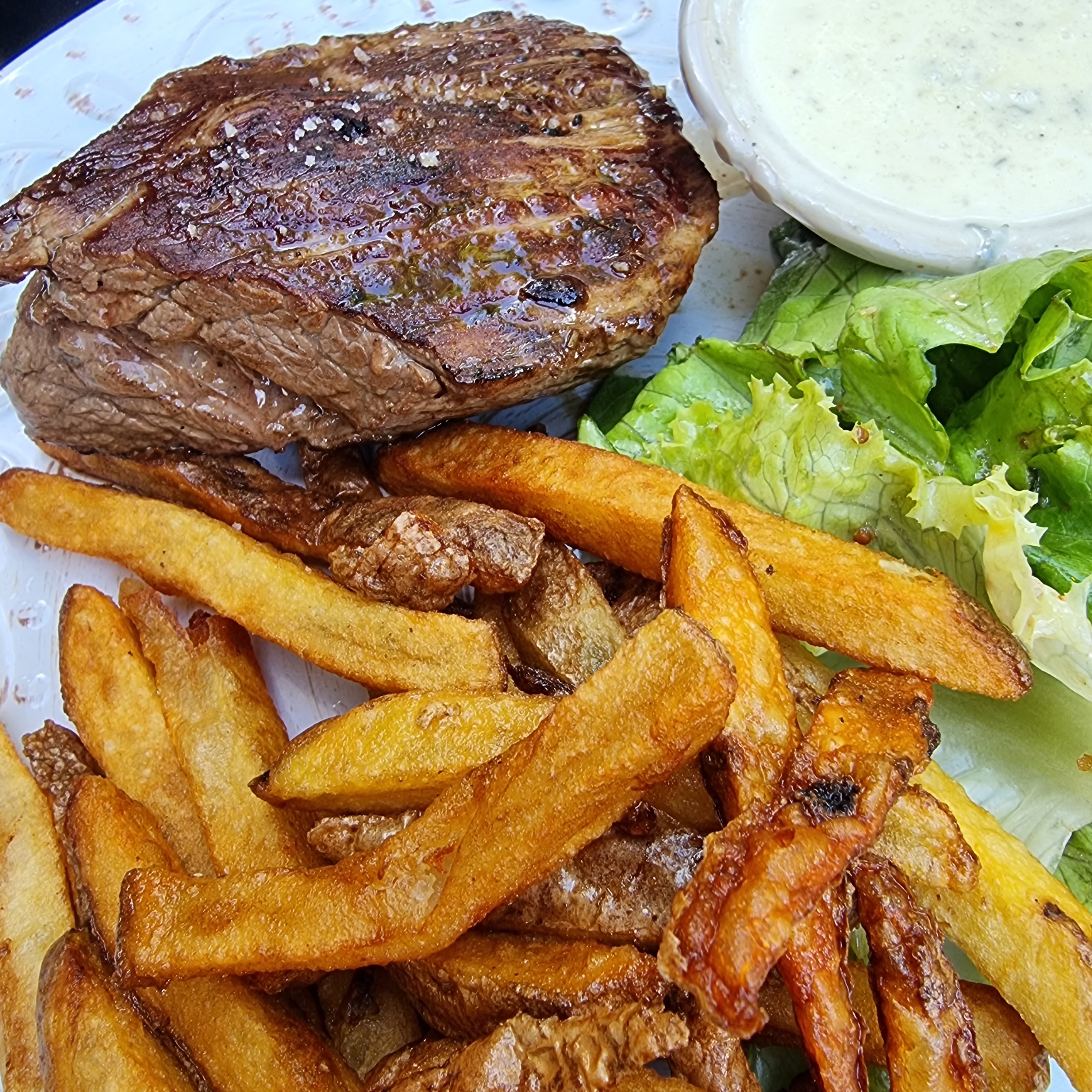 Accueil agréable et dynamique. Les serveuses sont très sympathique et performantes. Le repas a été excellent : une entrée qui m'a agréablement et un plat de résistance composé d'une viande succulente et d'un gratin de pommes de terre avec une sauce au bleu savoureux. Un petit supplément frites avec mayonnaise maison (tout comme les frites du reste) forts délicieux. Très bonne adresse.