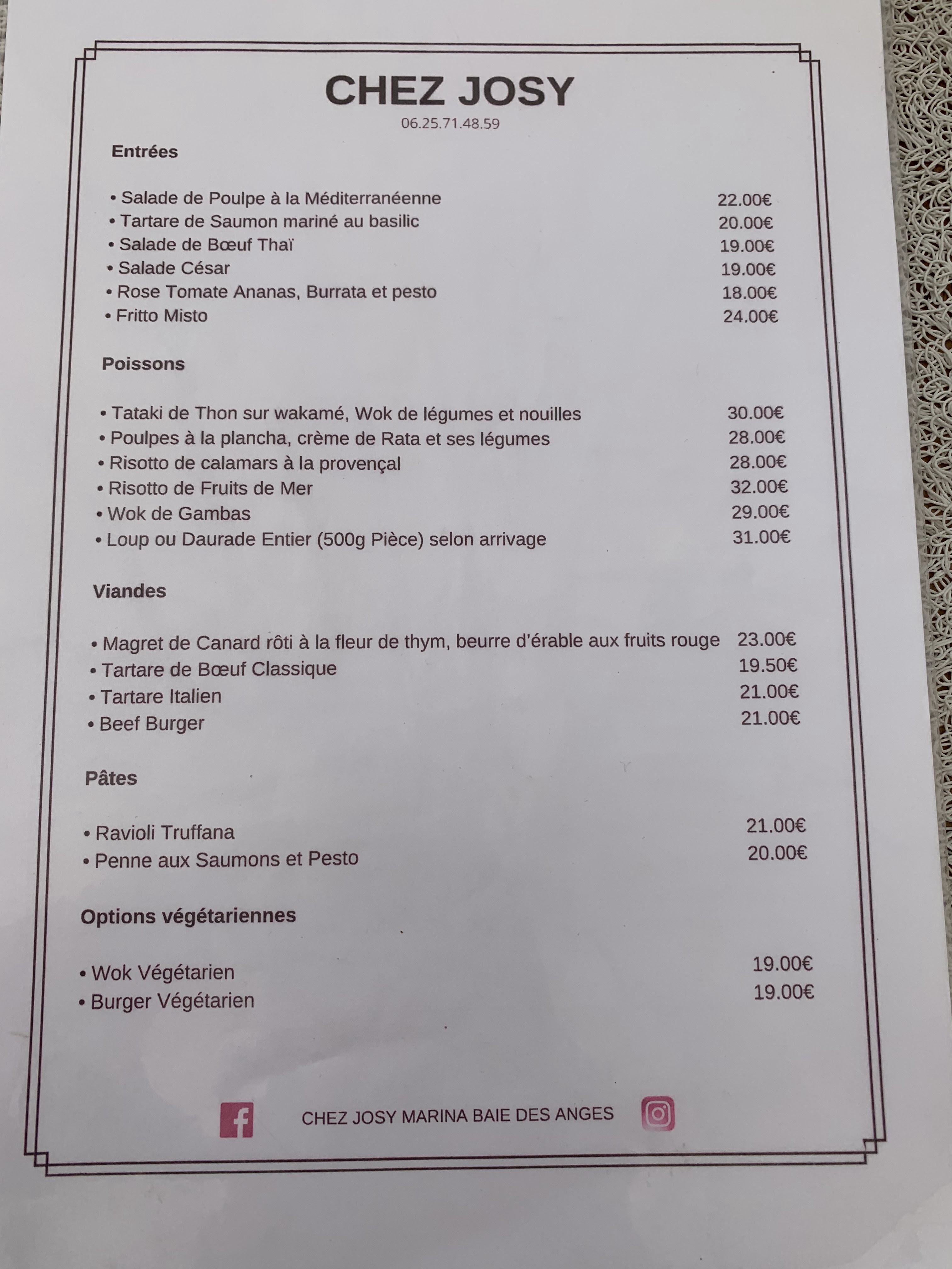 Scandaleux !!!!des tarifs qui ne correspondent pas à la qualité 22 euro pour une salade cesar!! De la salade jetée sur une assiette 1 œuf dur 4 morceaux de tomate Du poulet immangeable !!! De l’assaisonnement vinaigrette industrielle !!! Bon appétit !!! Dommage Je préférais Josy d avant….