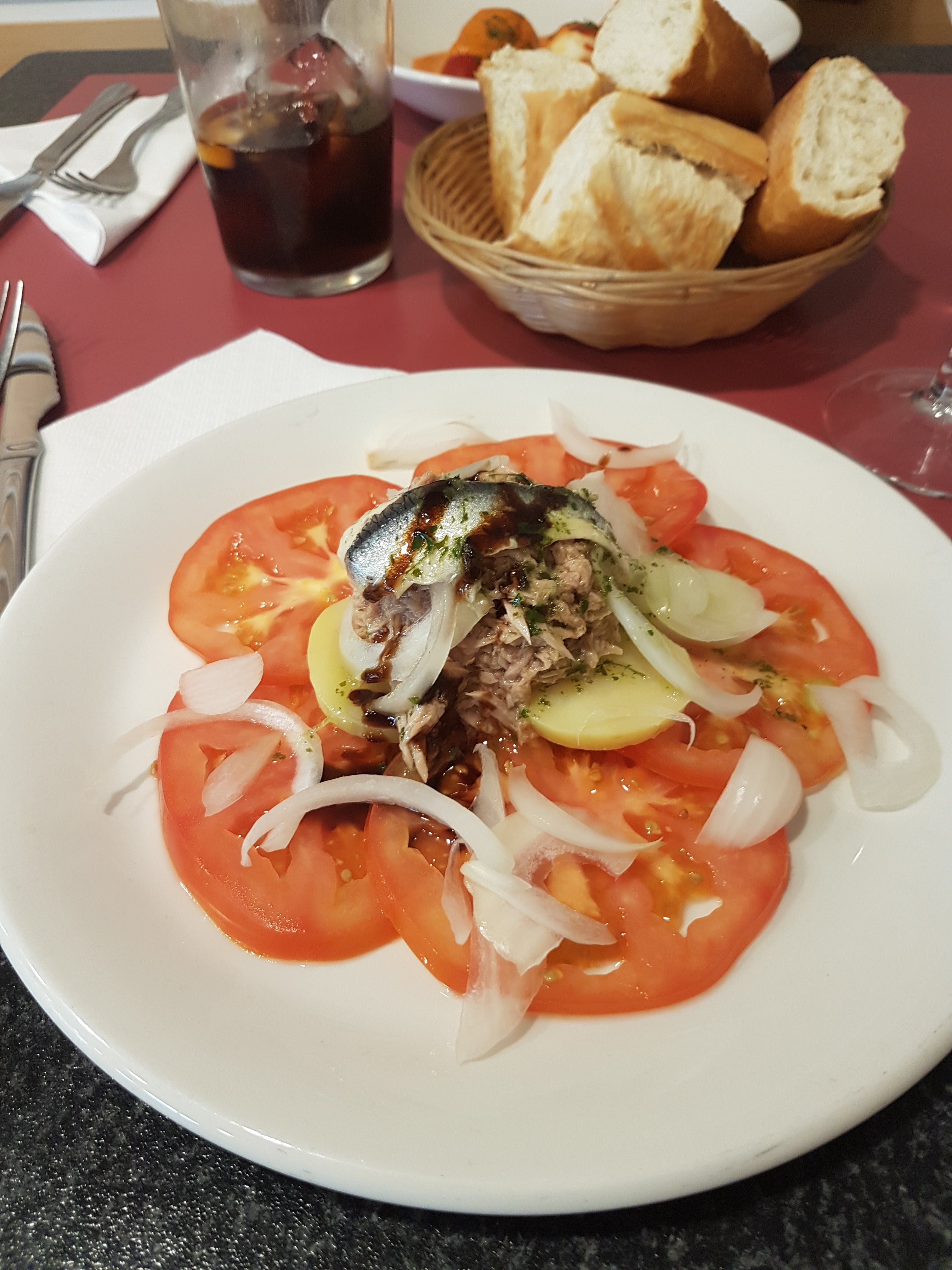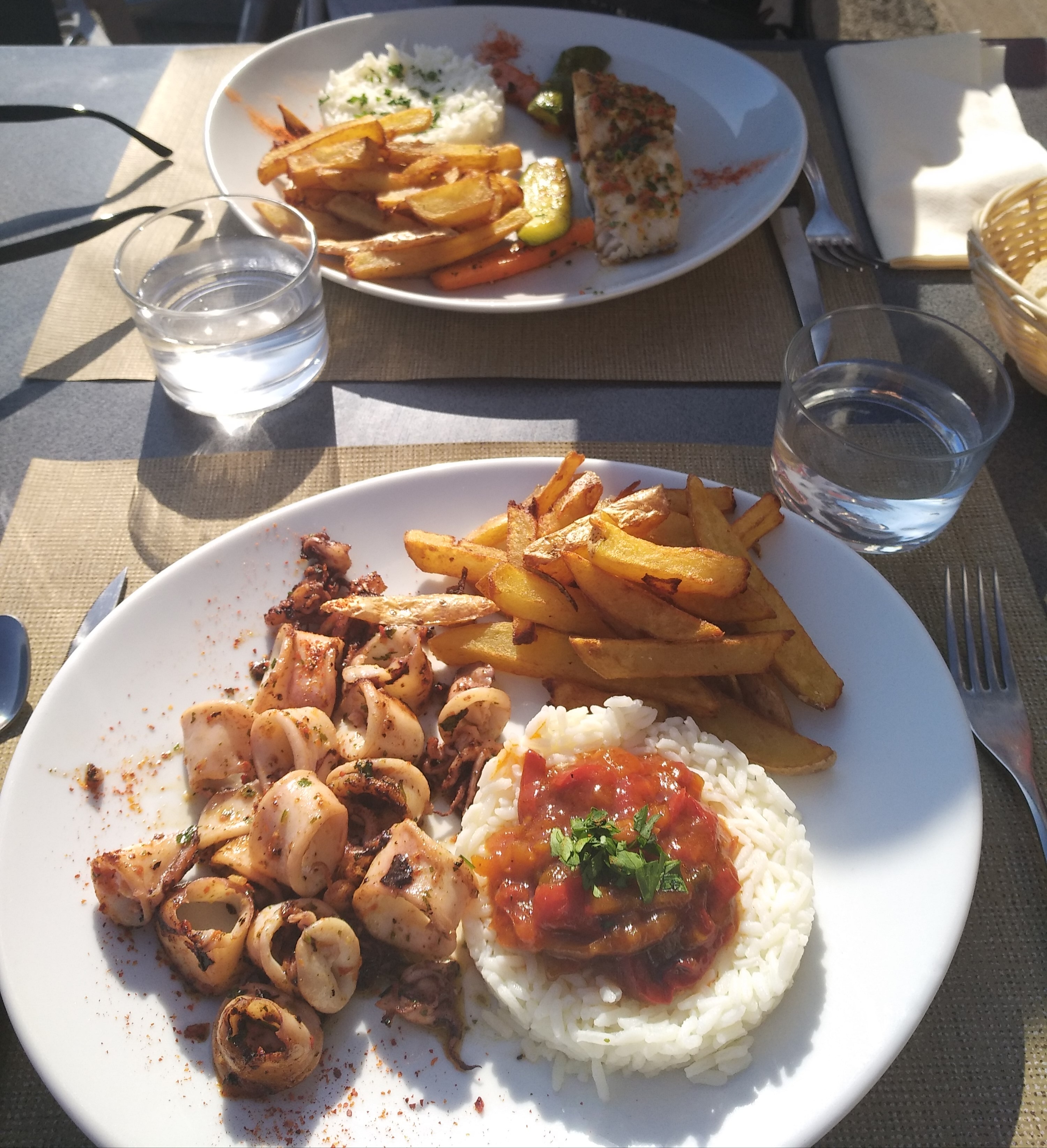 Restauration assez simple, de poissons et de fruits de mer principalement. Les plats changent visiblement fréquemment et varient selon la saison. L'intérieur n'est pas très joli, mais la terrasse est très agréable. Sur la photo, le plat de chipirons que j'avais commandé. Pour résumer, ne vous fiez pas à la simplicité apparente du resto. On y mange bien, mieux en tout cas à mon avis que dans d'autres des endroits du coin.