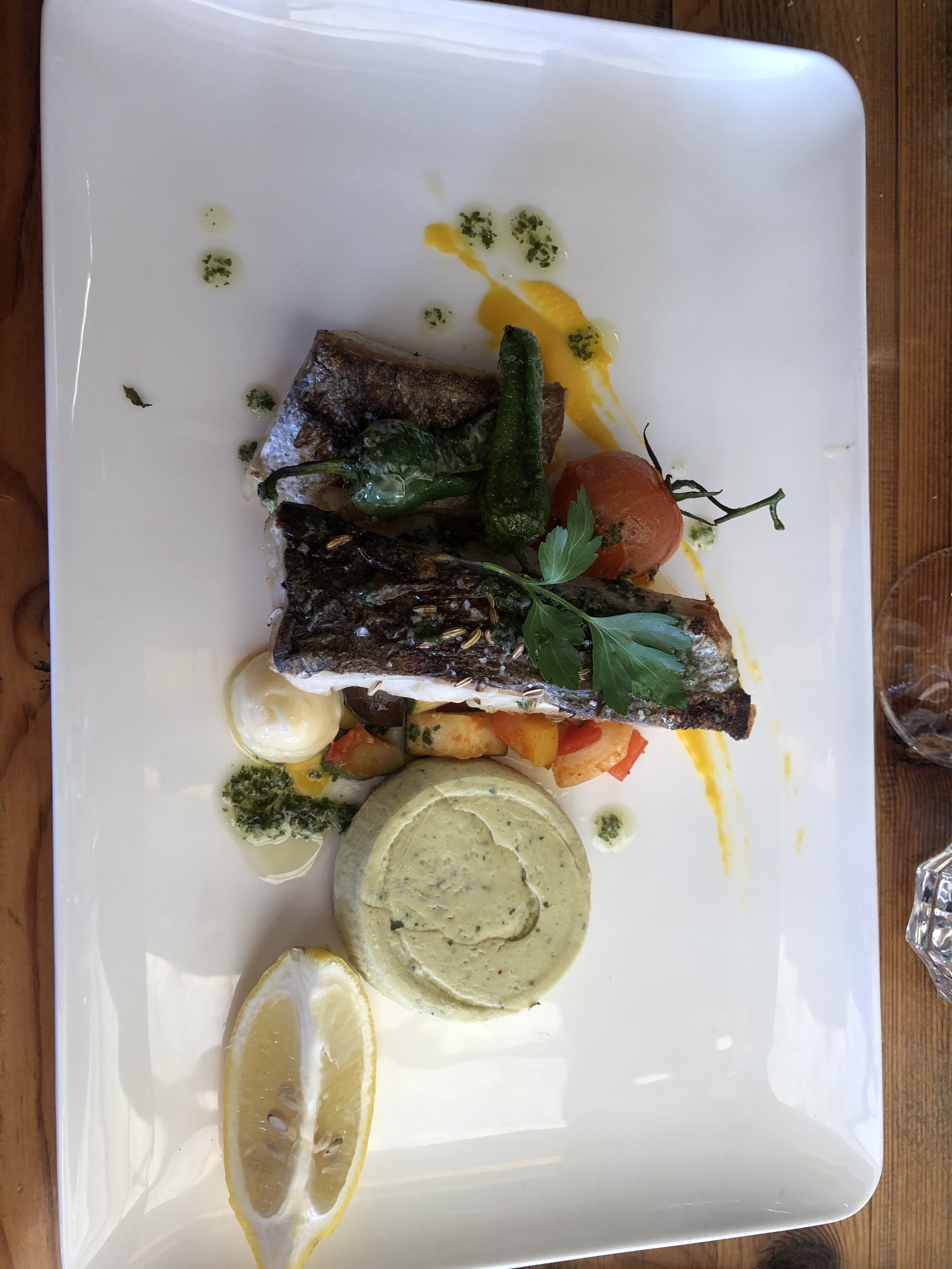 Quelle belle trouvaille dans ce joli village. Le poisson était le meilleur que j'ai eu. C'était un trio d'Espadon, Dorada et autre chose, avec des légumes et de magnifiques pommes de terre dauphinoises. Délice