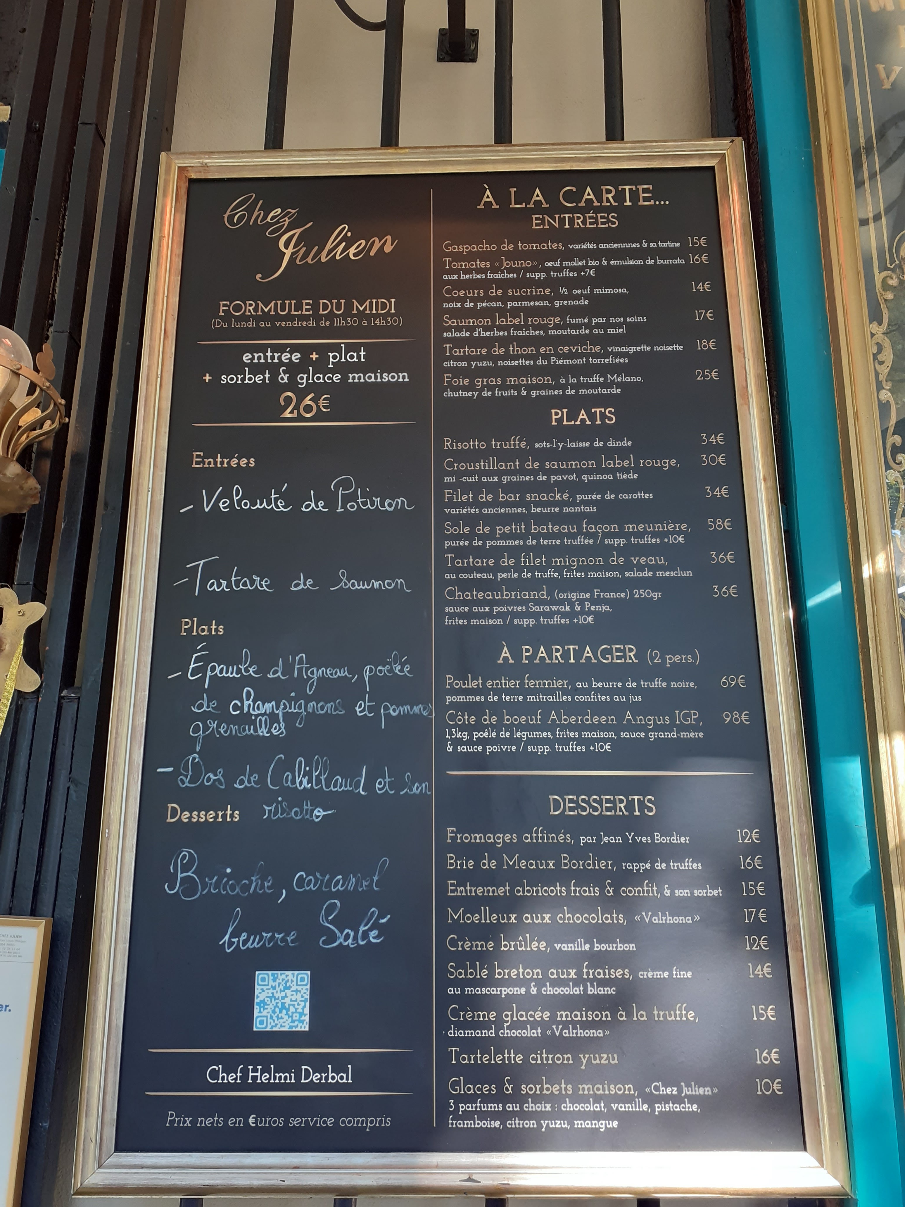 Chez Julien est un des nos restaurants préférés et ne nous déçue jamais. Cuisine de qualité servi dans un terrasse ensoleillée et tranquille, sur un rue piéton, ce qui est très rare à Paris, au début du Marais. Déjeuner de Pâques magnifique, épaule d'agneau délicieuse. Je recommande sûrement.