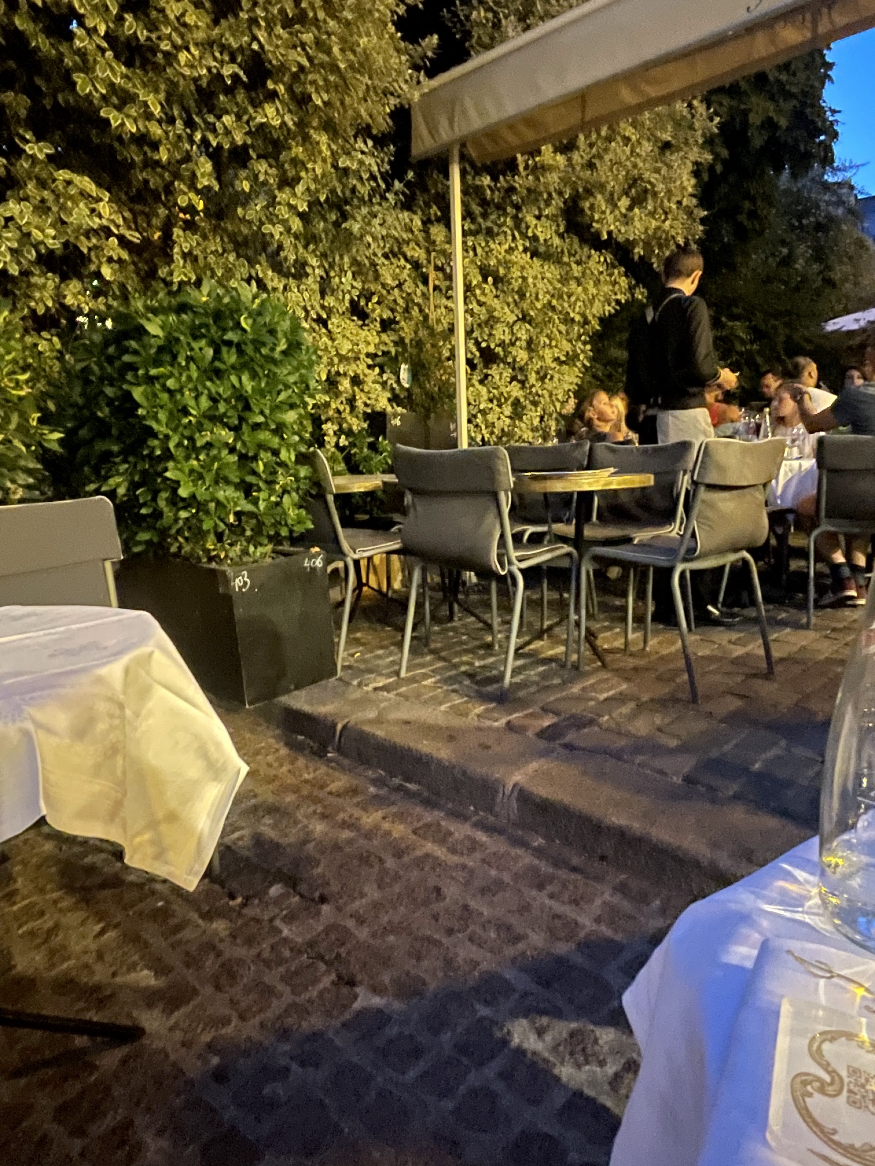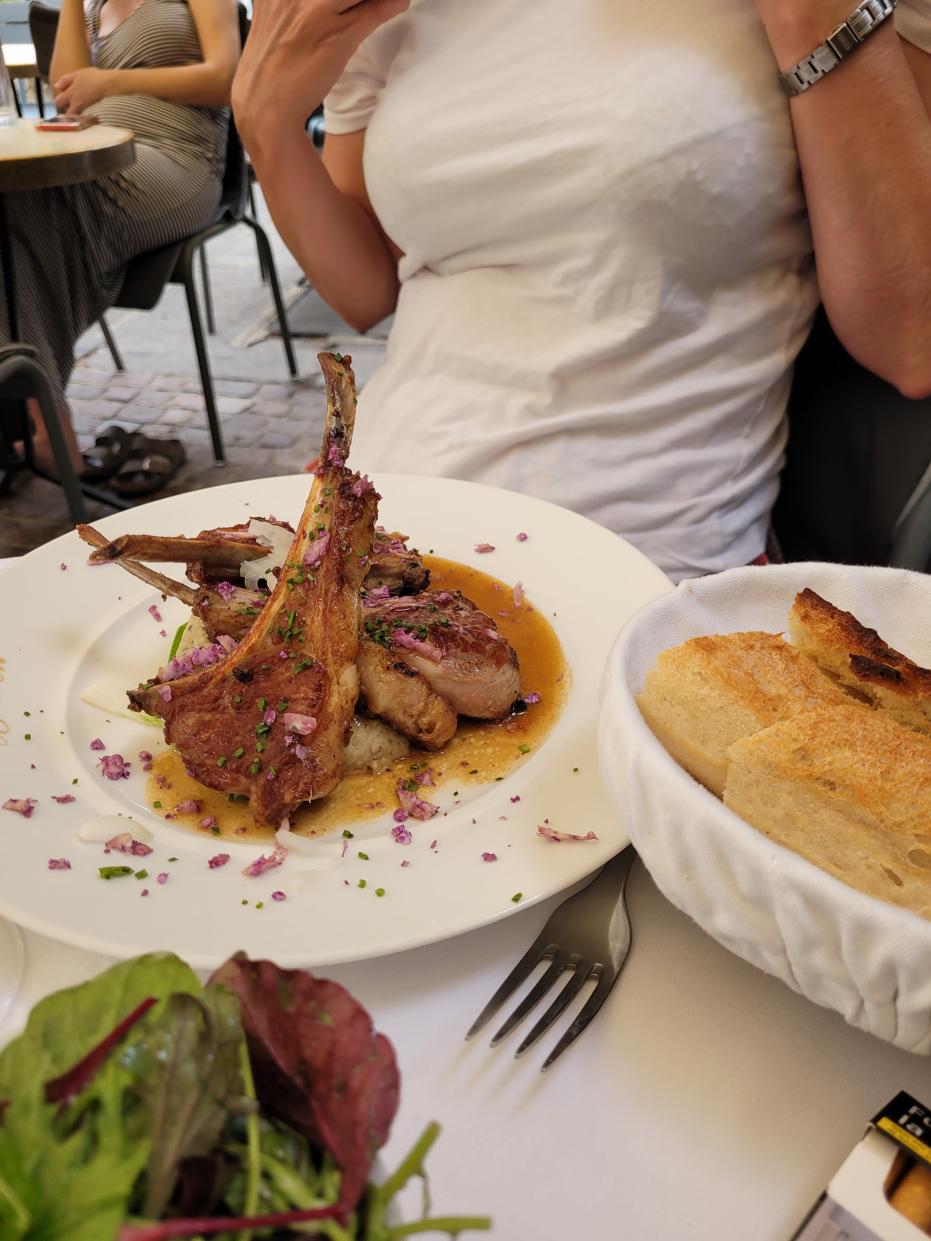 Nourriture: 1. Apéritif : pas de commentaire puisque nous n’en avons pas pris, mais nous aurions dû 2. Plat principal: l'agneau était bon et était accompagné d'un accompagnement de purée de pommes de terre. Le risotto était petit et il y avait tellement de plat d'accompagnement 3. Dessert : le meilleur du repas, il était exceptionnel Ambiance : j'avais réservé une table à l'avance et j'étais assis dehors. Inutile de dire que j’ai été très déçu et j’ai demandé s’il y avait de la place à l’intérieur du restaurant, mais ce n’était pas le cas. J'ai failli partir à cause de ça et je ne reviendrai pas si je suis assis dehors pendant l'hiver et que les tables étaient à l'étroit. On m'a donné une couverture au cas où j'aurais froid…