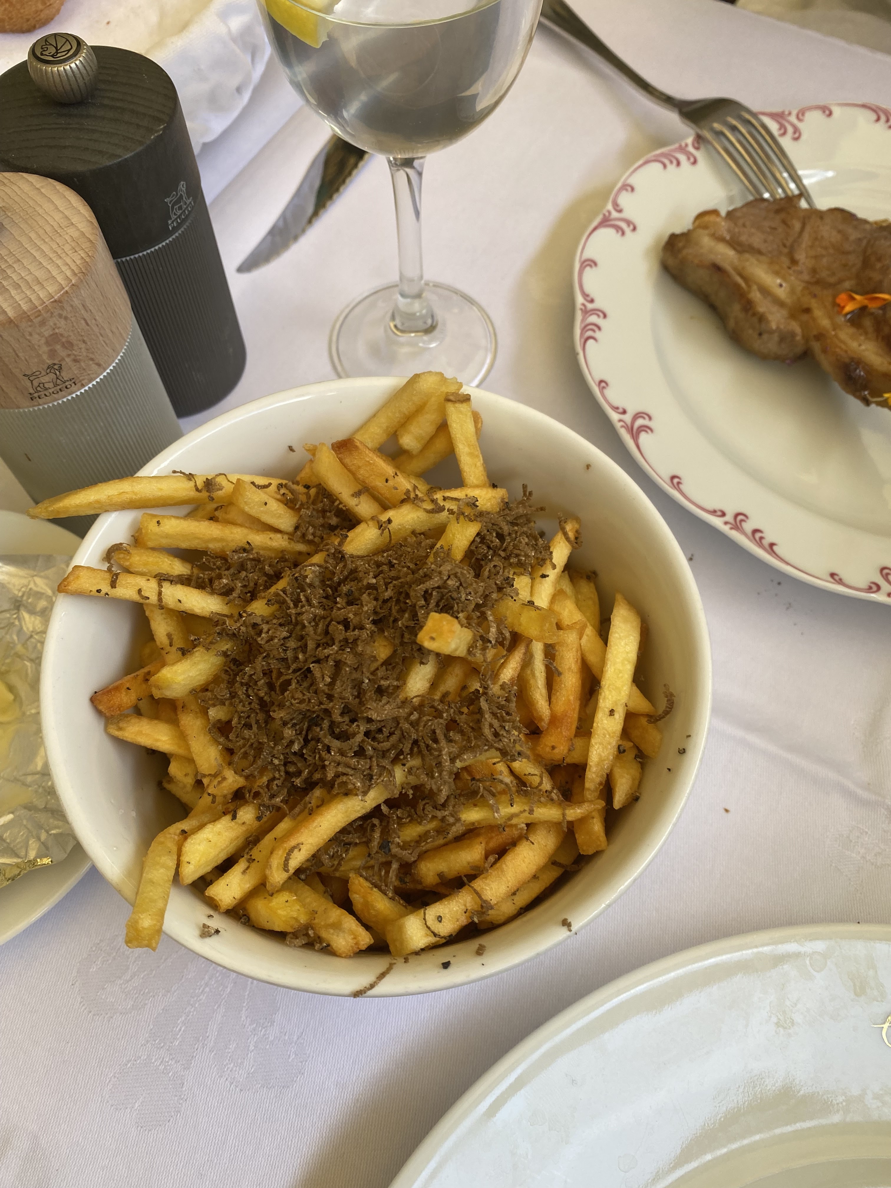 J'étais confus à la fin lorsque j'ai reçu le reçu de paiement. Il y avait des X2 couverts sans prix et le vin je commande une bouteille différente. Je devrais mieux vérifier la prochaine fois. Le menu était entièrement en français. Je ne comprends qu'un peu ! Le grand patron est venu et a essayé de résoudre le problème. Bonne attitude! 👍 Ma recommandation est de laisser UN serveur prendre une table. J'ai été servi par 3 personnes différentes. À mon avis, cela crée une confusion. Je reviendrai pour manger ce steak français (1 kg). D'ailleurs, les MEILLEURES frites de toute la France. Super environnement. J'ai vraiment ressenti l'ambiance d'être dans un restaurant français normal.