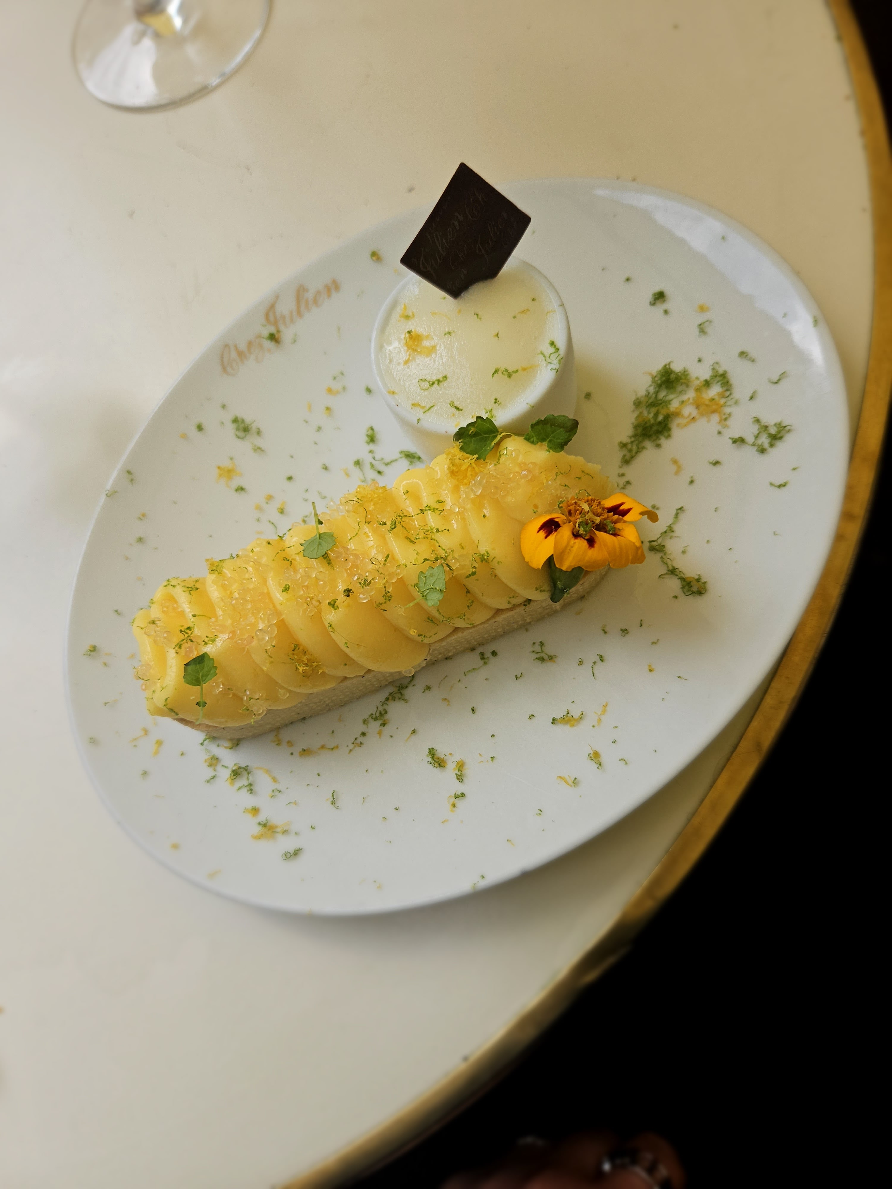 Une très belle expérience chez Julien. J'ai visité après une cérémonie de mariage et tout était fantastique 💜 À mon arrivée, on m'a offert une coupe de champagne 🥂 et une sélection de bouchées. Le brunch était varié et savoureux ! J'ai opté pour l'entrée burrata et tomates, suivie d'un plat de poisson et de crème brûlée pour terminer le repas. Mon vin rosé était parfait pour accompagner le repas. Quelle belle expérience ! Je recommande vivement et je reviendrai à Paris ! 🇫🇷