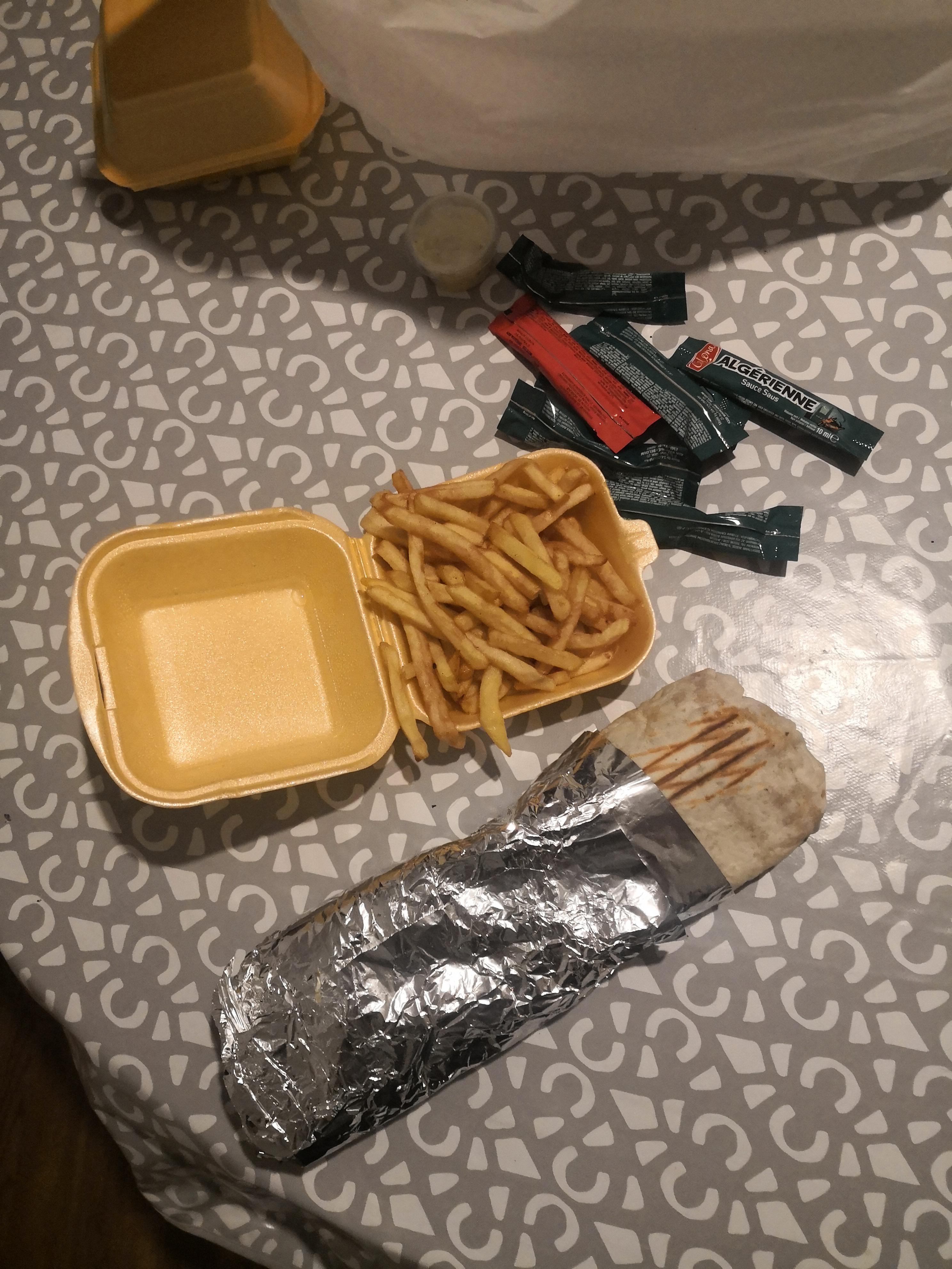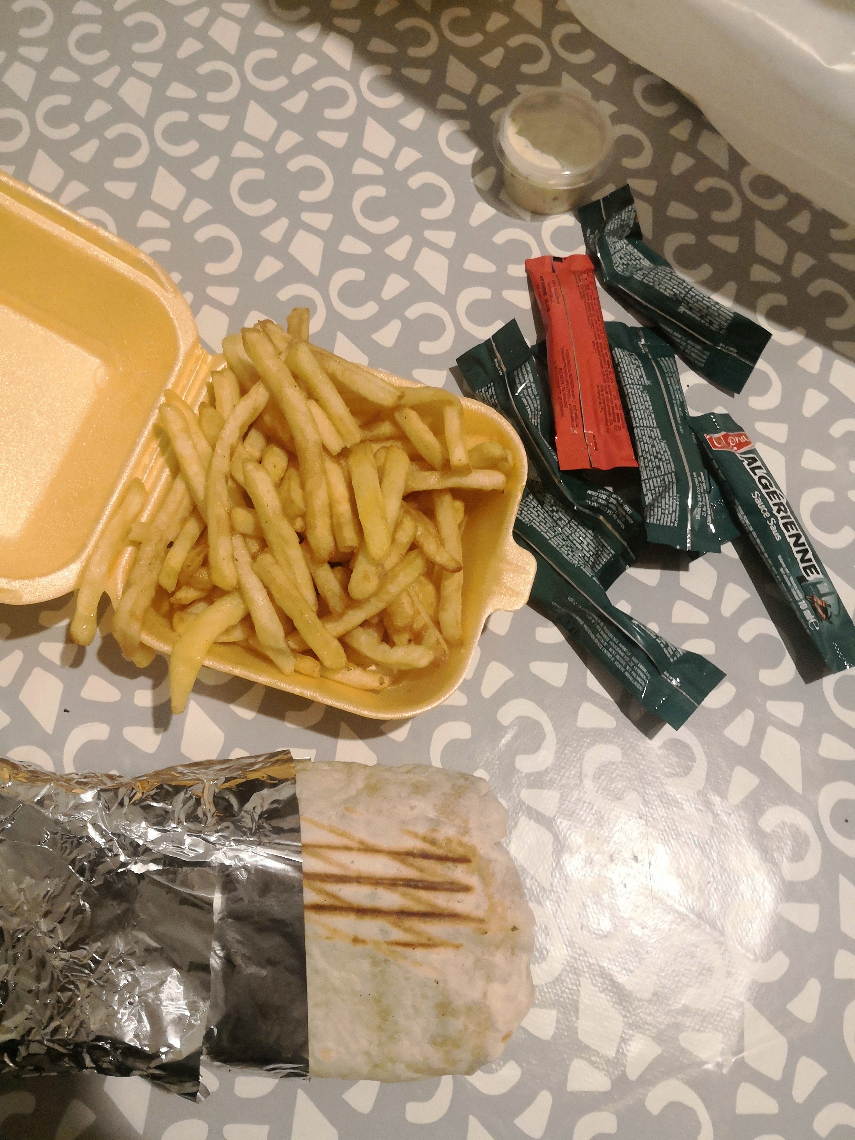 Déjà que c'est bidon, on y vient parce que ça ferme tard, pas trop le choix dans cette cambrousse, mais le problème, c'est qu'ils s'en fichent des commandes, non seulement, c'est pas cuit, comme je le souhaite, ils mettent de la salade dans le tacos, et pas de frites, on aura tout vu, c'est l'inverse les amis, pas de salade, mais avec des frites.