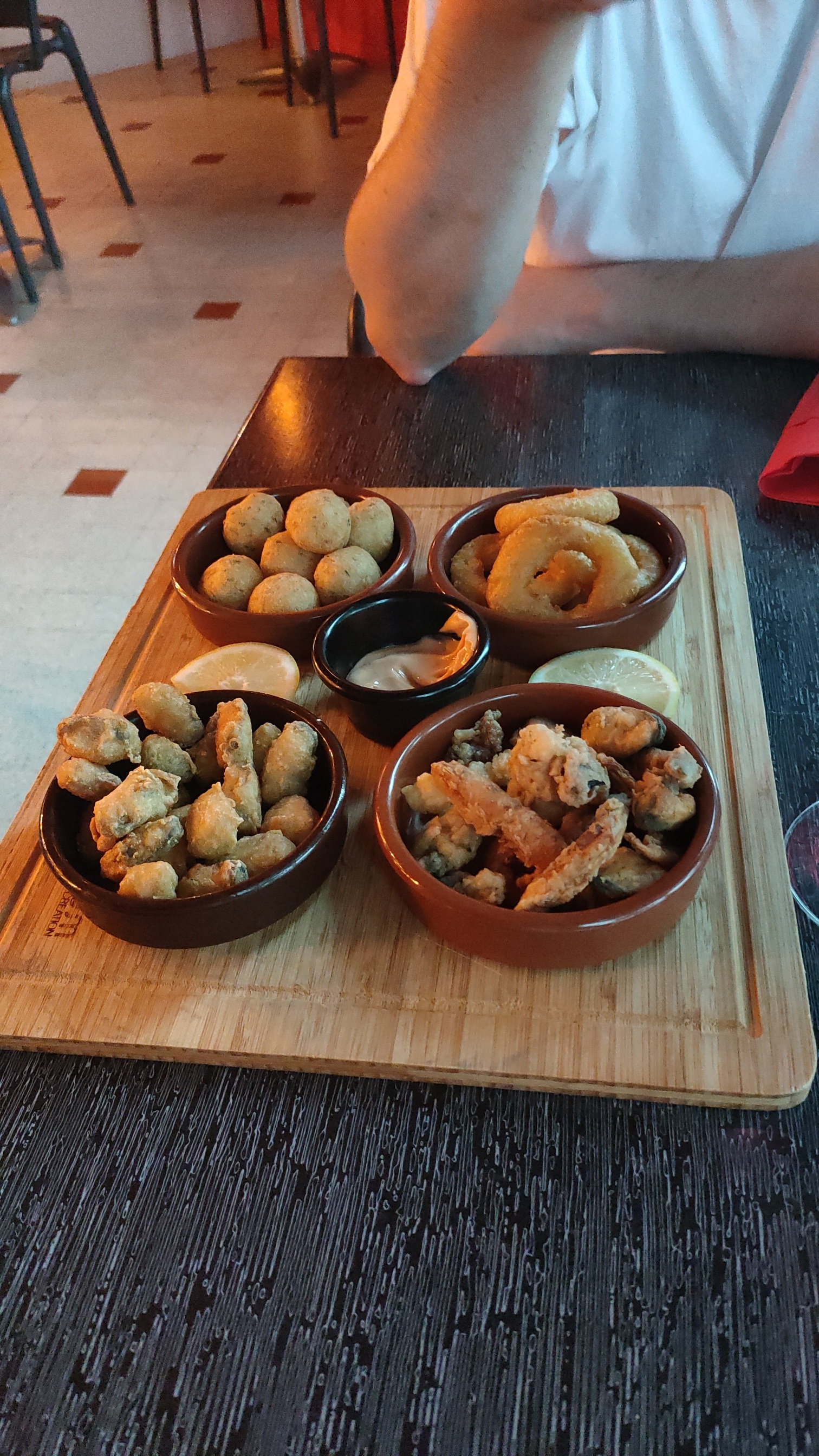 Tapas et fish ans chips. Assez surprise vue les commentaires positifs... J'ai été déçu par les frites dites maison qui avaient l'air clairement surgelés. Est ce a cause des férias de Soustons par manque de temps ? Pas d'ambiance feria dans le restaurant d'ailleurs. Pour les tapas de la mer, les acras n'ont vraiment pas le goût de morue mais plutôt comme des pommes dauphine. La piperade par contre était excellente.