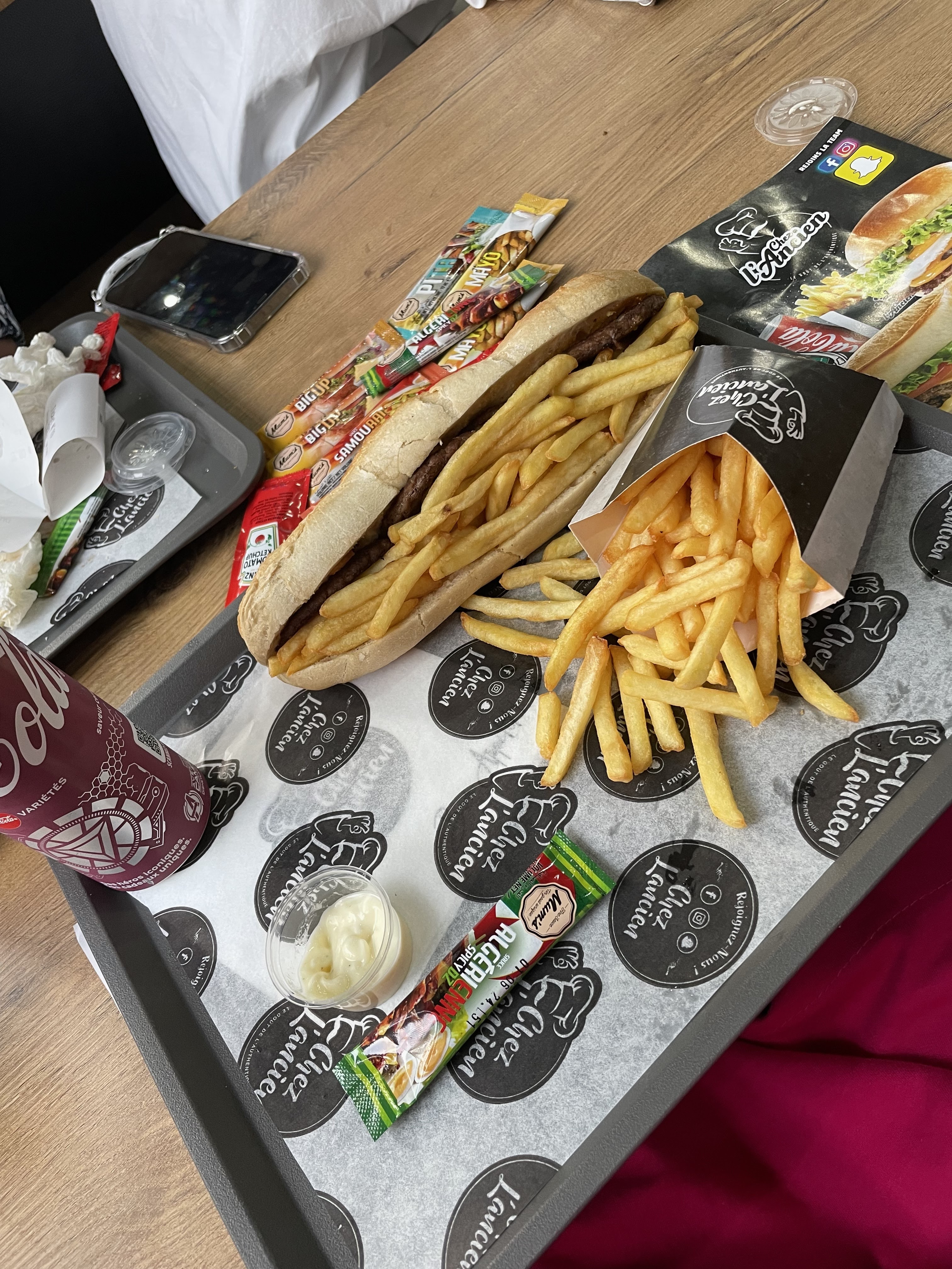 Nouveau fast food sur Meyzieu. J'ai voulu le tester, nous avons donc pris un menu sandwich merguez et un menu sandwich poulet. Les sandwich sont assez petits, ça saute aux yeux quand on ouvre le sac, cependant ils restent plus ou moins consistants, ce dépendra des ventres de chacun. Sandwich merguez : 3 merguez dedans dont 2 qui n'ont pas le goût de merguez, c'est bizarre... Sandwich poulet : simple et efficace. Nous avons pris un genre de toast qui lui était super bon mais assez cher, 4€ pour un toast que j'ai mangé en 3-4 crocs 😭. Les frites sont sans intérêt. Pour conclure, c'est n'est pas mauvais mais ce n'est pas super non plus pour le prix. J'y retournerai cependant pour tester le sandwich bavette par curiosité.