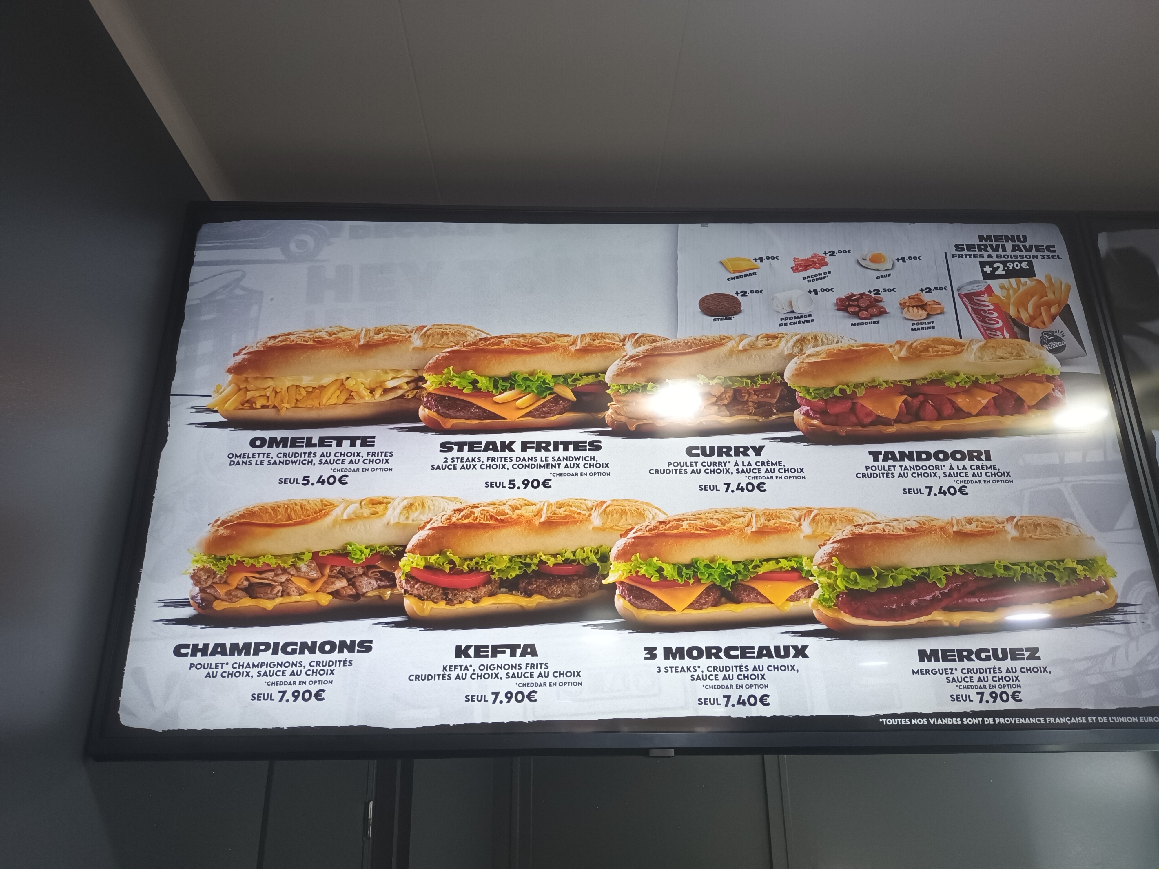 Prix exorbitant, peu de viande dans le sandwich(bavette). Salade tomate oignon idem, très peu de frites, Hygiène niquel, propre, neuf. Pour les grosses faims passer votre chemin, pour les petites bourses passer votre chemin. Menu boisson comprise 11€. L'ancien ma bien arnaquer. A éviter