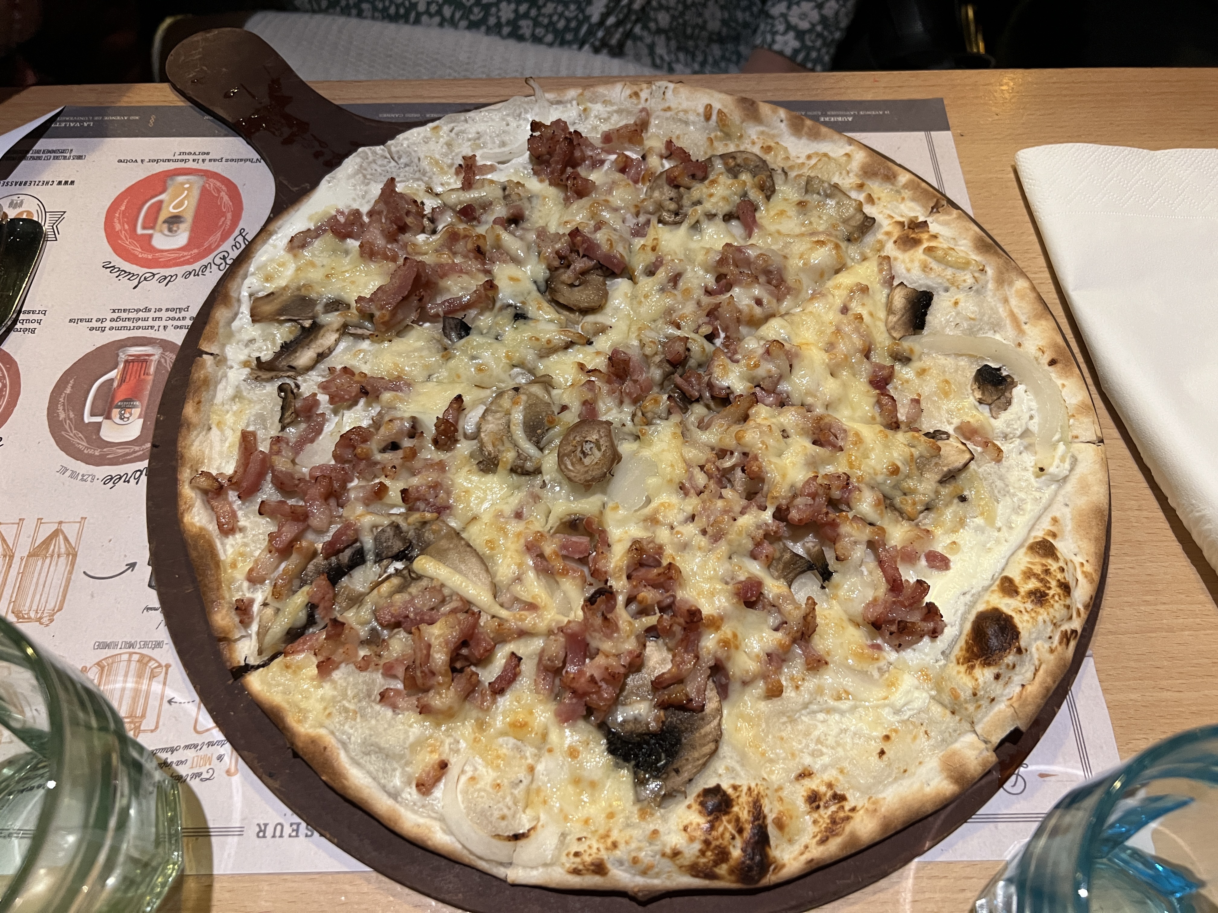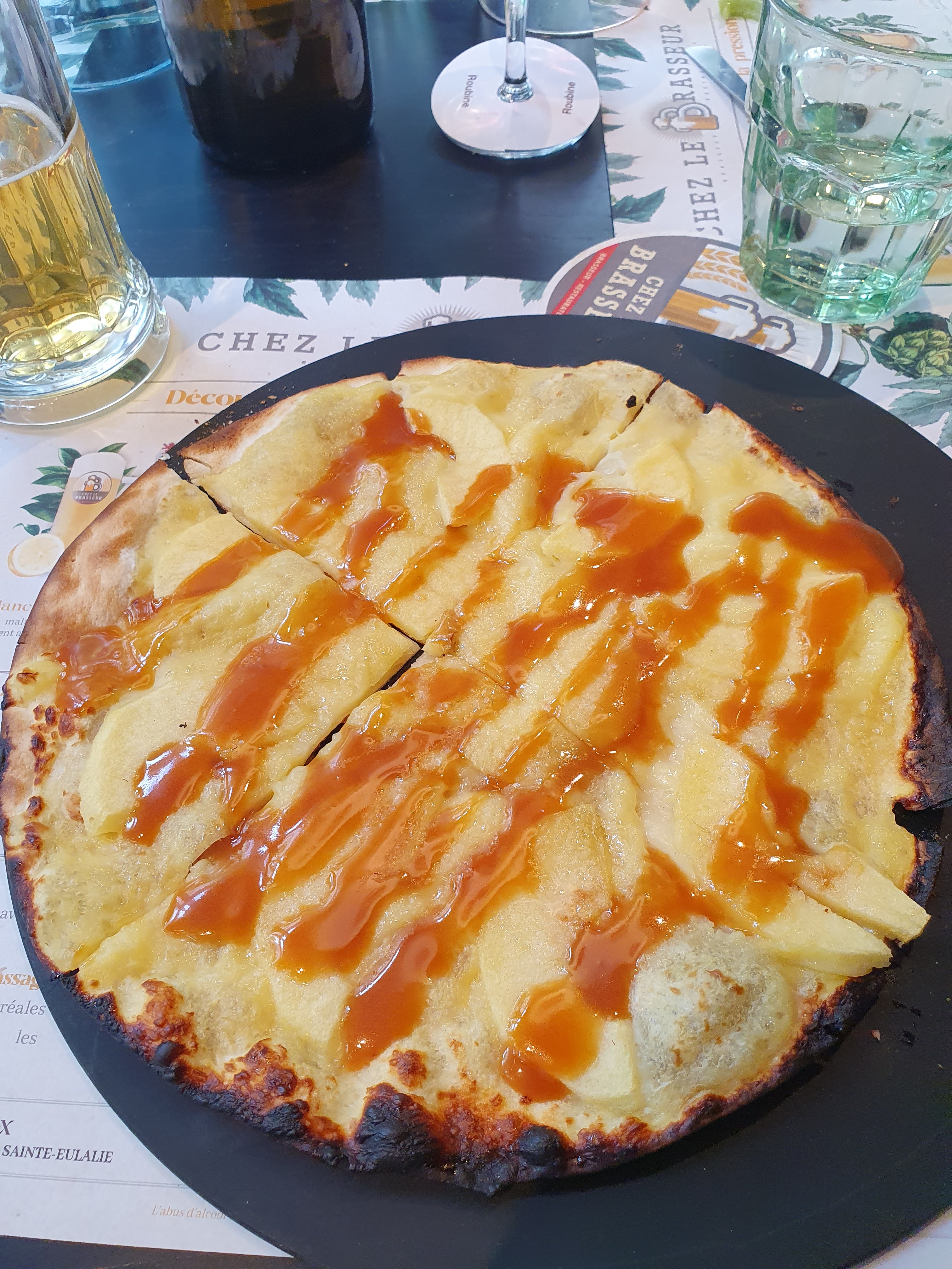 Flammenkuche très généreuse en chèvre excellente !!! Serveurs super sympas, déco super sympa également je recommande +++