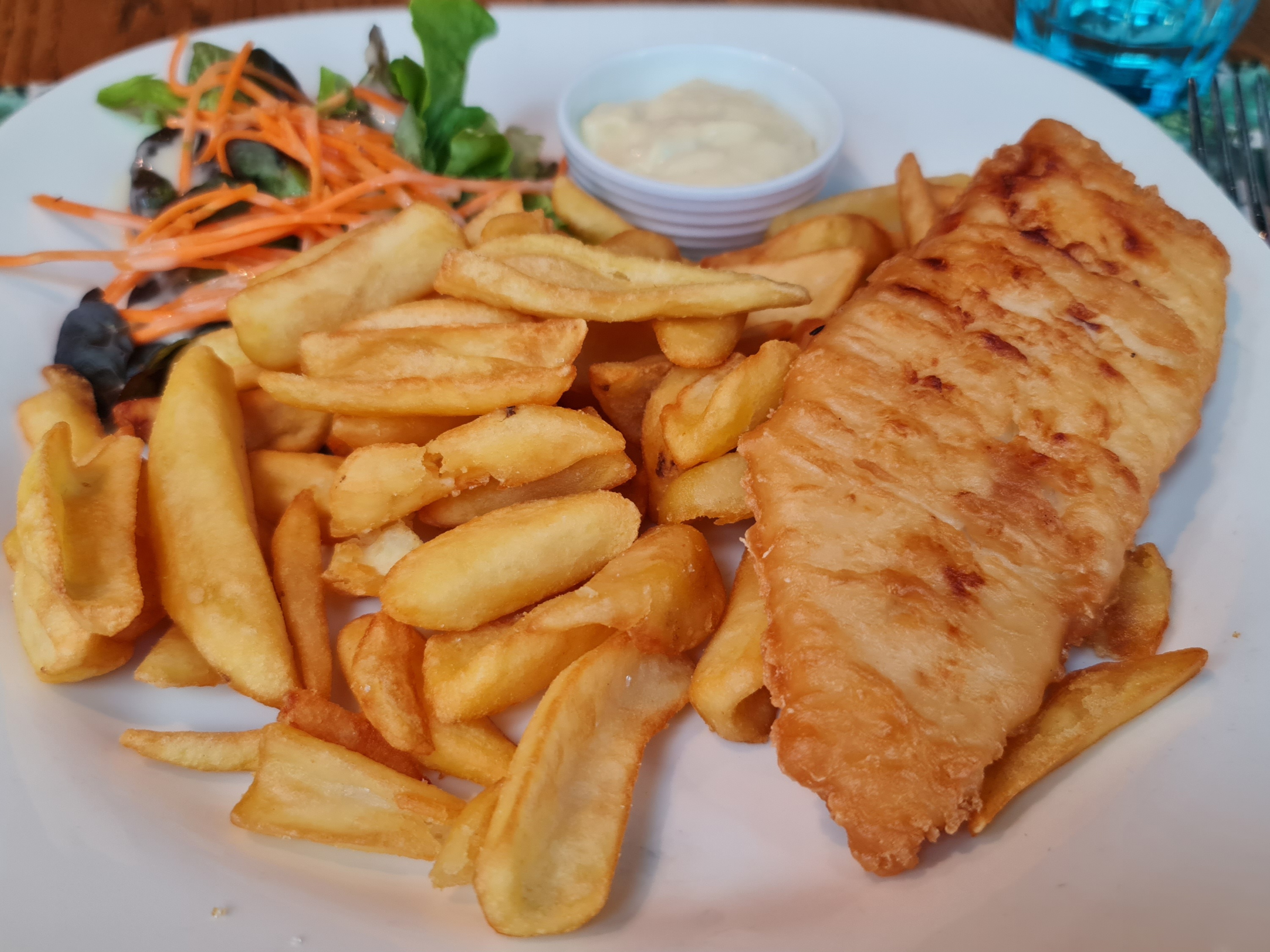 Si tu passes devant ne t’arrête pas Fishe and chip gras et recuit salade ayant bien vécu et sans assaisonnement sauce tartare industrielle et même pas des vraies frites ….pour presque 20 euros !! Lamentable