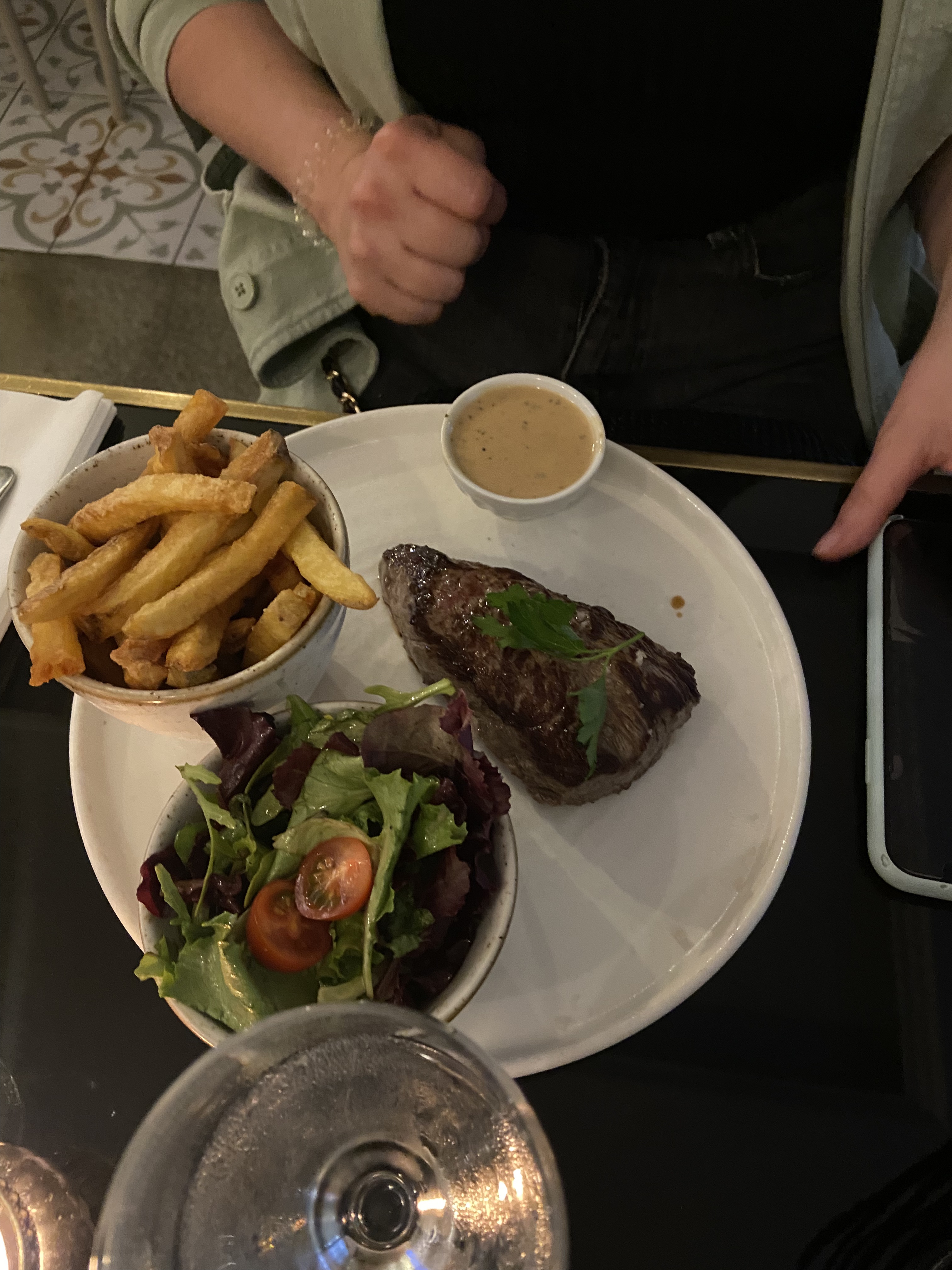 Le steak et les frites étaient vraiment bons et à un prix raisonnable. Le vin et la bière étaient vraiment bons. Le personnel était incroyable, super ambiance avec une expérience française très authentique.