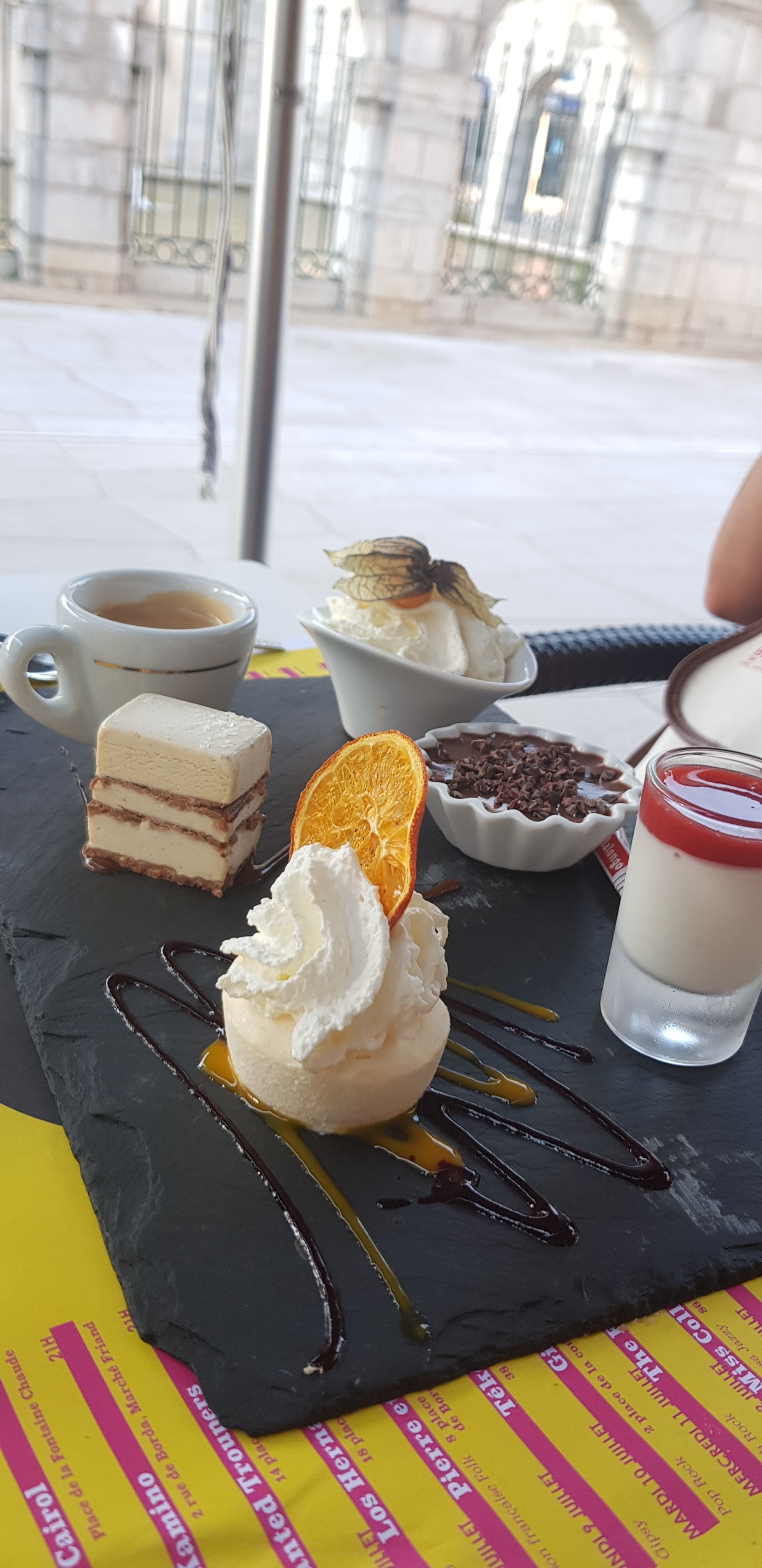 Le succulent Duo d’agneau est une création très originale…! Quand au Café Gourmand: un assortiment de TOUS les desserts: un régal! Bon souvenir de mon passage à Dax et la vue de cette Fontaine antique!