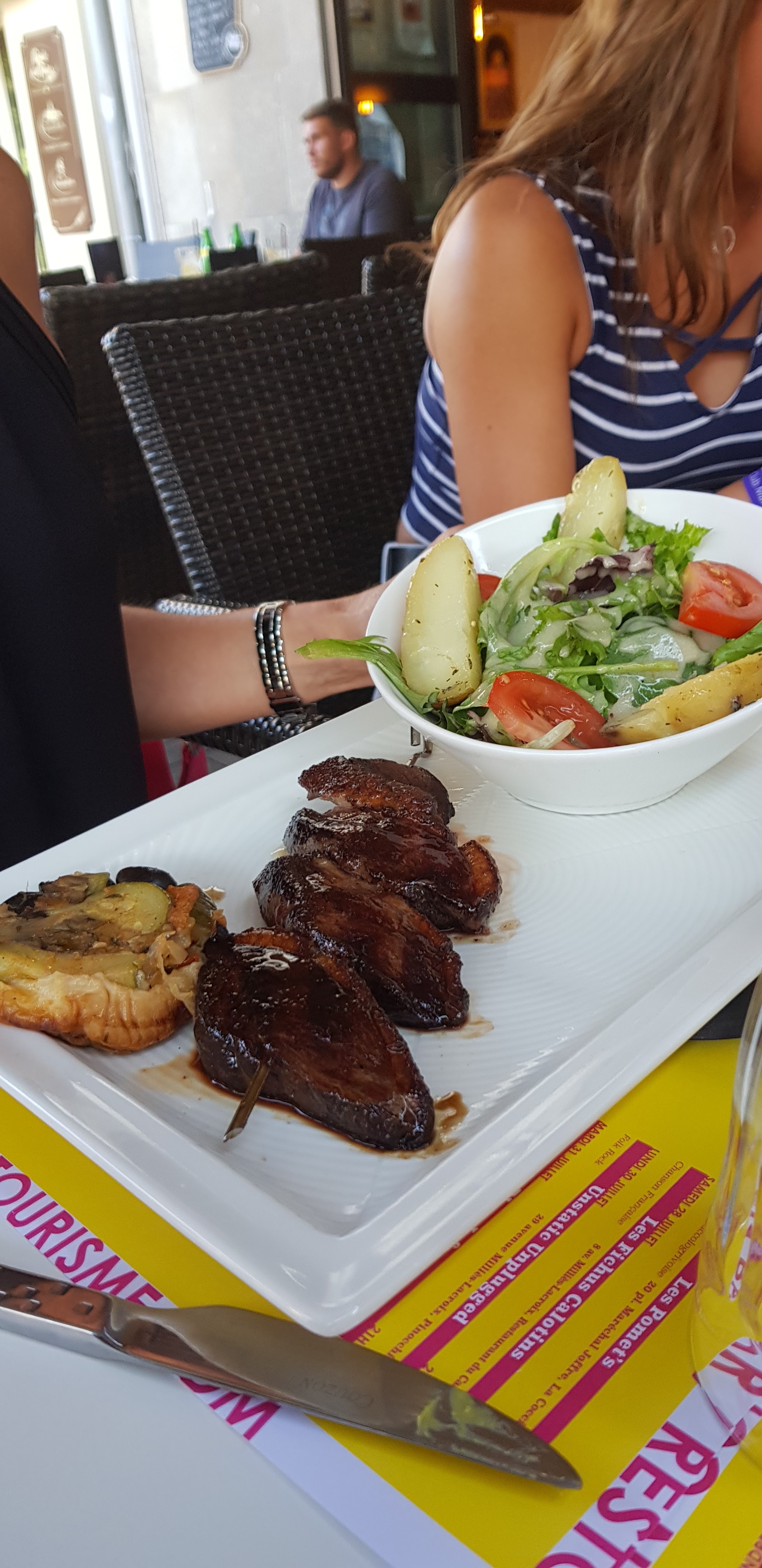 La viande était remplie de nerfs le couteau n'arrivait pas à en venir à bout. Nous étions 2 a avoir la même et la 3 était cuite en semelle à notre demande donc nous ne pouvions pas jugé. Nous avons signalé cette mauvaise viande et n'avons eu que pour réponse C est la viande que nous servons depuis le début de la semaine et il n y a pas eu problème avec les autres clients Très déçu pas de geste du restaurateur
