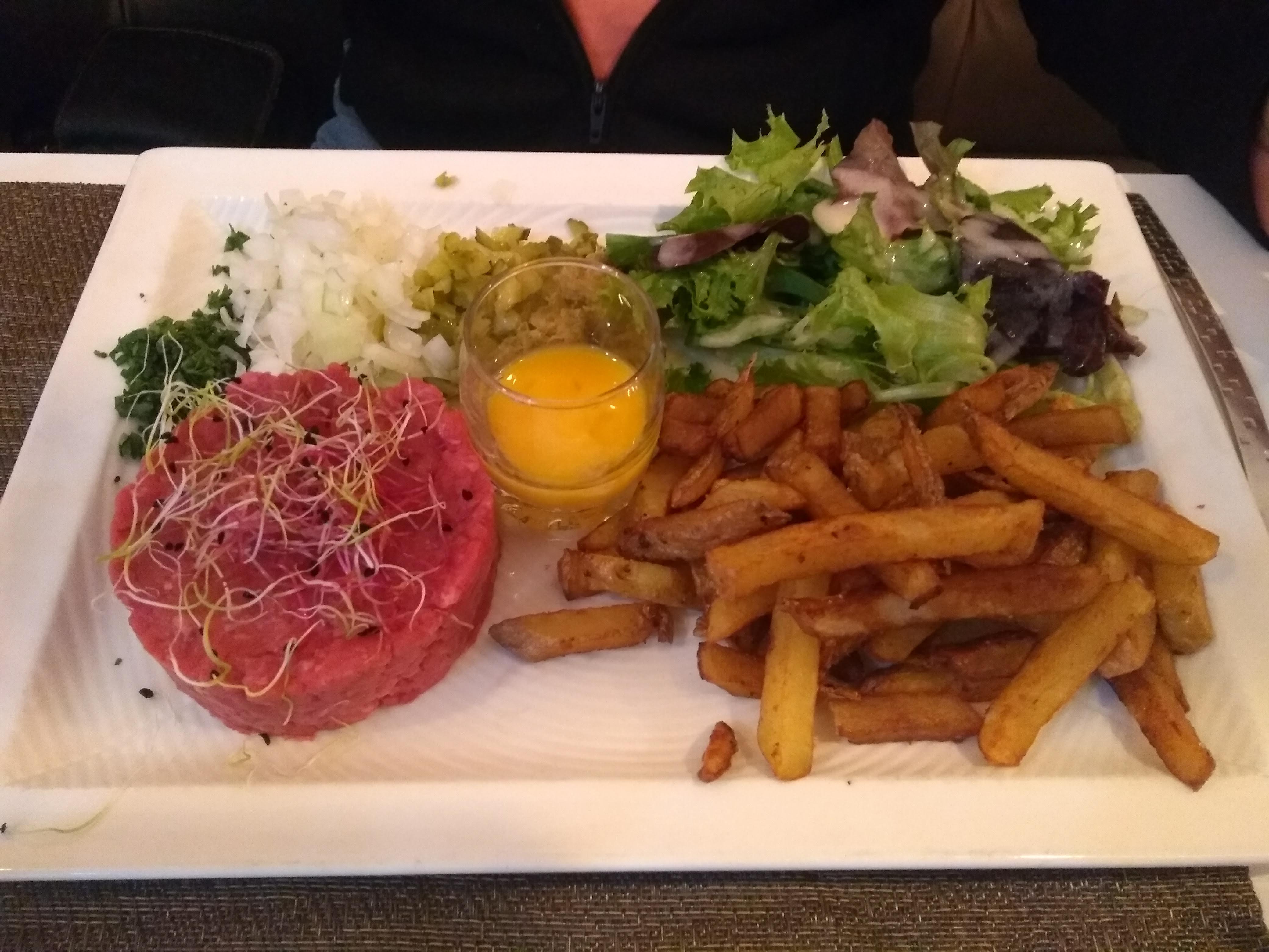 Attente interminable pour avoir la cart et pas de carte de boissons. Chaud froid de fois gras ridicule pour le prix (14e) avec pommes et oignons pas cuits, tartare de boeuf pas assez assaisonné, et oubli d'un œuf cru, service treeeeeessss long : prévoyez des mots croisés. Résumé : rapport qualité prix non justifié, À éviter !