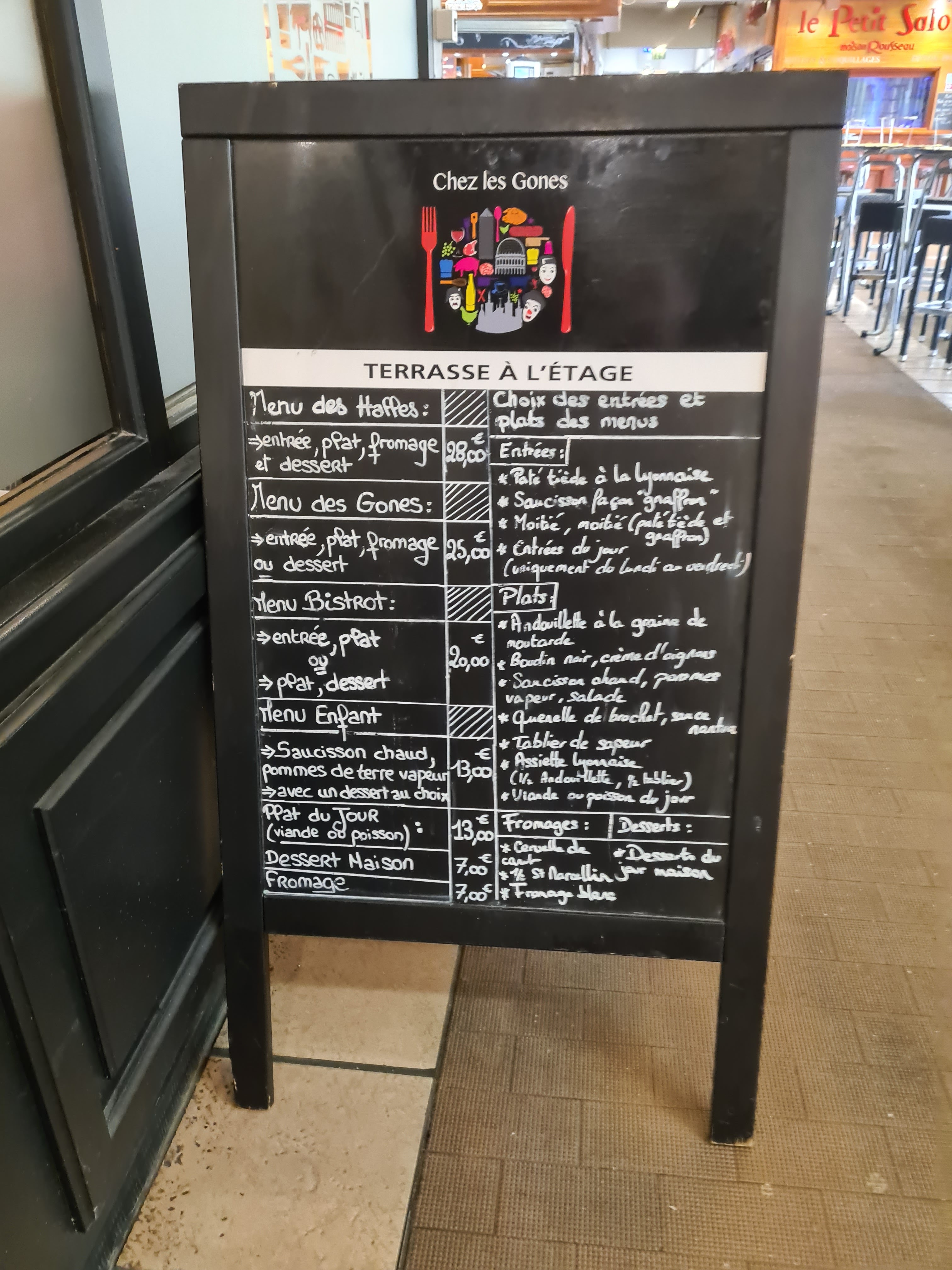 DÉCEVANT !! Habitués des restaurants des Halles,mais ce dimanche avec les petits enfants pas question d’aller chez Rousseau, Merle ou .... On se rabat sur chez les GONES, à l’etage Une serveuse antipathique, non souriante, sans dialogue Une demi heure d’attente pour avoir une carafe d’eau Menus servis - menus enfants 13 euros pour deux patates et 3 petites tranches très minces de saucisson. Andouillettes parfaites Tranche de saucisson trop mince Quenelles lyonnaises : petit gabarit, beaucoup de crème sauce assez liquide, il nous faut exiger des cuillères pour cela - accompagnement : de la polenta assez compact- les 3 adultes ne finissent pas leur portion Dessert : on nous dit, plus de fondant chocolat, uniquement tiramisu ou panacotta Puis finalement, plus de panacotta mais il est retrouvé des fondants chocolat - on prend - assez pâteux d’exterieur et tout juste tiédis Lenteur extrême du service, apparemment insuffisance de personnel Chaque fois, nous devons réclamer pain ou carafe d’eau Règlement au bar du Rez de chaussée La serveuse à détaillé sur sa note les plats un par un si bien que nous sommes obligés d’expliquer que nous avons pris des menus à prix fixes et non des plats sur la carte Au parking, je détaille sur la note une erreur de 4 euros : un menu à 19 euros a été facturé 23 euros ! Une seule visite, mais la dernière chez les GONES - Les Halles méritent mieux que ça ! Nous conserverons nos vieilles habitudes