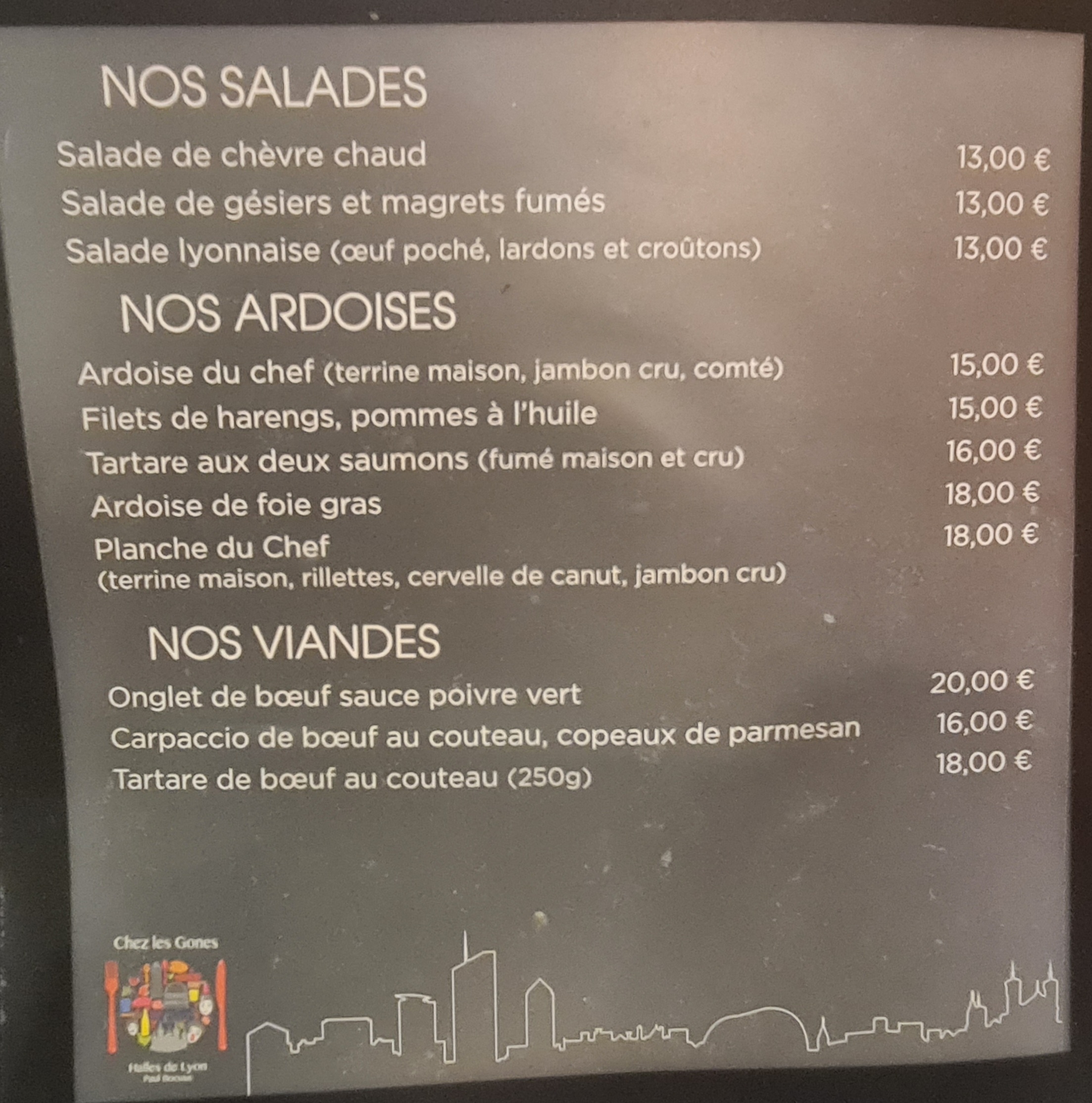 Chez les gones, dans les halles Paul Bocuse, vous trouverez les spécialités Lyonnaises dans une ambiance de camaraderie de comptoir. Petit regret personnel, un coin assis réservé aux touristes vous éloigne du comptoir et vous laisse simple spectateur. A part cela rien à redire. On recommande. BZH