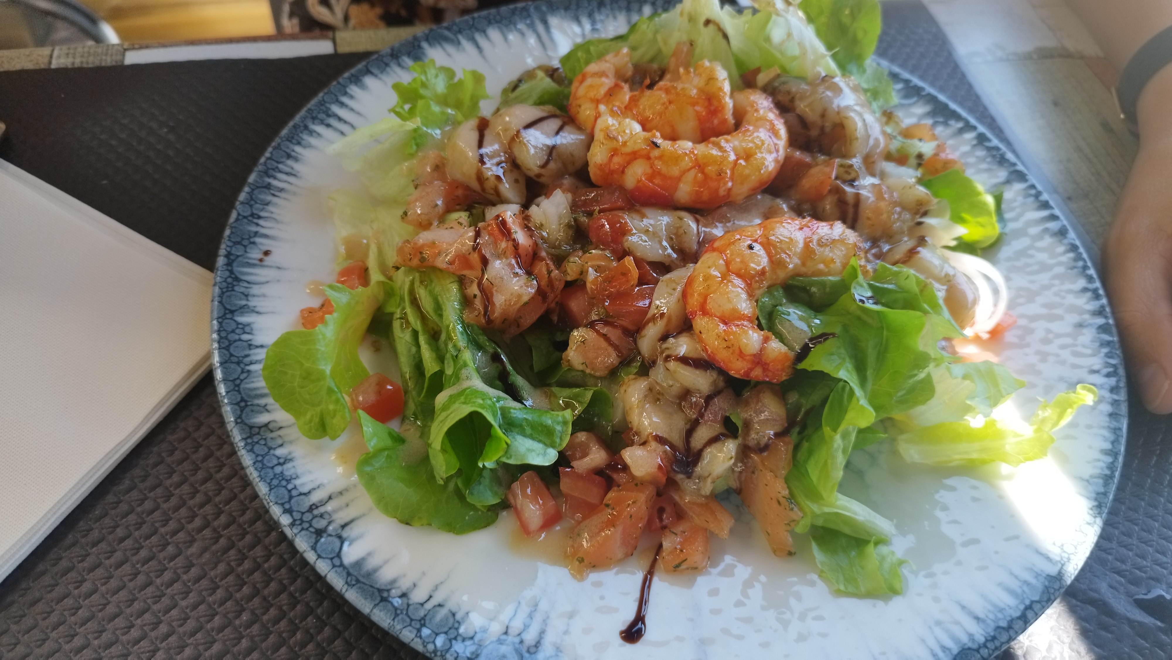 Repas exceptionnel Wok de gambas à tomber ! Légumes croquants... Puis 1 tarte aux pommes avec glace à la vanille Très copieux et surtout très fin...tarte croustillante. Très belle présentation ! La vue est aussi importante que le goût !