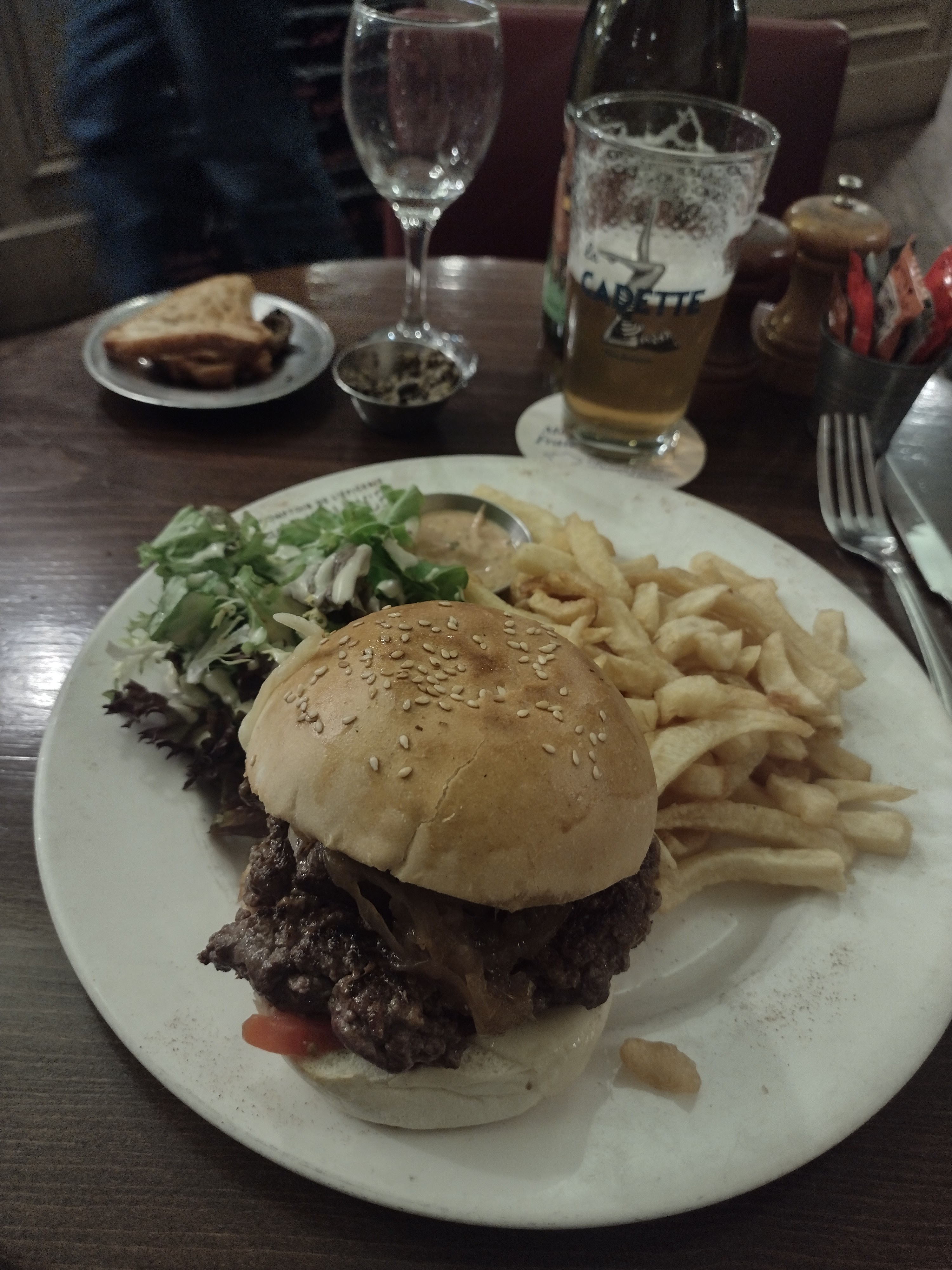 Resto francais pas bon en tous cas pour leur burger ( qui est a un prix raisonnable par rapport aux autres plats ) viande hachée sans aucun goût pas de sel , il rajoute des échalotes sans aucun goût cuit dans l huile , les frites molles de la veille , sauce moutarde et ketchup en petit pot heinz deja ouvert par d autres clients donc on a leur reste et quand on demande a la serveuse des neufs elle nous dit que non en ce moquant de nous ( bonjour le partage de microbes ) et un des cuisiniers qui sort la poubelle et la met devant les tables en terrasse ( bonne appetit , hhhhhh ) je donne 3 étoiles pour la sauce salade avec du goût et relèver , bravo au CHEF des sauces