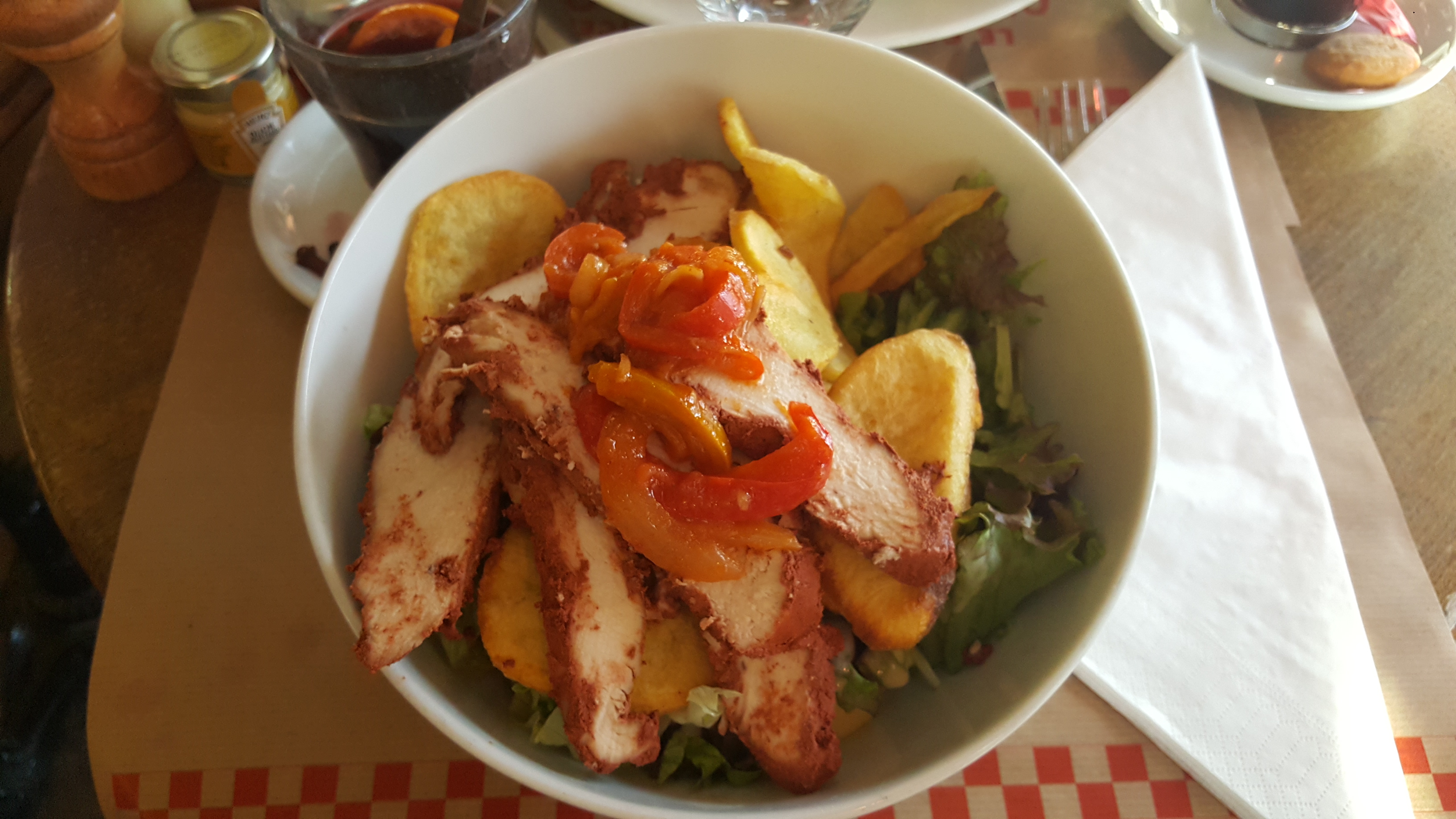 Très déçue par mon plat, une salade indienne avec du blanc de poulet saupoudré d'épices tandori... le vin chaud était très acide. Je ne reviendrai pas.