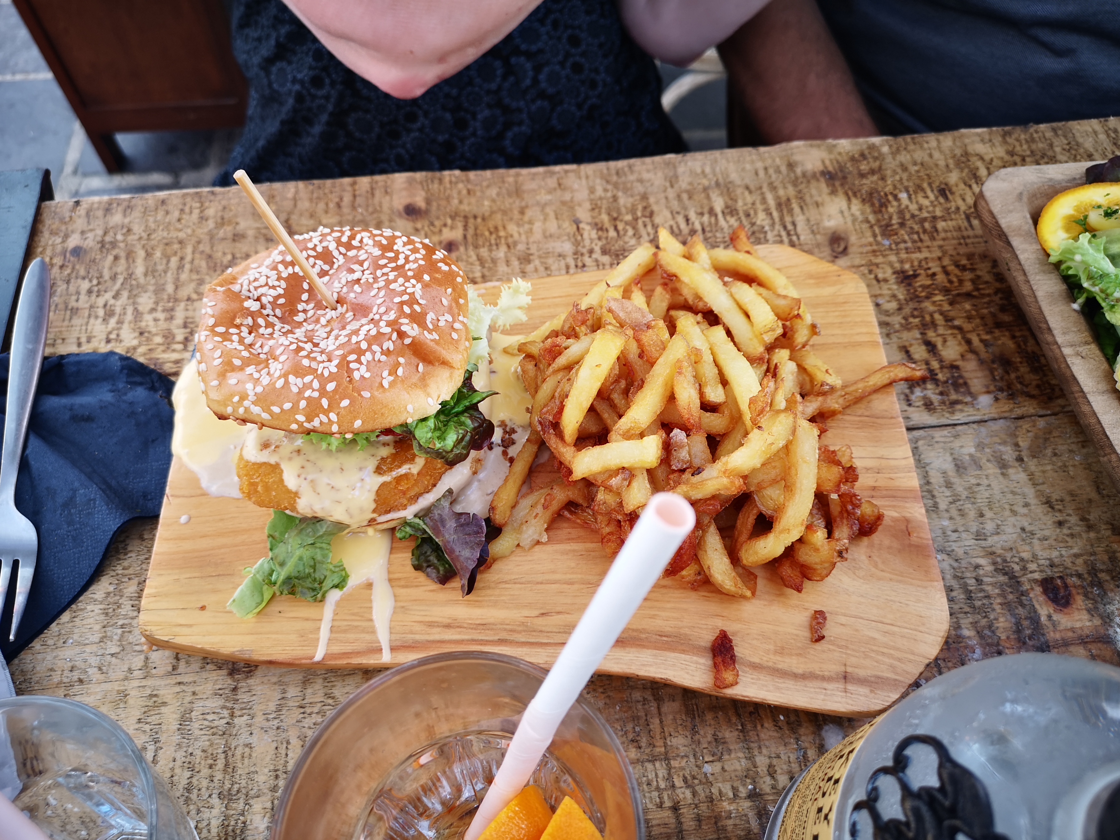 Belle déco Les salades sont peu garnies ( un demi œuf et un blanc de poulet sec) et peu de sauce Hamburger à la salade, une rouille sèche!