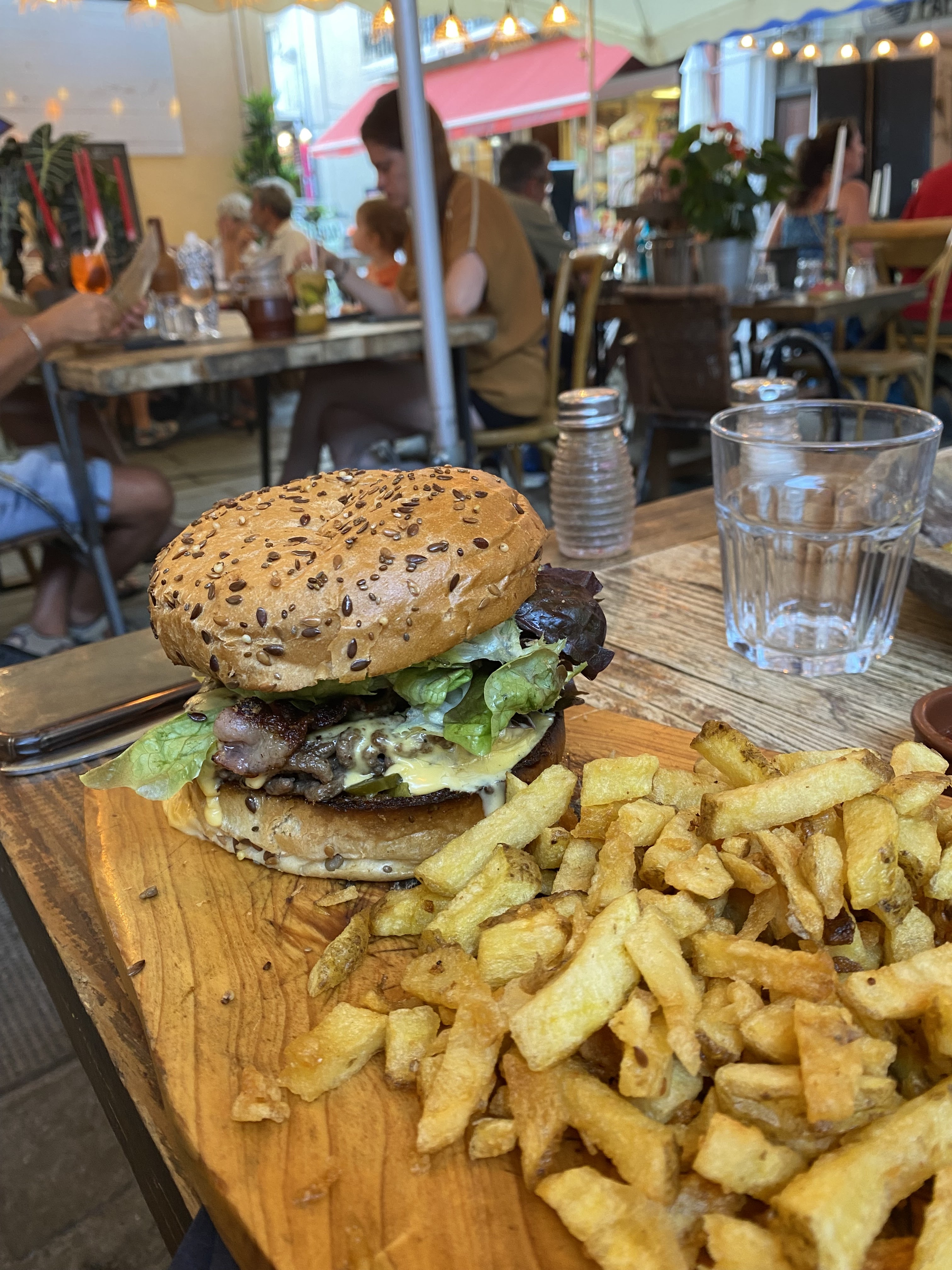 Cuisine très bonnes et bien garni. Mais le reste … venir tôt car se rempli vite, un chef de salle je suppose qui vous hurle à côté de votre table toute les 5 minutes pour appeler ses serveur à l’autre bout de la terrasse. Pizza servie et burger de ma compagne qui arrive 10 minutes après . Pas de communication être les serveurs qui vous apporte 3 fois le verre que vous avez commandée 1 seul fois. Et pour le paiement n’accepte que 2 chèque vacances par table , peut importe le montant mais que 2 chèques , autant vous dire que avec des chèques vacance de 10 euro vous payé pas grand chose avec , jamais vu un resto vous imposer le nombre de chèque vacances avec lesquelle vous avez le droit de payé ….