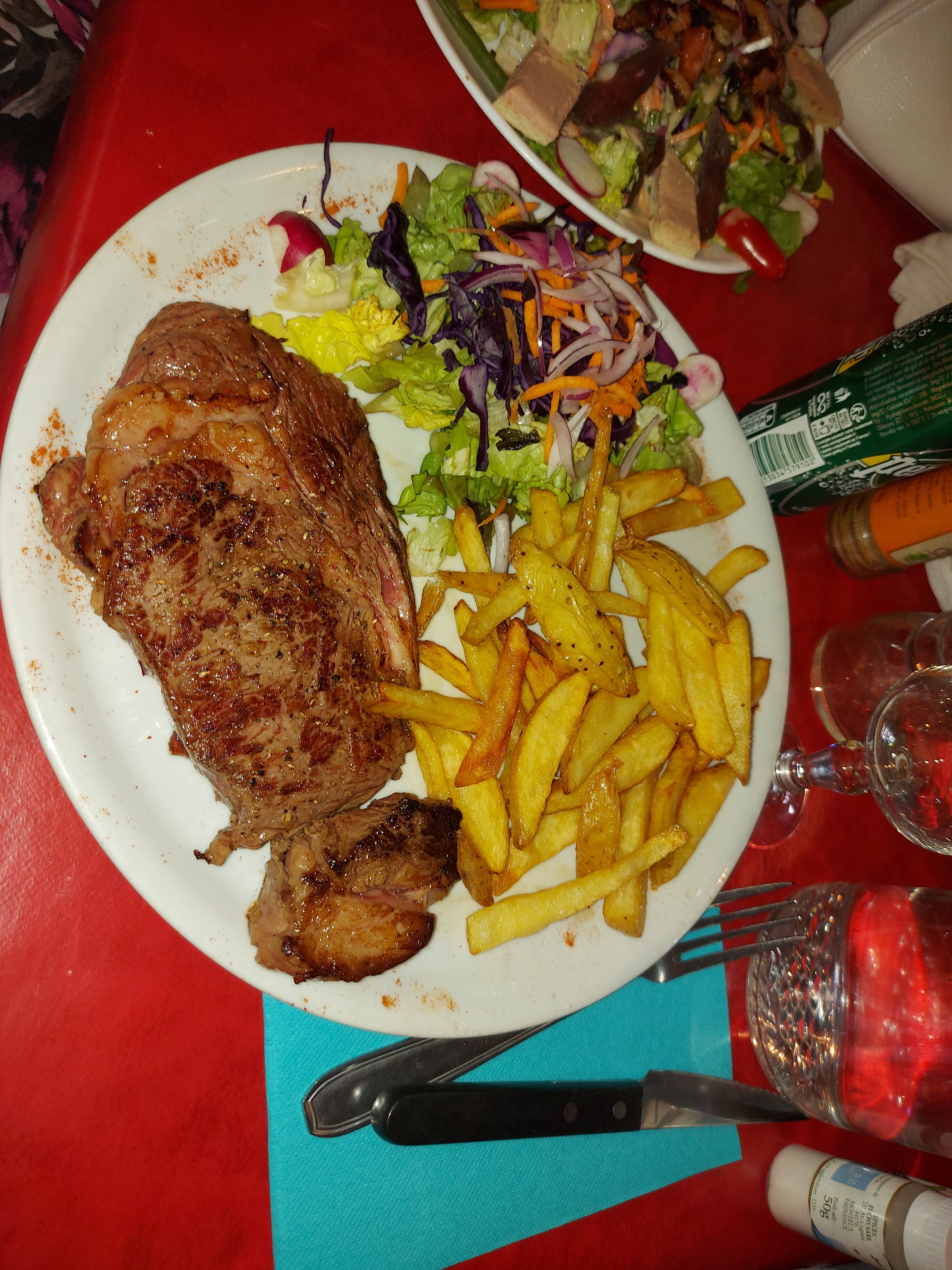 Une superbe découverte, frites maison cuites dans la graisse de bœuf hummmm, l'entrecôte une pure merveille🤩🤩🤩 quand au service et l'accueil du patron un sans faute 😻😻😻 petit rhum arrangé offert par le patron ainsi qu'une assiette de frites supplémentaires vraiment rien à dire... Je recommande vivement cet établissement 👍👍 Martine et ses sœurs...