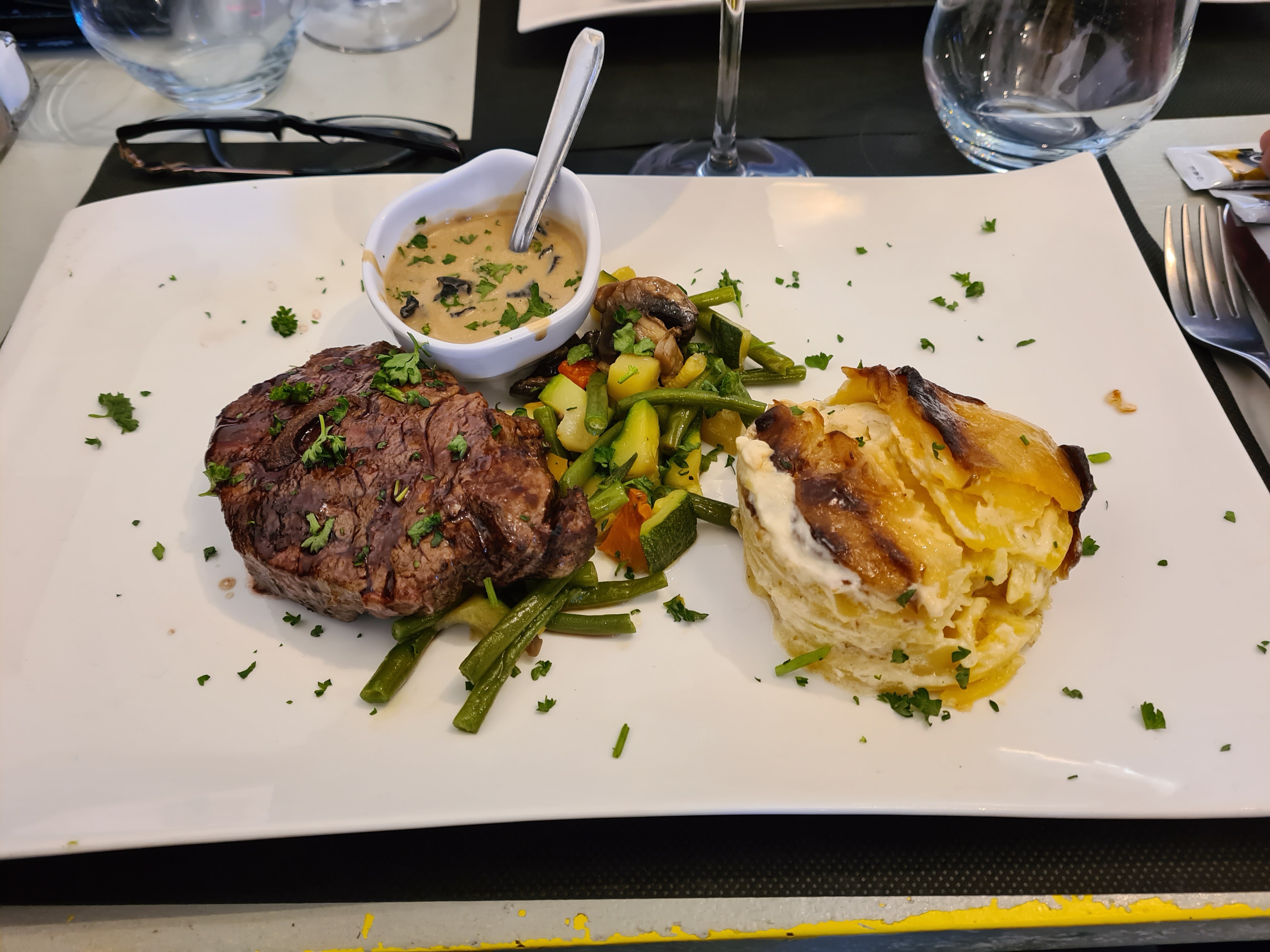 Excellent repas ce midi, cuisiné avec soin et raffinement, viande d'excellente qualité, gratin dauphinois velouté et crémeux, service au top ! je recommande vivement !