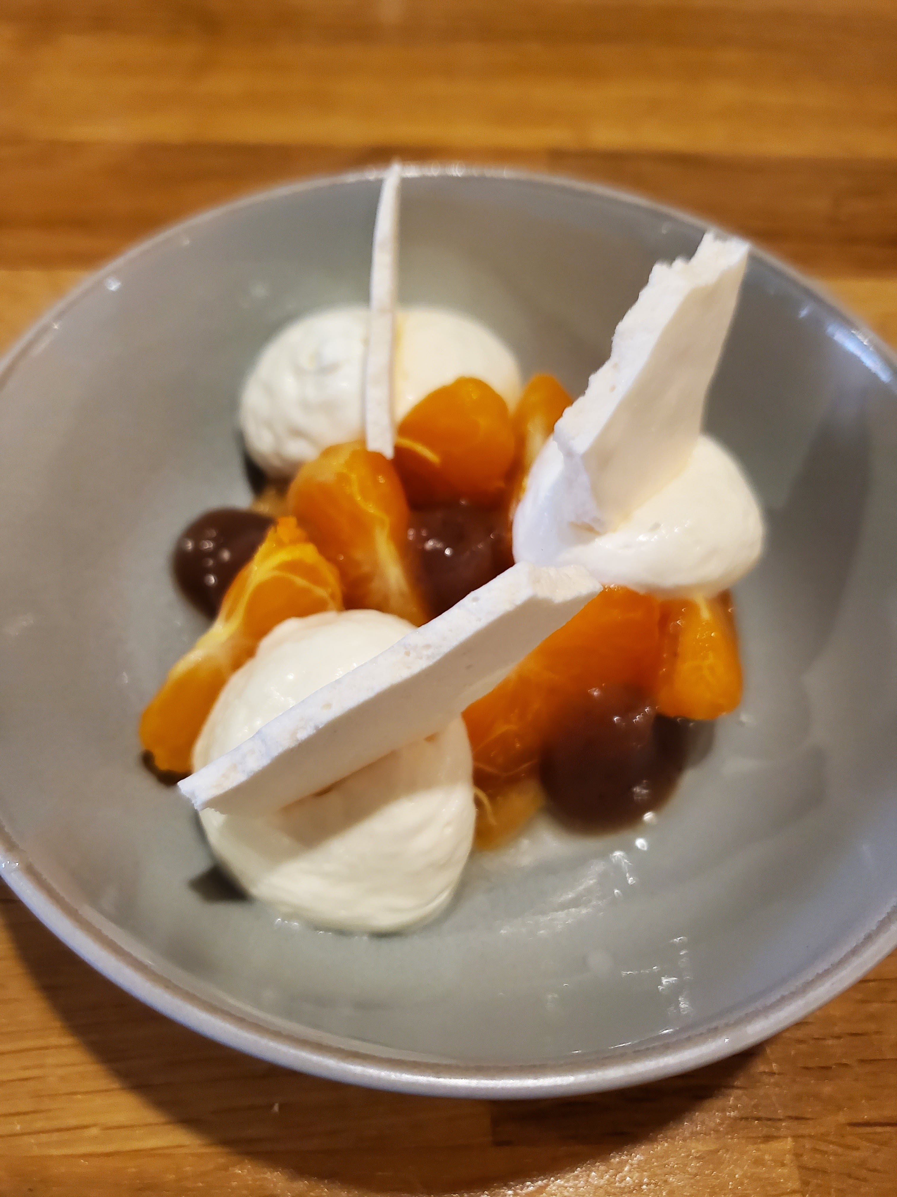 Au regard des notes exceptionnelles, je suis quand même un peu déçu au final. C'était bon, oui, mais c'était simple aussi, sans créativité particulière, sans trop de choix non plus, le tout pour un prix quand même assez élevé (100e pour plats, dessert et vin, à 2). Côté ambiance, la terrasse est minuscule et la route passe juste à côté. Bref, déçu. Ci joint photo de la pêche en dessert...une pêche, rien d'extraordinaire, mais bon quand même.