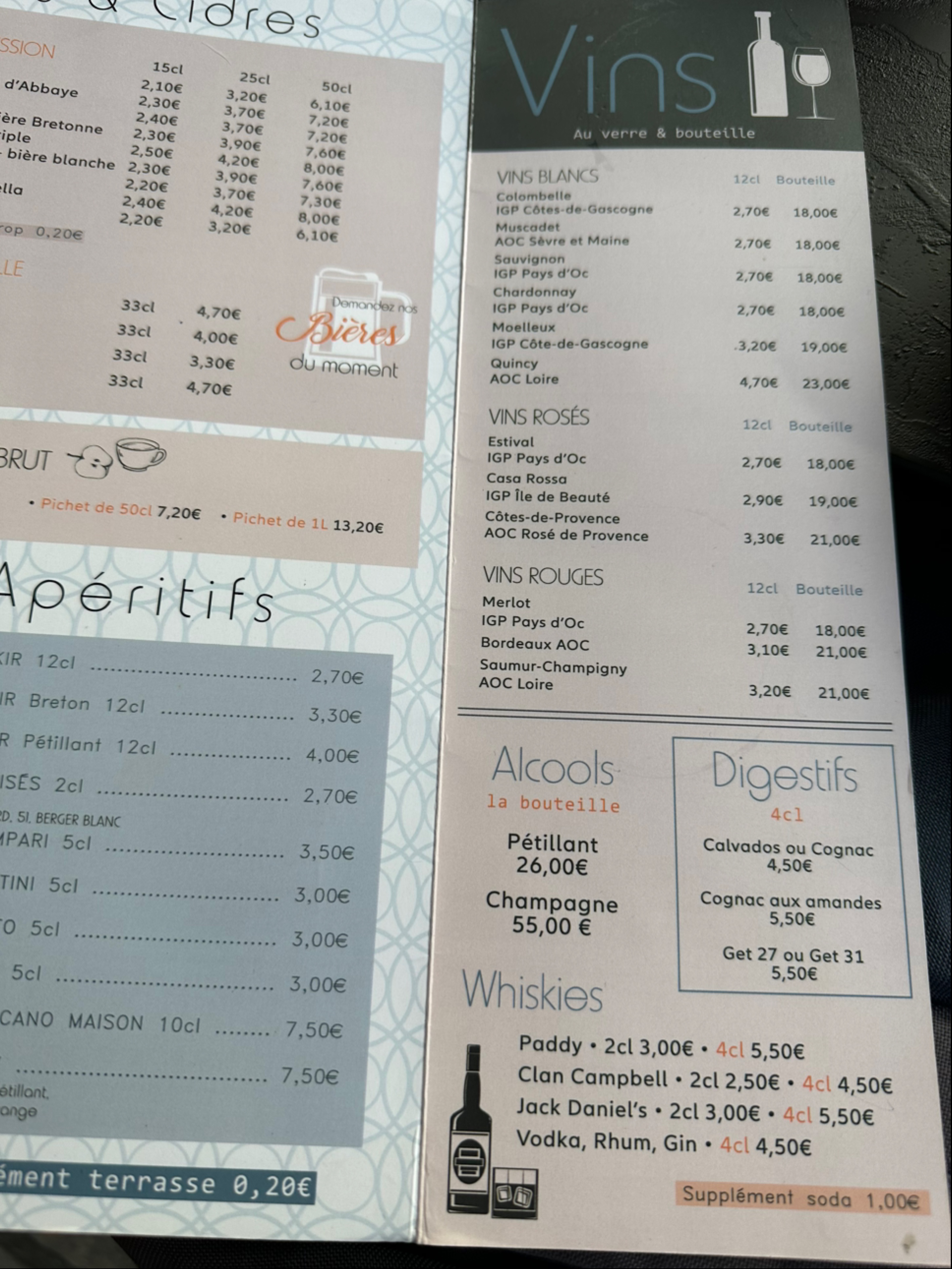 Un verre à la terrasse...🙁 Je demande une menthe à l'eau avec peu de menthe mais en grand format... Je paie deux fois le prix soit 4,40€pour de l'eau du robinet et un petit peu de menthe, servi dans un verre même pas propre.(obligée d'essuyer le bord du verre avec un mouchoir). Les personnes qui m'accompagnaient ont eu droit à la même chose. Sauf quelles n'avaient pas demandé à avoir moins de sirop, donc obligées de réclamer afin que leur boisson soit plus goûtée. Total. Un Monaco et trois sirops à l'eau pour 17,40€... C'est très cher payé ! Quant au service, bof...nous devions déranger à l'heure où les gens commencent à dîner... Pas bien... Vraiment pas bien...😡🙁